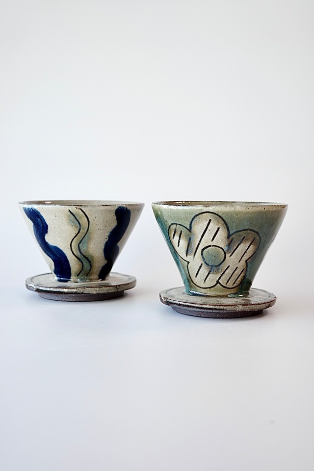 深貝工房さんのドリッパー。コーヒーを淹れるのが楽しくなりそうです。緑釉の花紋(A)と、コバルトと緑釉のキザ紋(B、C) のご用意です。 Size:約φ11×h8.7cm (ドリップ穴 φ約2.7cm) ※作品の色や質感は、PCやスマホの画面によって、実際とは異なって見える場合があります。予めご了承ください。 ※すべて作家による手作りの作品ですので、ひとつひとつ形や色合い、表情が異なります。釉薬のムラや垂れ、溜まり等が見られる場合がありますが、作品の特性であり、景色、味としてお楽しみください。 【深貝工房/深貝公拓 (沖縄 読谷村)】 青森県出身。沖縄県を代表する陶芸家の一人である山田真萬氏の下で6年修行した後、2018年に独立。現在は読谷村に工房を構える。ダイナミックな筆遣いの絵付けが人気だが、潔くシンプルなトーンの作品も魅力的。