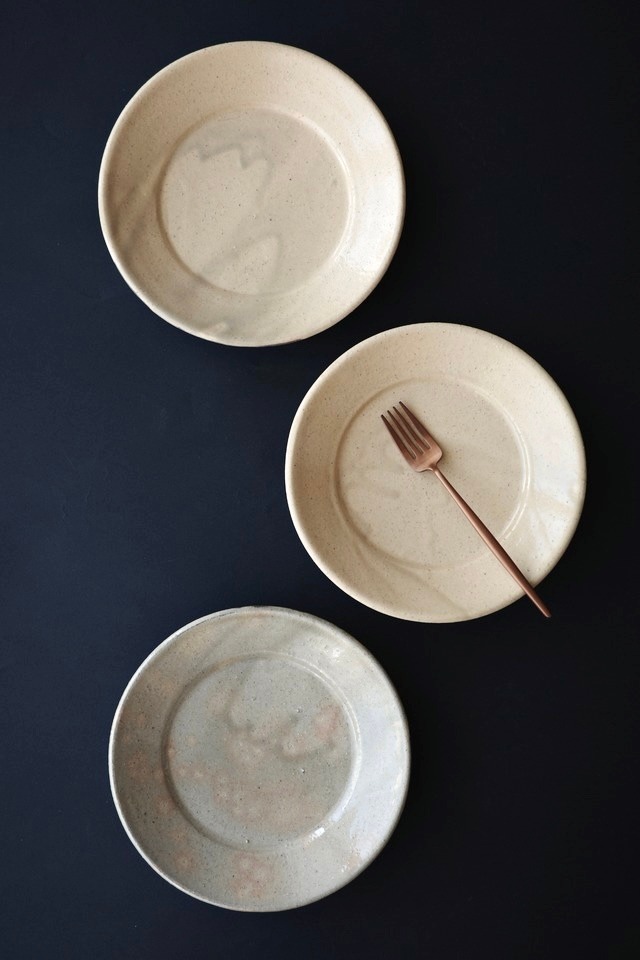 深貝工房さんの登り6寸リム皿。登り窯で焚かれたお品です。こちらは化粧土のタイプ。薪火のパワーで釉薬がダイナミックに流れ、印象的な景色が生まれています。 登り窯のお品はなかなか入荷しませんので、この機会にぜひどうぞ。ABC、3種類からお選びいただけます。 サイズ: A: φ約19.7×h3.4cm B: φ約19.3×h3.5cm C: φ約19.1×h3.5cm ※作品の色や質感は、PCやスマホの画面によって、実際とは異なって見える場合があります。予めご了承ください。 ※すべて作家による手作りの作品ですので、ひとつひとつ形や色合い、表情が異なります。釉薬のムラや垂れ、溜まり等が見られる場合がありますが、作品の特性であり、景色、味としてお楽しみください。 【深貝工房/深貝公拓 (沖縄 読谷村)】 青森県出身。沖縄県を代表する陶芸家の一人である山田真萬氏の下で6年修行した後、2018年に独立。現在は読谷村に工房を構える。ダイナミックな筆遣いの絵付けが人気だが、潔くシンプルなトーンの作品も魅力的。