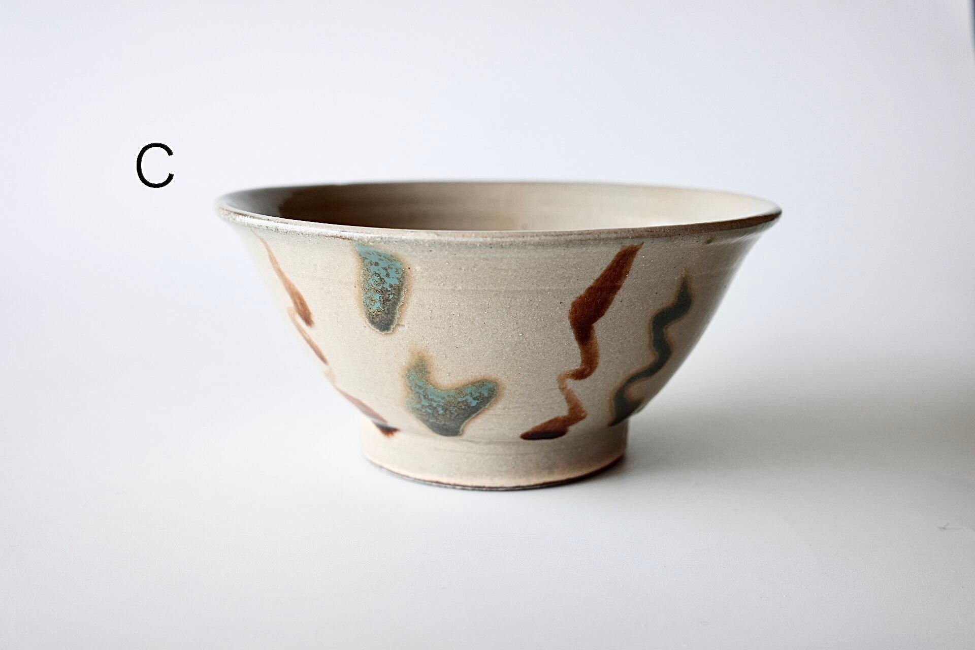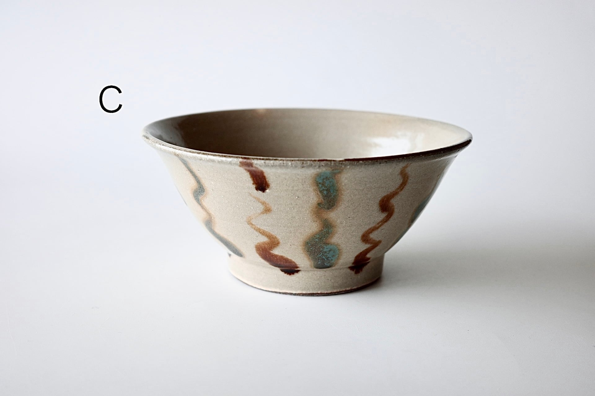 こちらは、緑釉と飴釉の波線が描かれたお品。ABC、3種類からお選びいただけます。