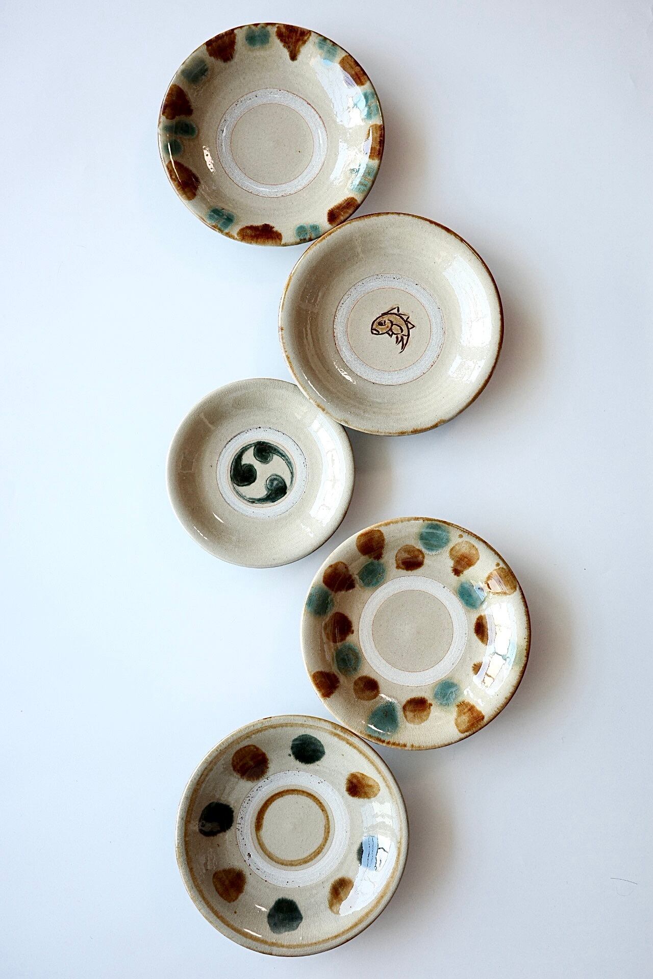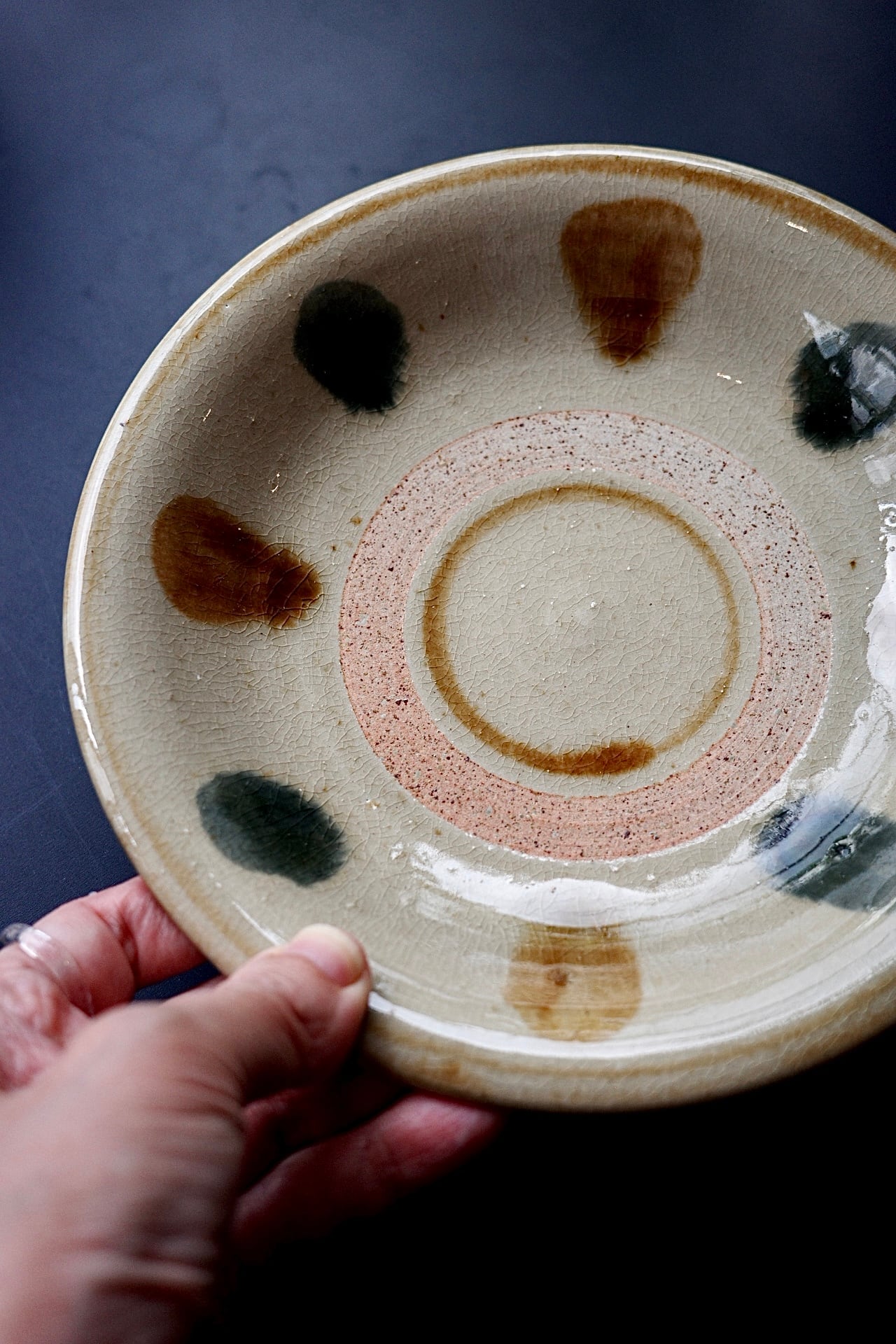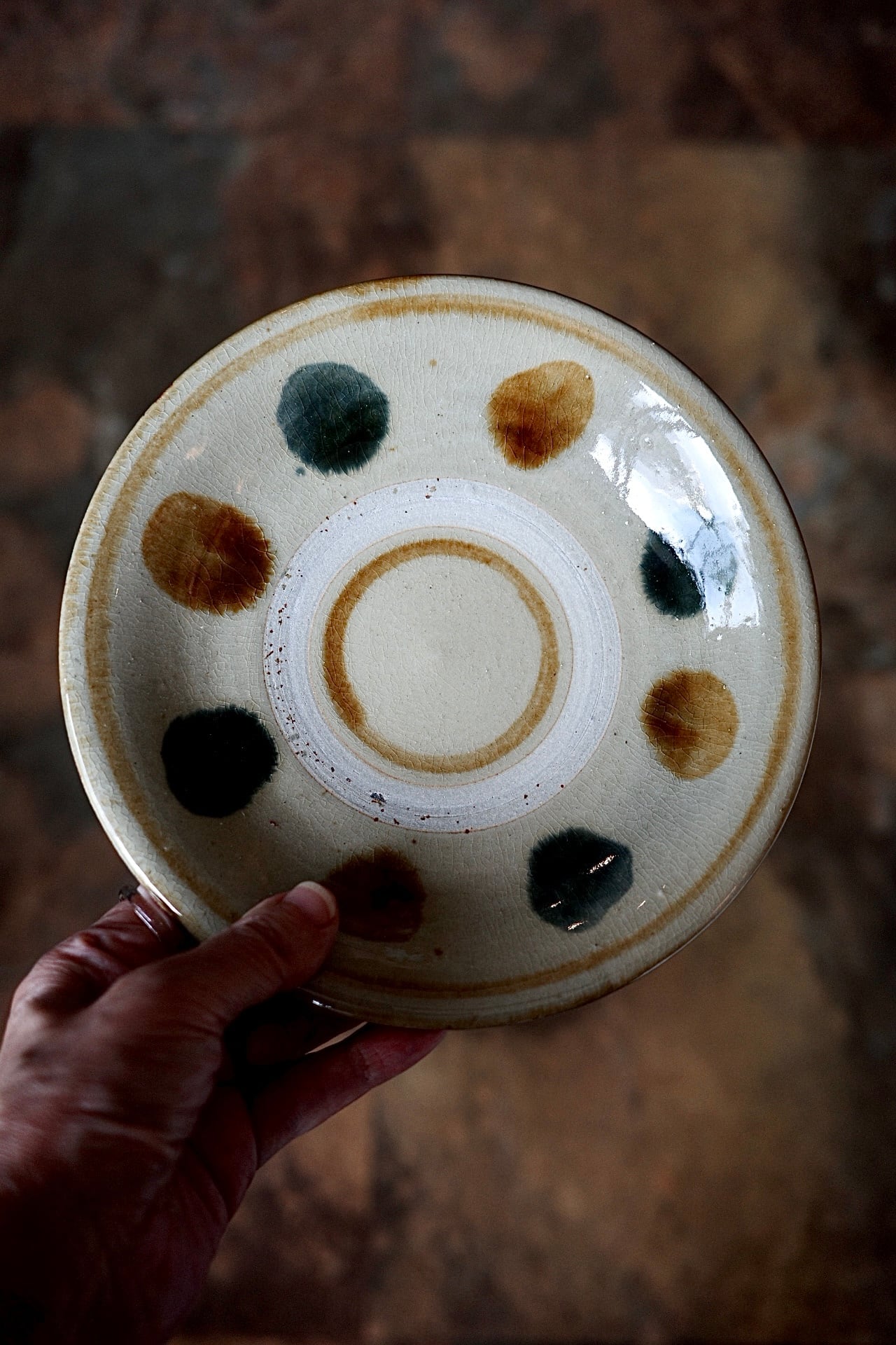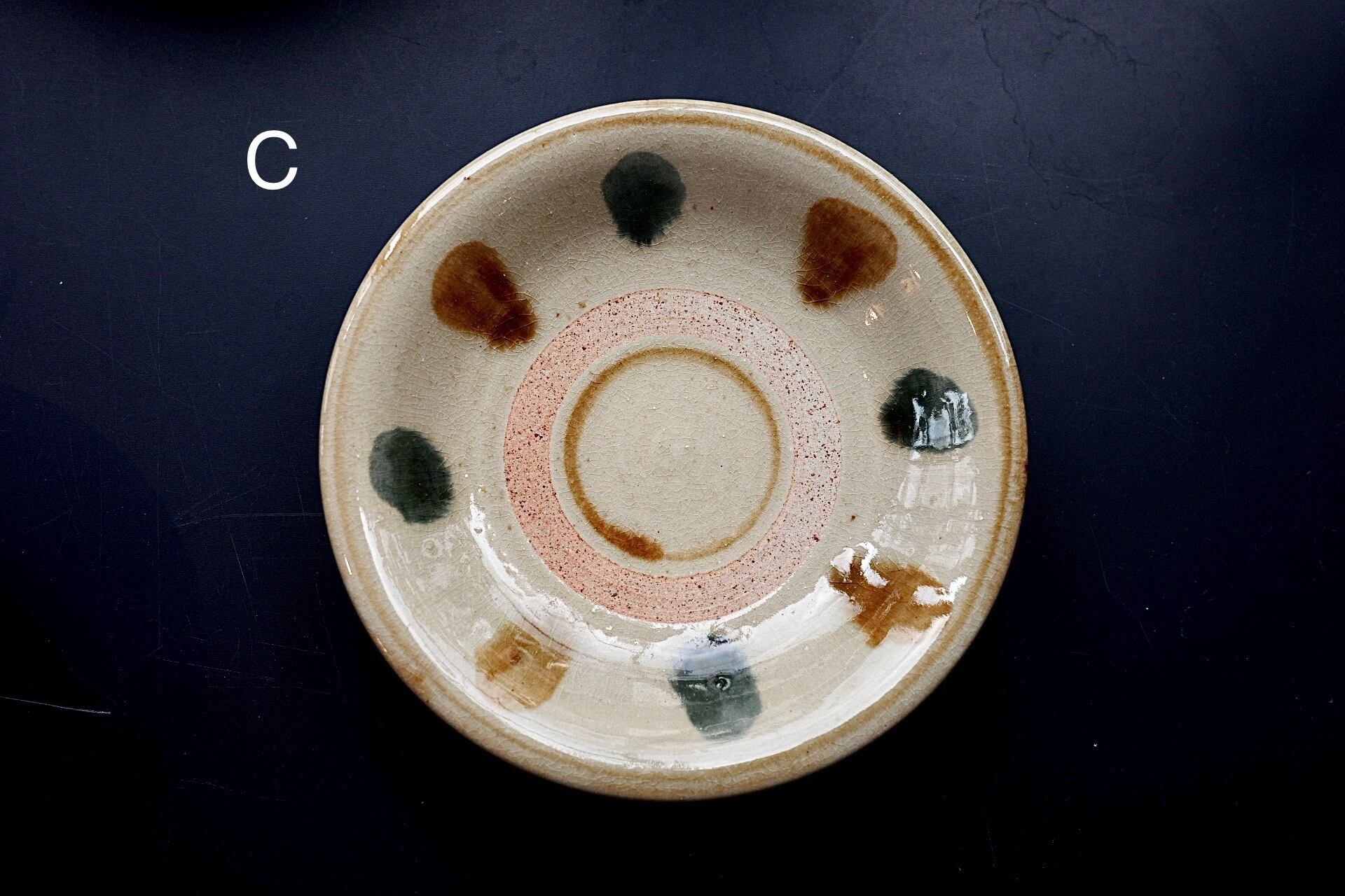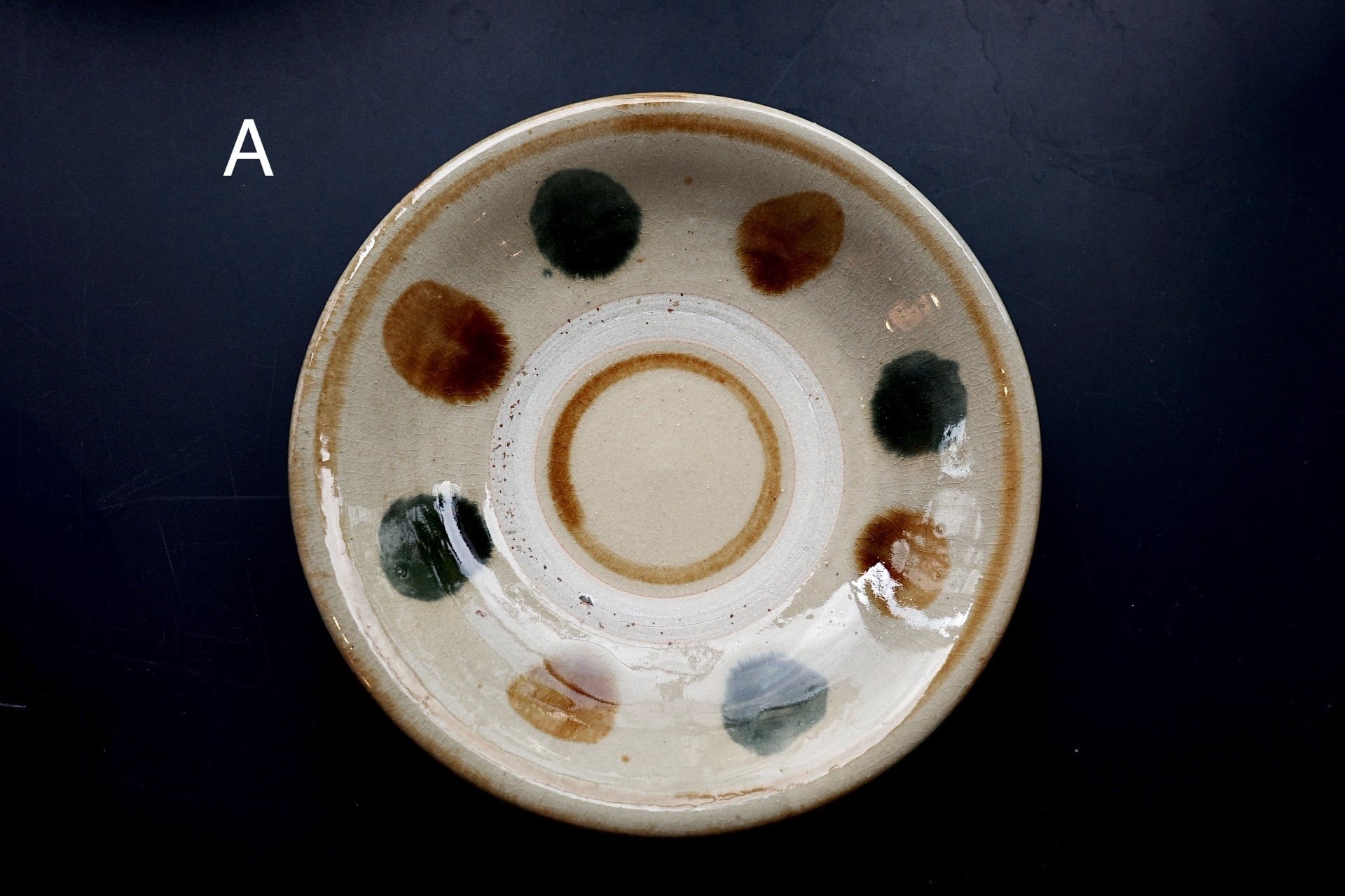 松田健悟さんの6寸皿。呉須と飴釉の点打ちの、やちむんらしい素朴な紋様が人気のお品です。ABC、3種類からお選びいただけます。