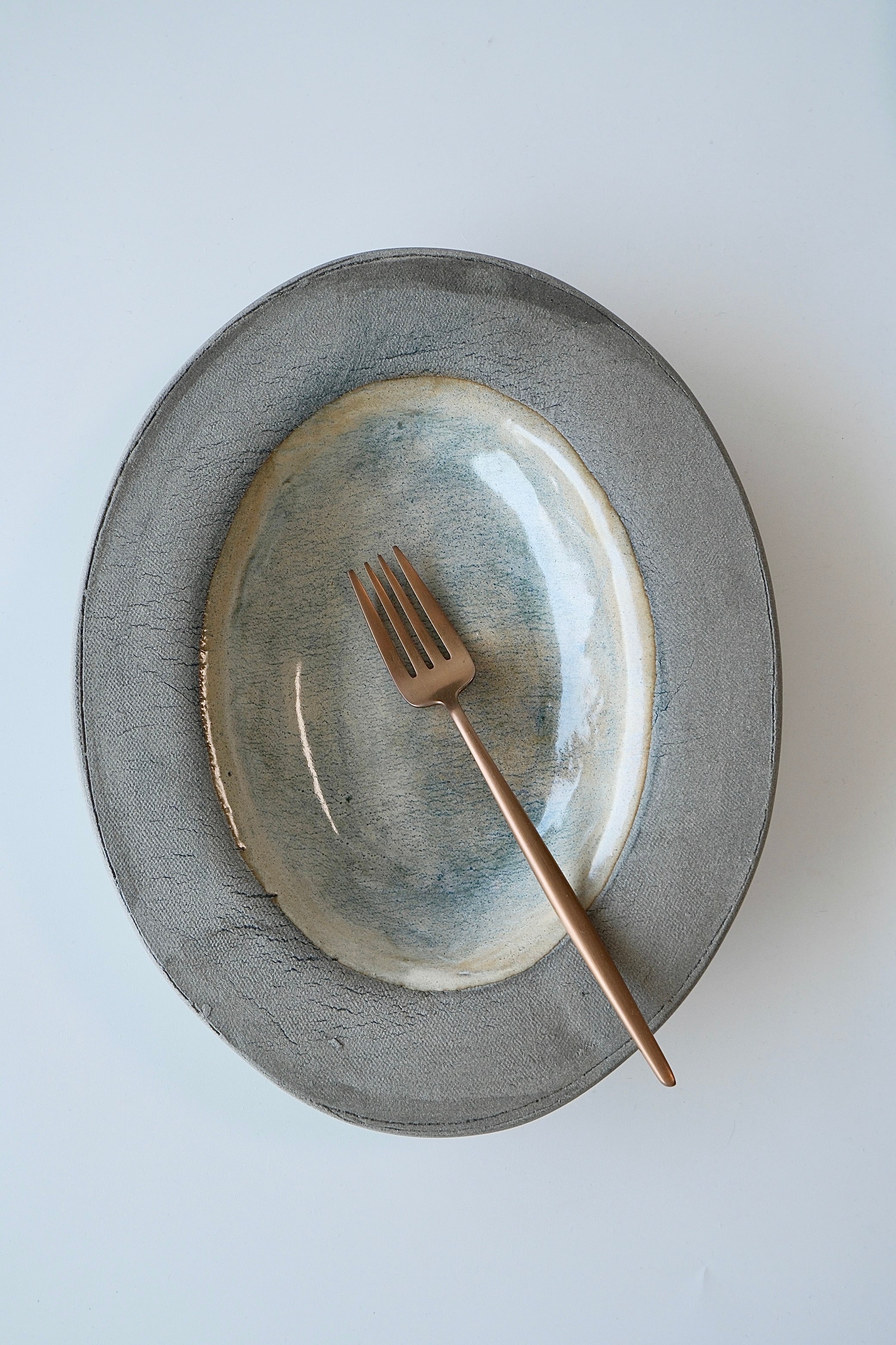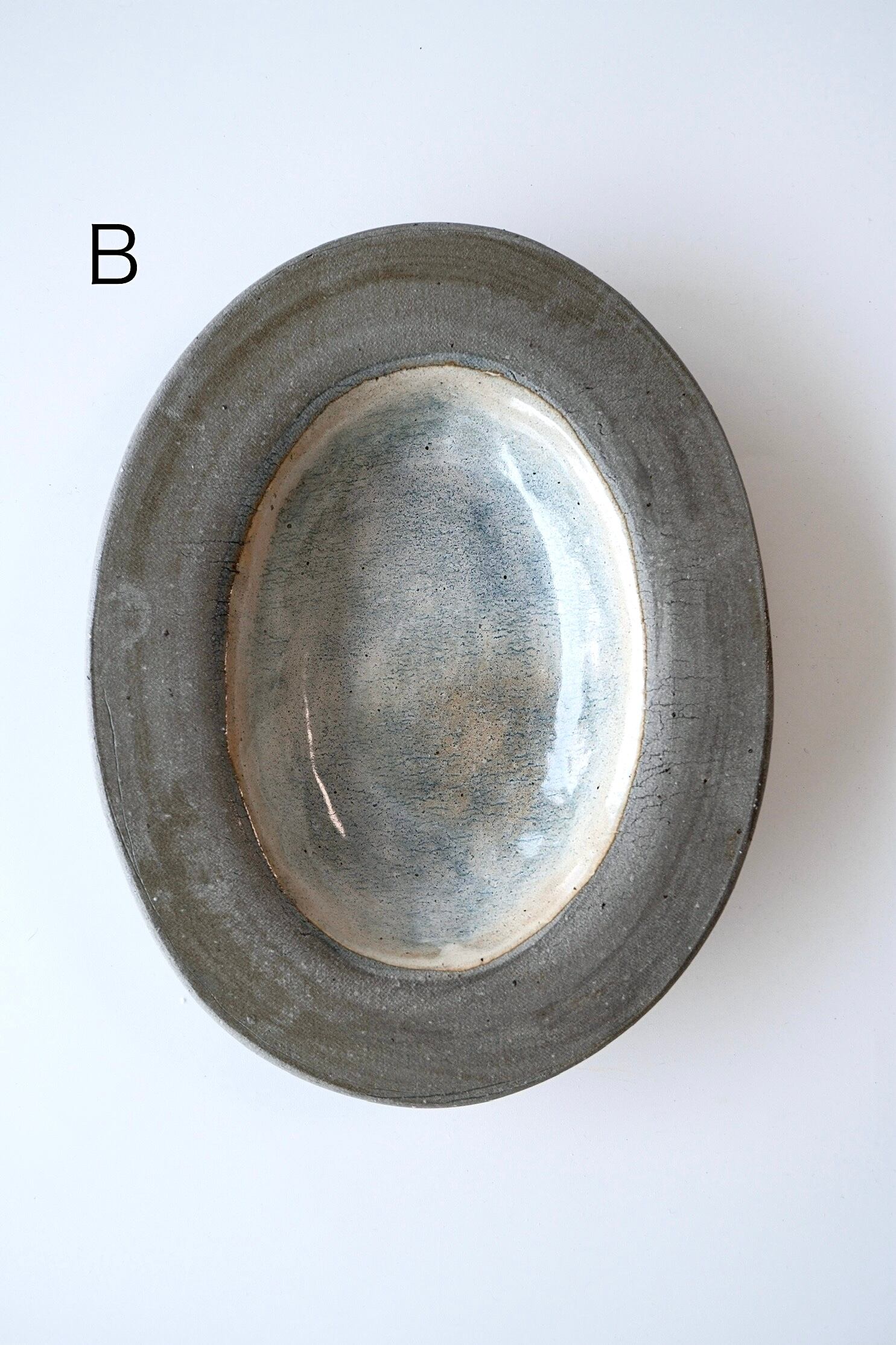 まるか陶工房さんのオーバル皿S。グレー御影土を使った使いやすいサイズ感のお品です。グレーのリム部分の個性的な表情も魅力。ABC、3種類からお選びいただけます。