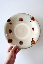 松田米司さんの8寸皿。余白が楽しめる大きさの高台付き丸皿は、ディナープレートとしても活躍します。こちらは飴釉と緑釉で描かれた点打ちのお品。小さな緑釉の点がアクセントになっています。