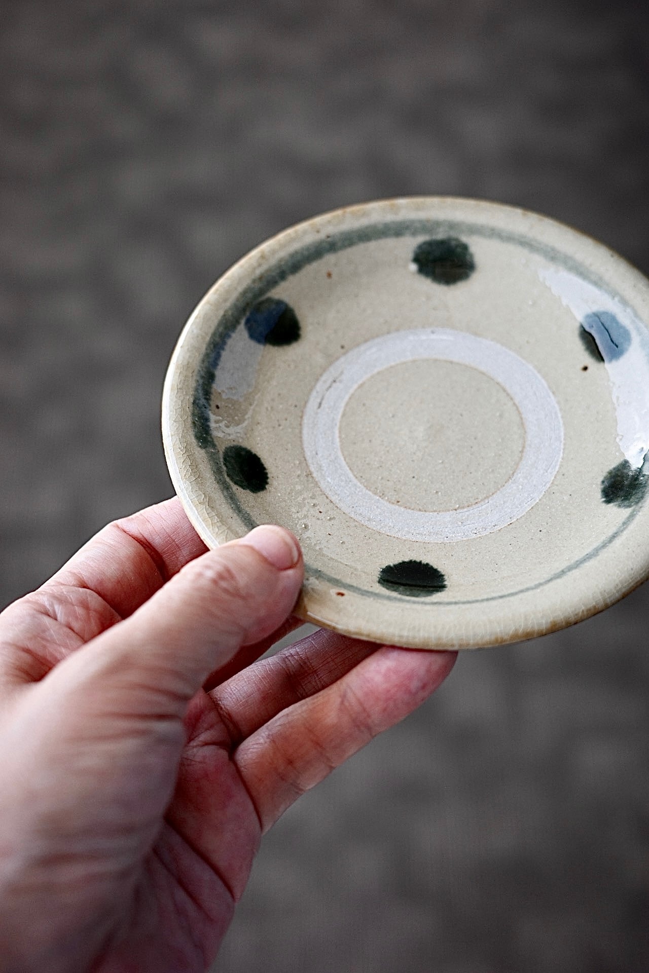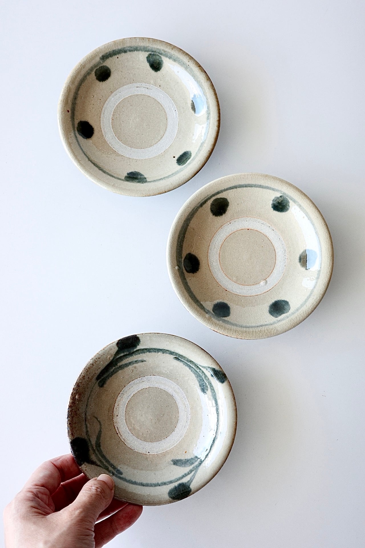 松田米司さんの4寸皿。取り皿など、何枚あっても良いサイズ。すべて呉須で絵付けが施されています。ABC、3種類からお選びいただけます。