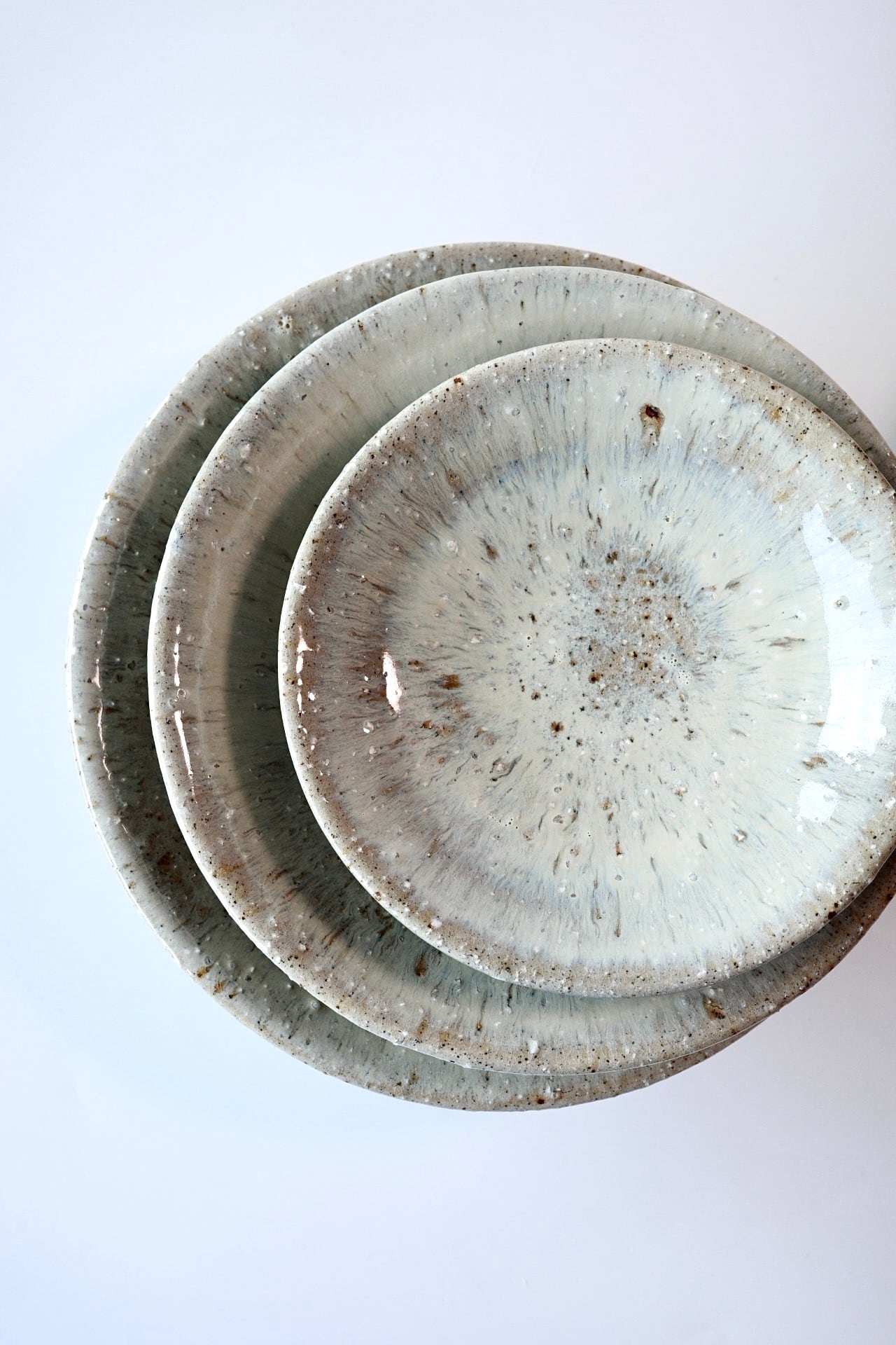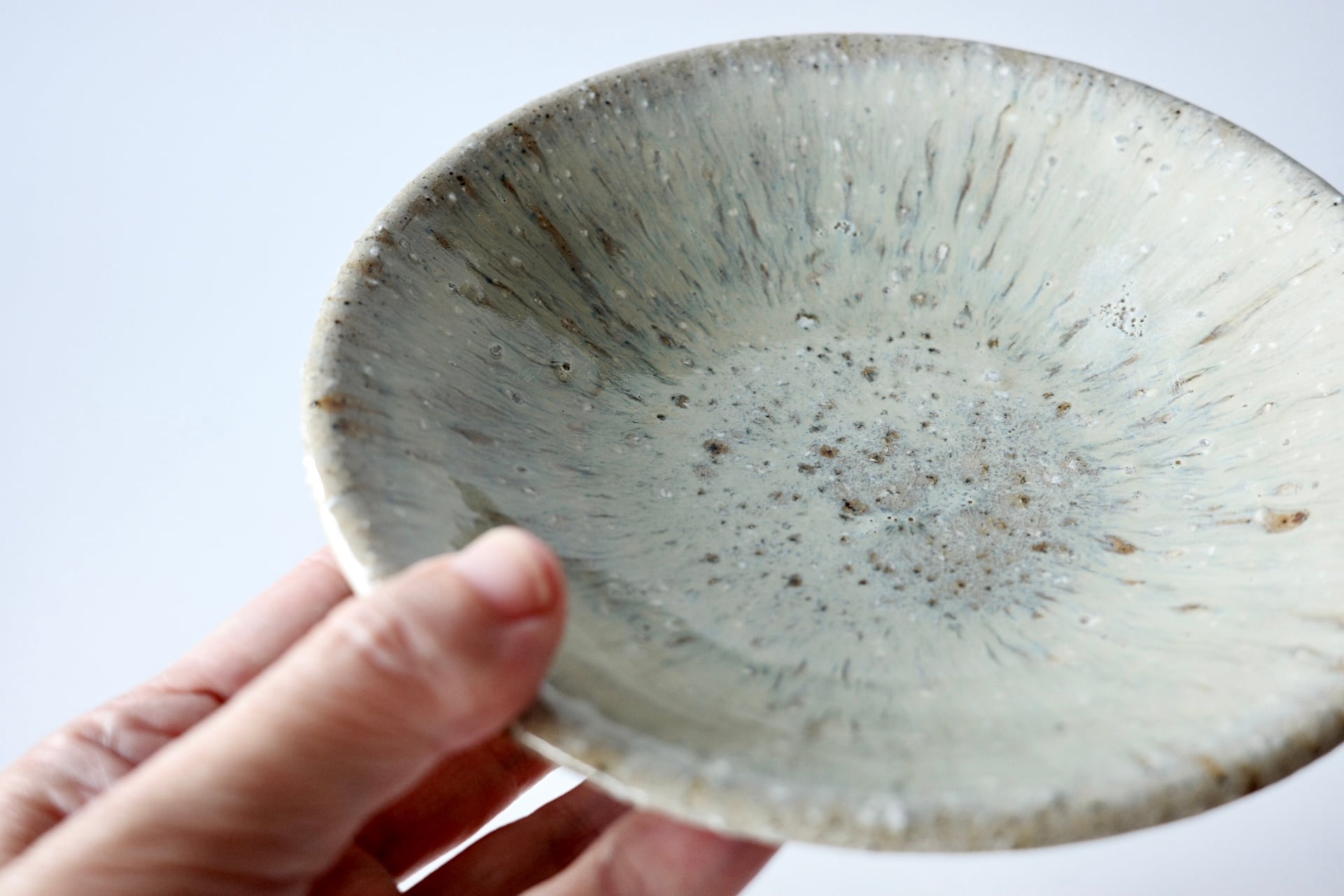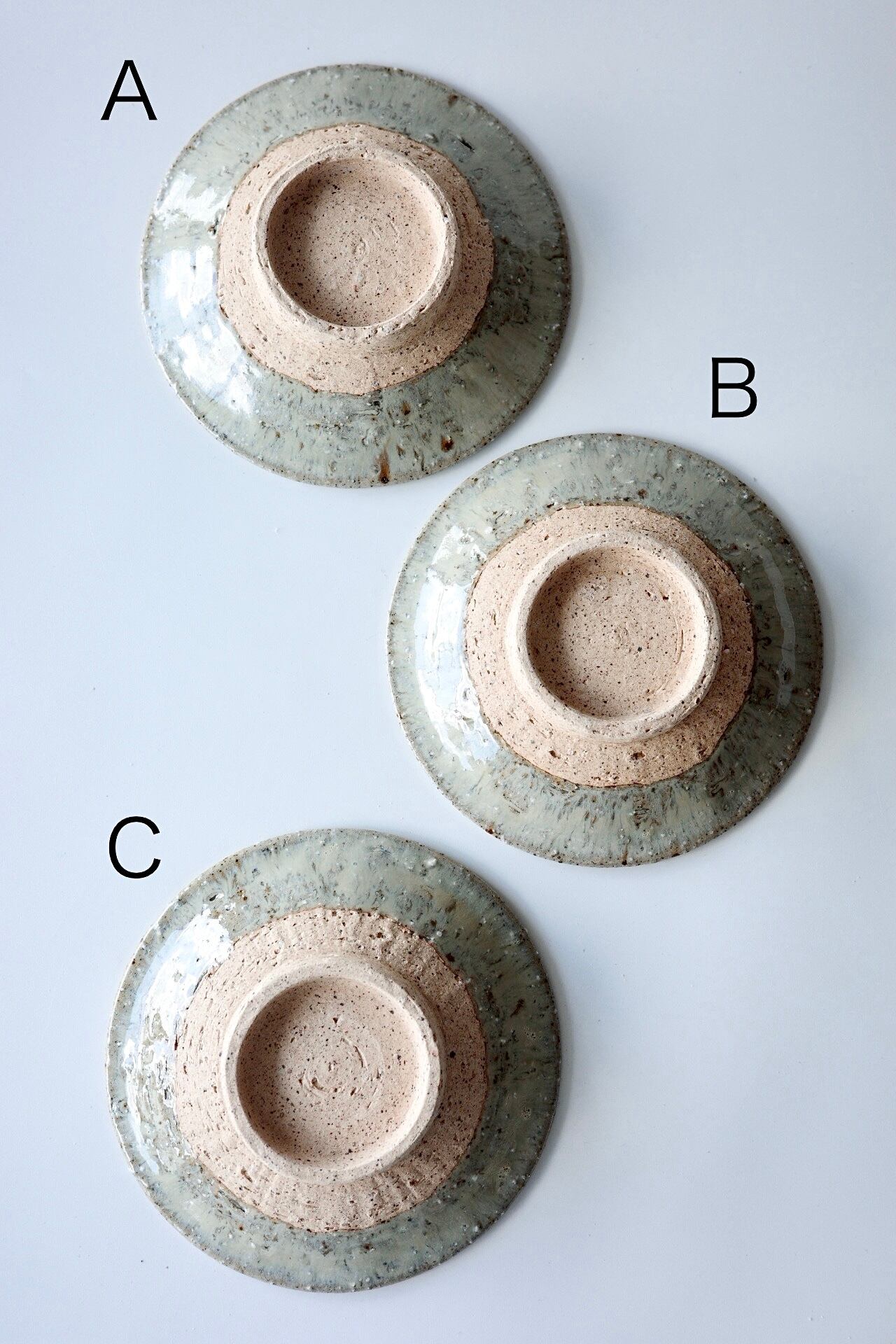 関真奈穂さんの返し皿 5寸。縁部分が反った形のプレーンな丸皿です。荒い土の表情と、灰釉の窯変による景色が美しいお品。グリーンとブルーがミックスされたような透明感のある色味です。5寸サイズは、ABC、3種類からお選びいただけます。