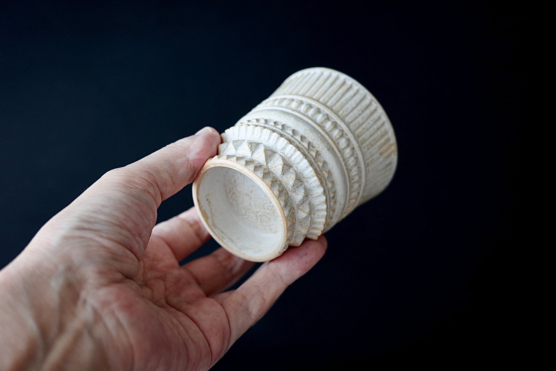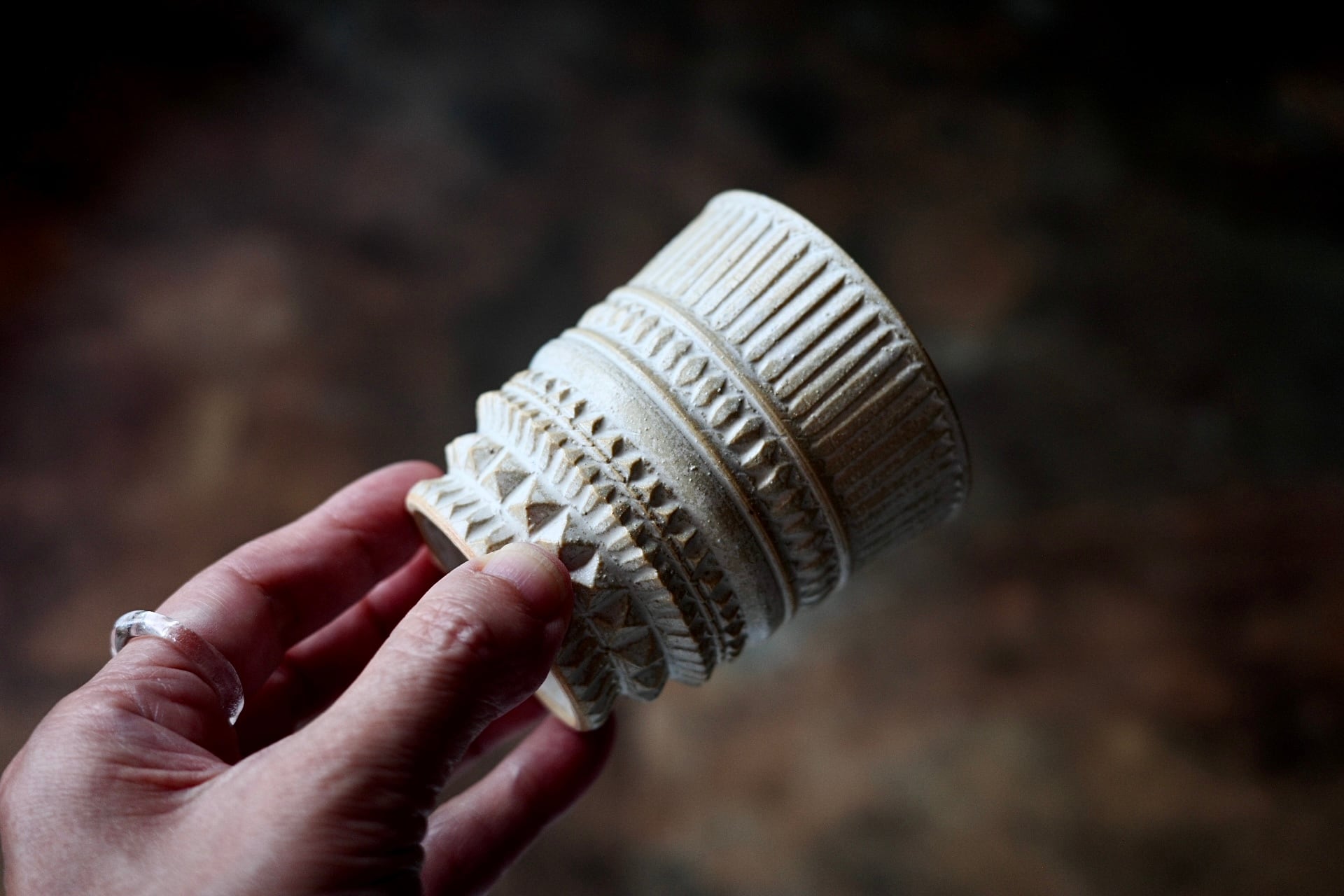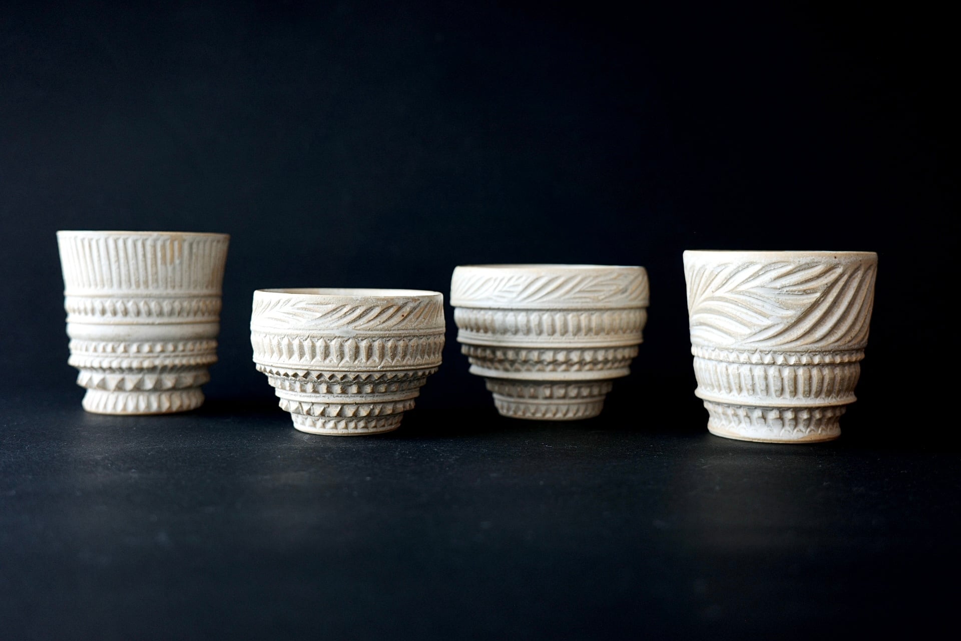 Nantan Pottery 新里竜子さんのスタッズぐい呑。裏面まで隙間なく美しいしのぎ模様とスタッズが彫られています。少し大きめサイズなので、フリーカップとしても。ABCD、4種類からお選びいただけます。