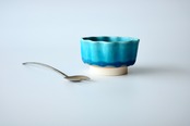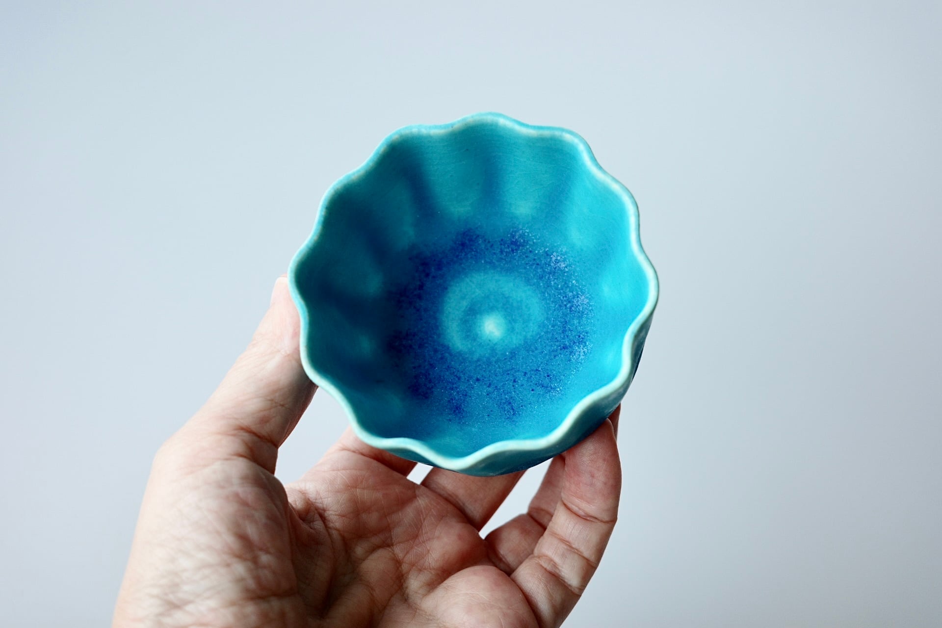 大嶺工房さんの青釉小鉢。沖縄の海を思わせるブルーが美しく、釉薬の垂れも見どころです。別売りの高台皿に合わせてセット使いもおすすめです。