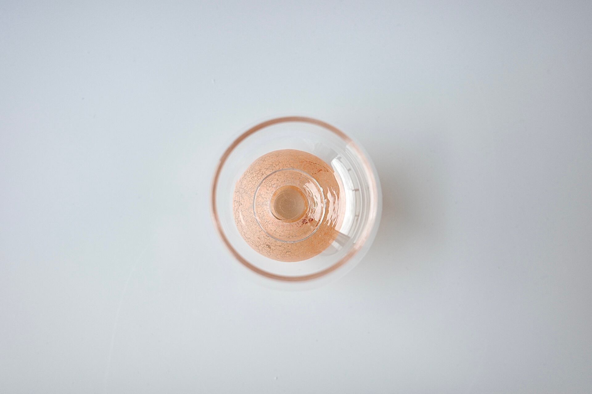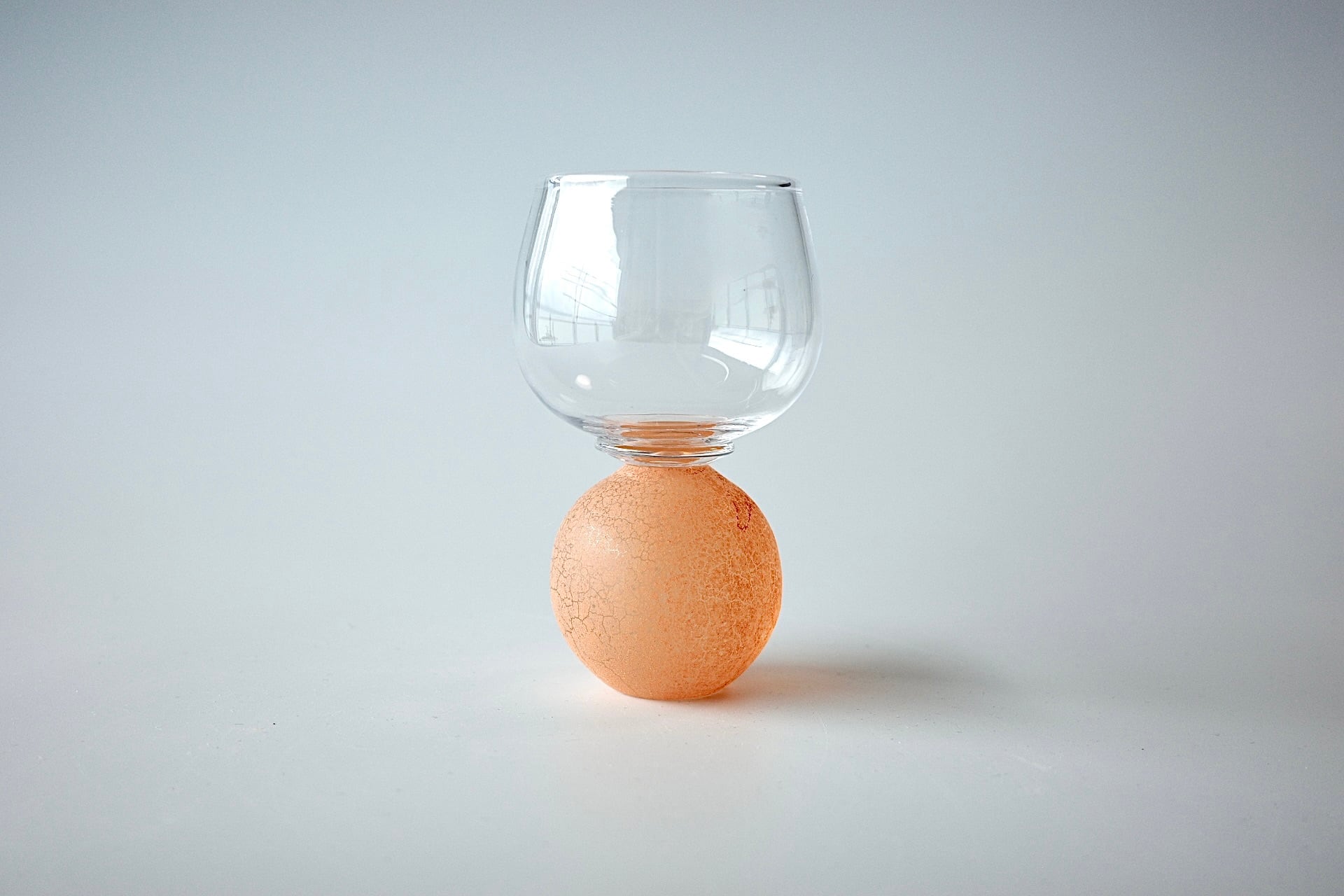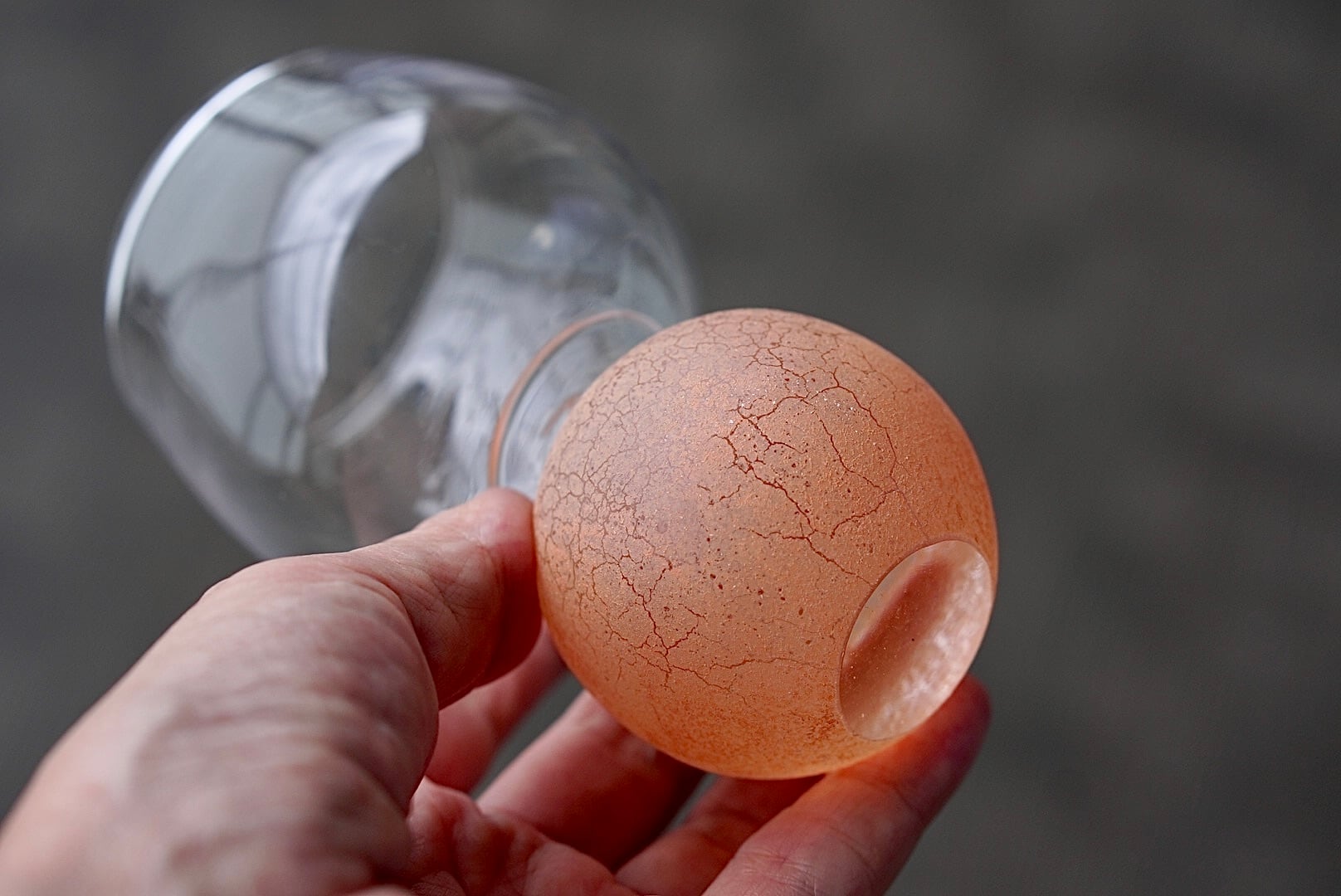 Glass Studio 三日月さんのToudoの盃。土台となる硝子の球が、2色の陶土を纏っています。ヒビ割れ模様があったり、光の窓があったり。ゆらぎの表情に心も揺さぶられます。