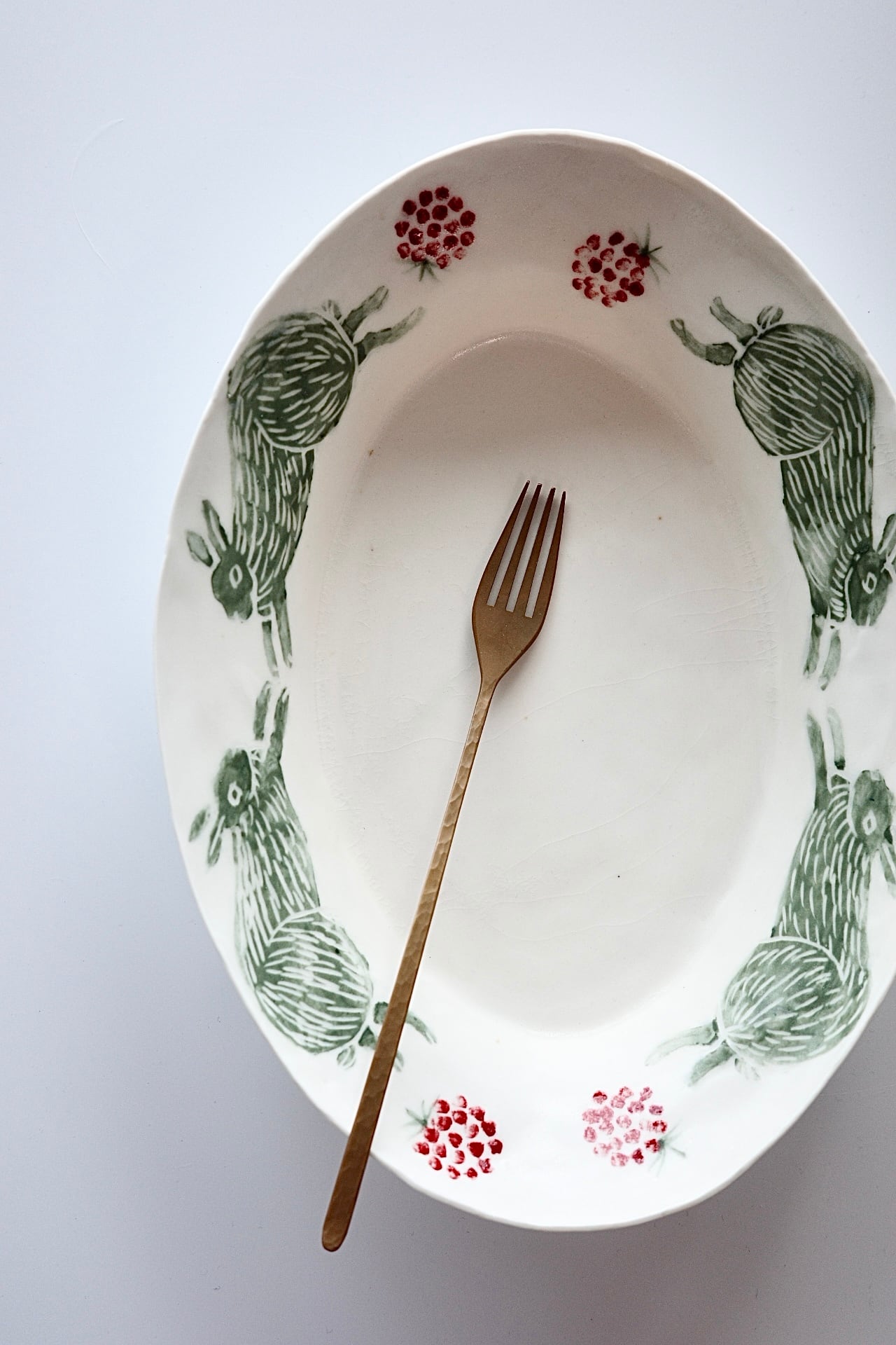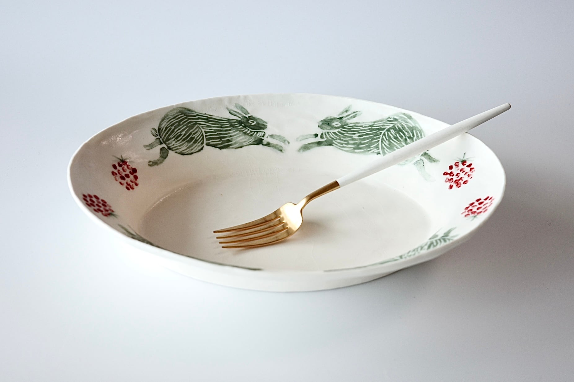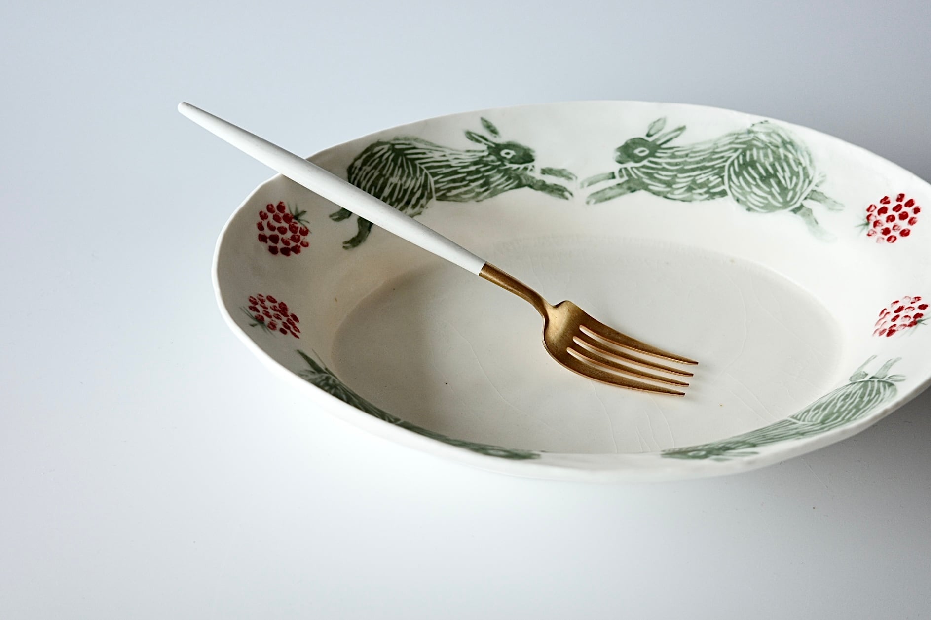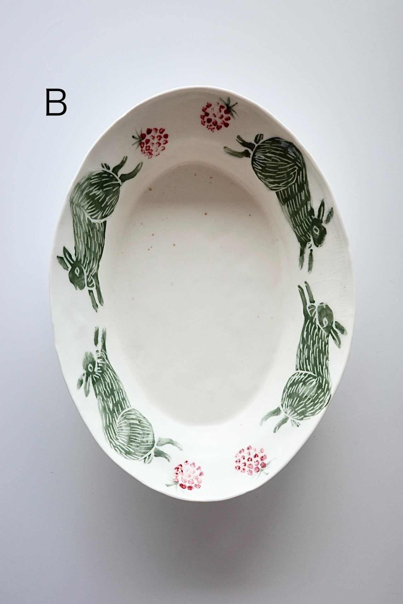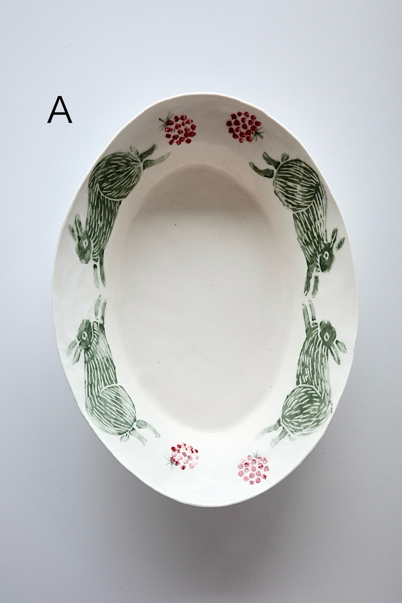 中村かおりさんのうさぎ柄のオーバル深皿。うさぎとラズベリーが描かれた可愛らしいプレートです。パスタやサラダなど、様々に使えます。AB、2種類からお選びいただけます。
