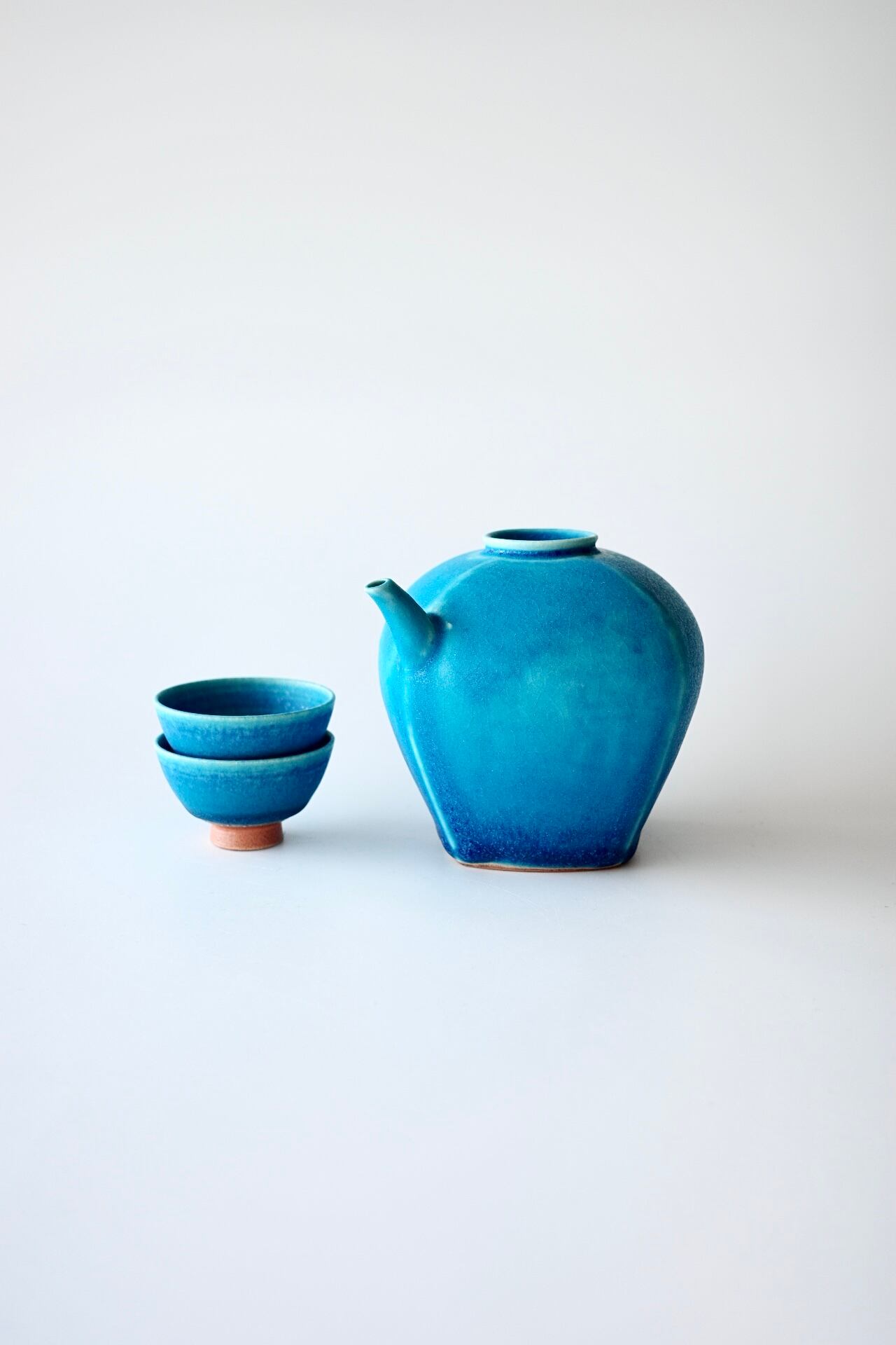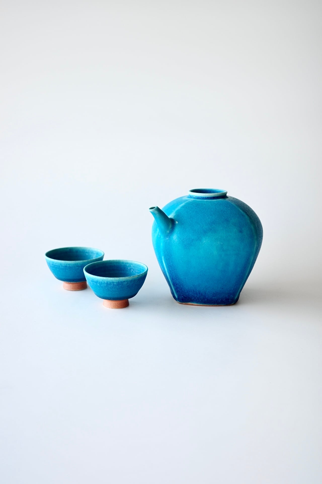 大嶺工房さんの青釉酒器セット。沖縄の海を思わせるペルシャブルーの注器と、小さなお猪口がふたつセットになっています。注器は、上部に膨らみをもたせた美しい形状。飾っておくだけでも大変素敵なお品です。