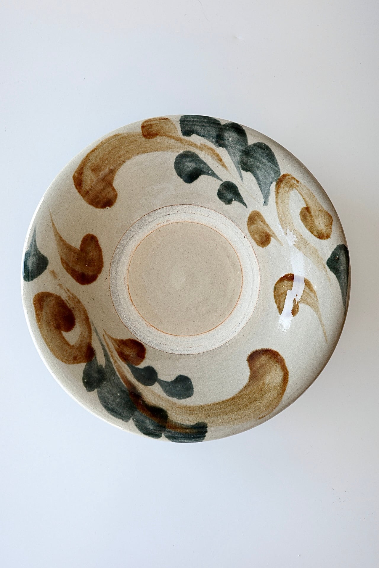 松田米司さんの8寸皿。余白が楽しめる大きさの高台付き丸皿は、ディナープレートとしても活躍します。こちらは飴釉と呉須で描かれた唐草紋のお品。ダイナミックな筆致でありながら、ふわりと優しい色味が特徴です。