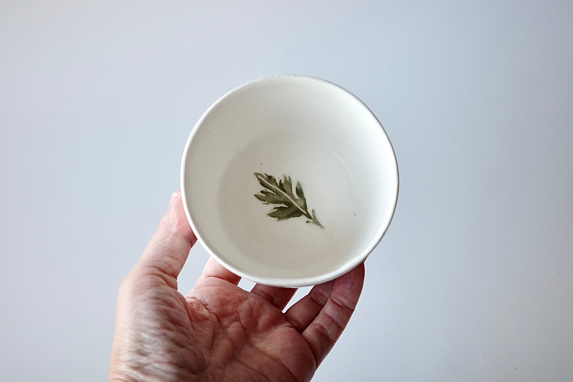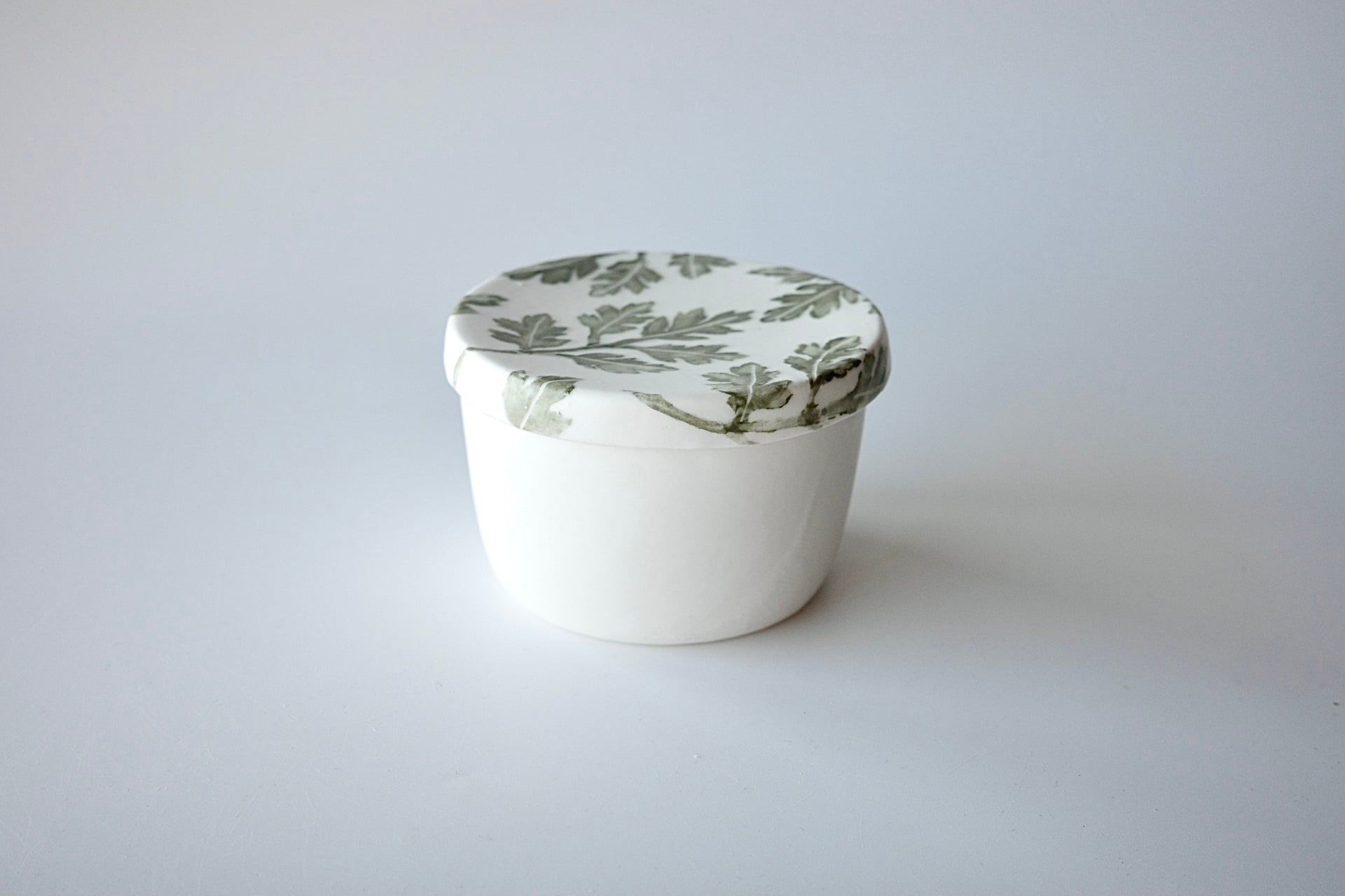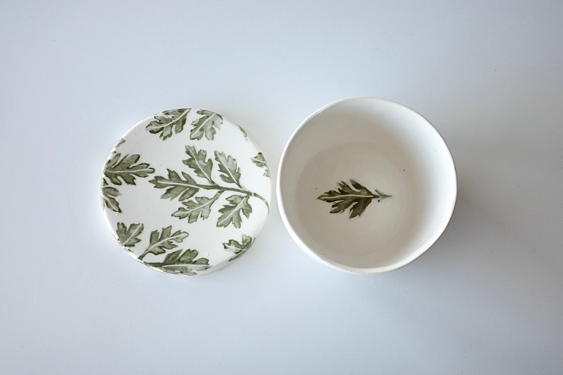 中村かおりさんのよもぎ柄の丸箱です。蓋と本体の内側底部分によもぎが描かれています。底部分のよもぎの葉一枚がアクセント。贈りものにもぴったりです。