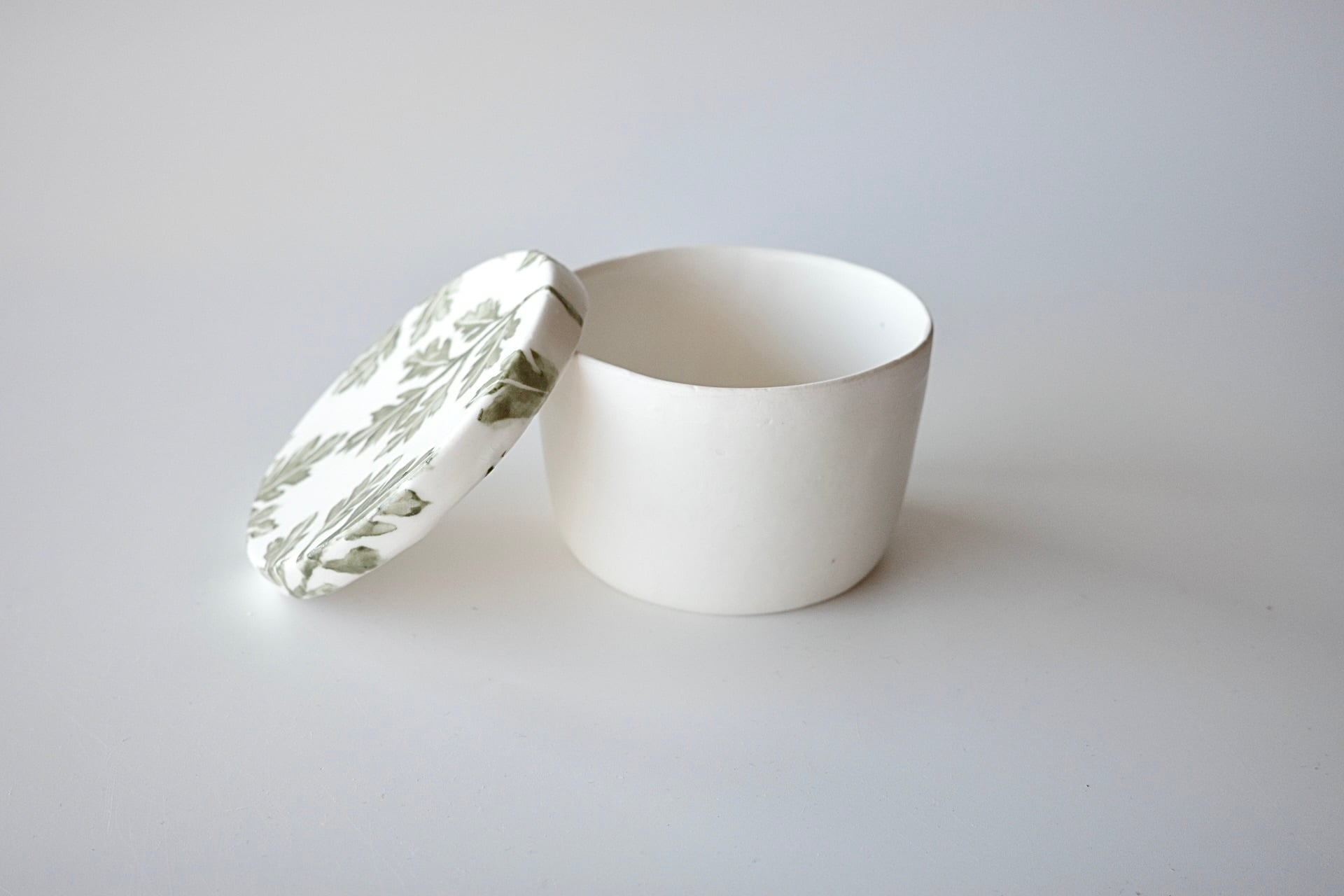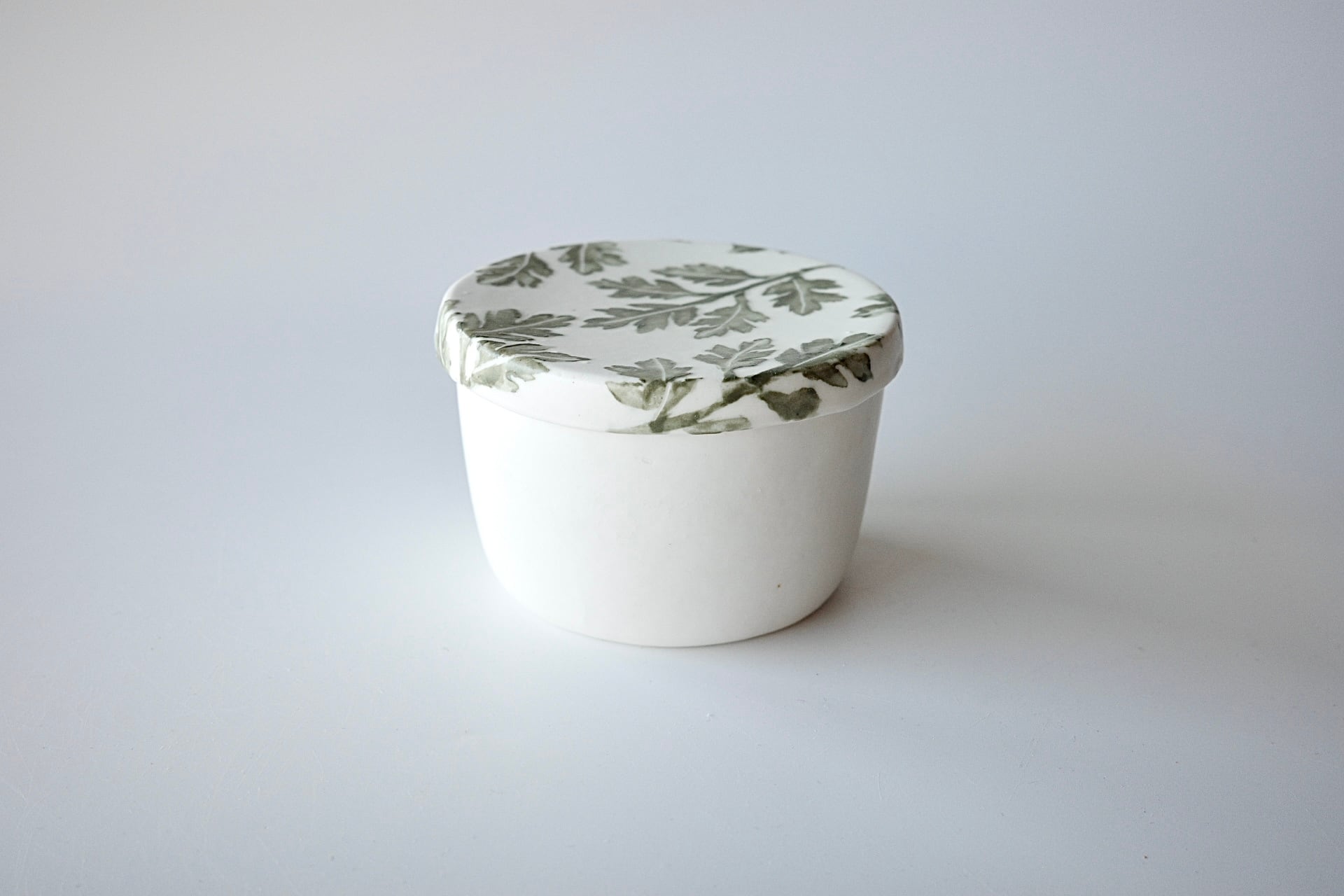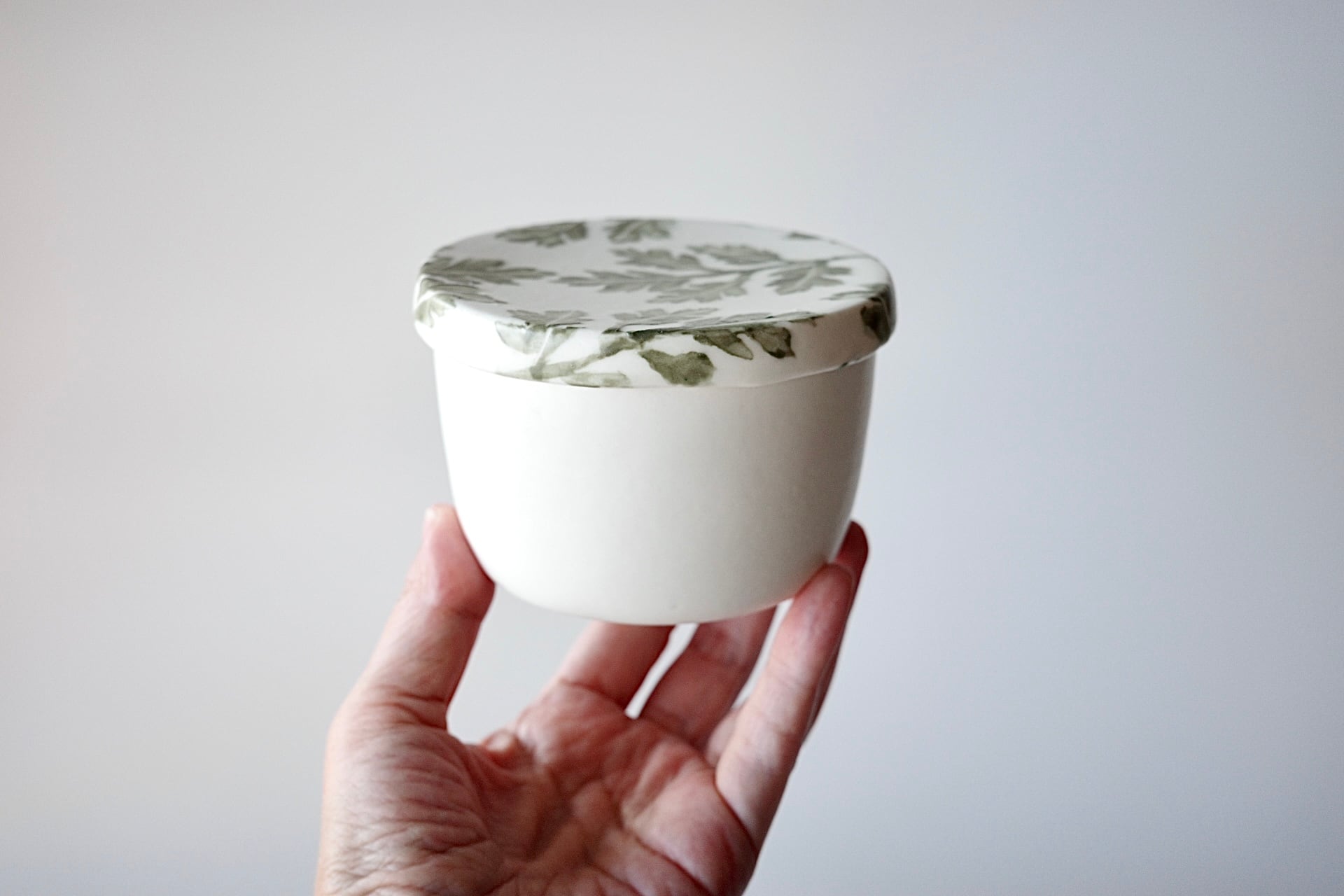 中村かおりさんのよもぎ柄の丸箱です。蓋と本体の内側底部分によもぎが描かれています。底部分のよもぎの葉一枚がアクセント。贈りものにもぴったりです。