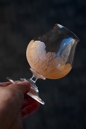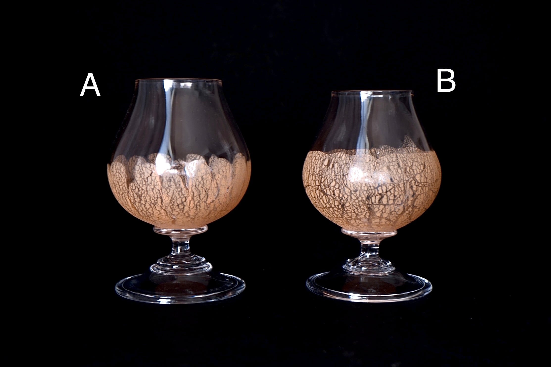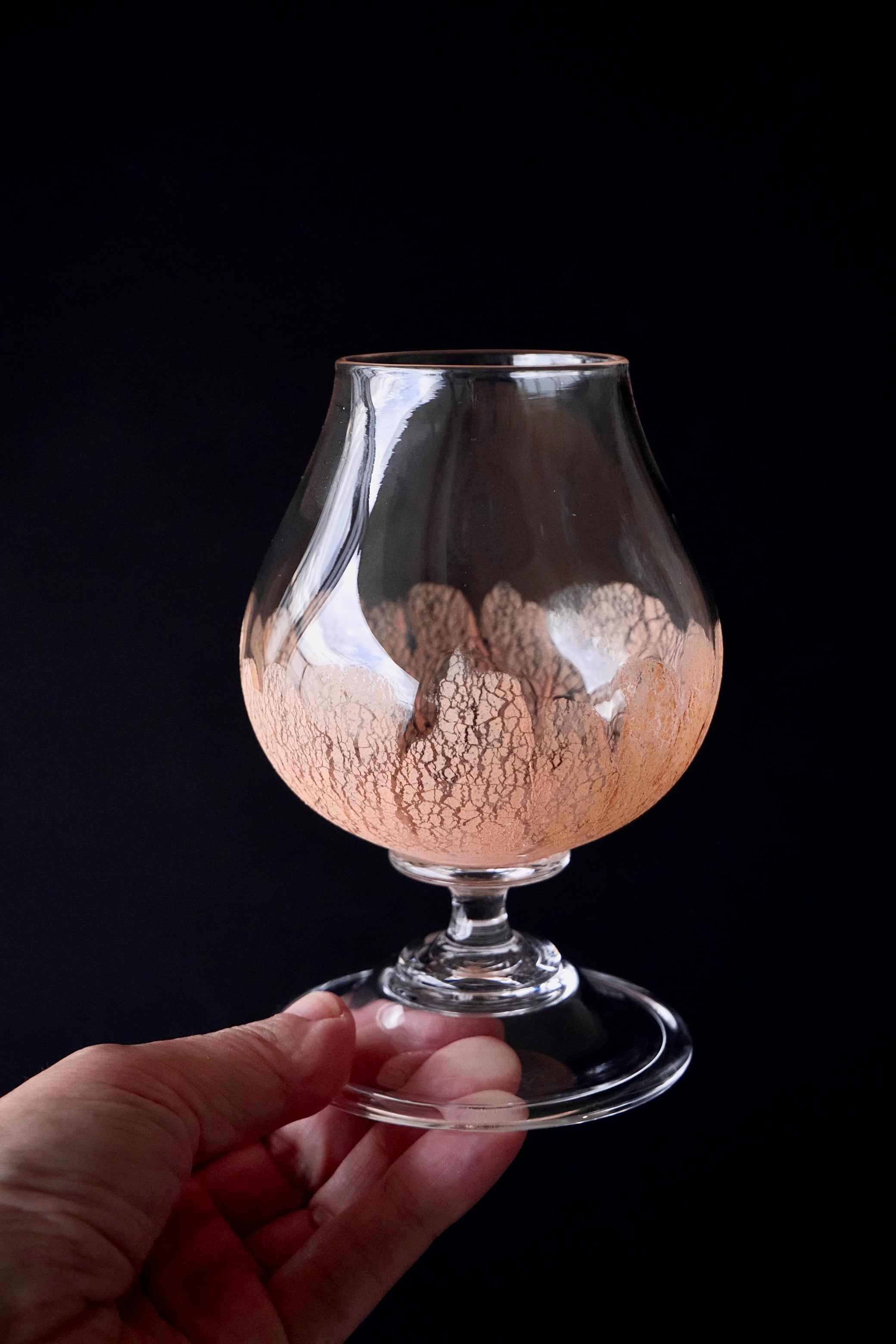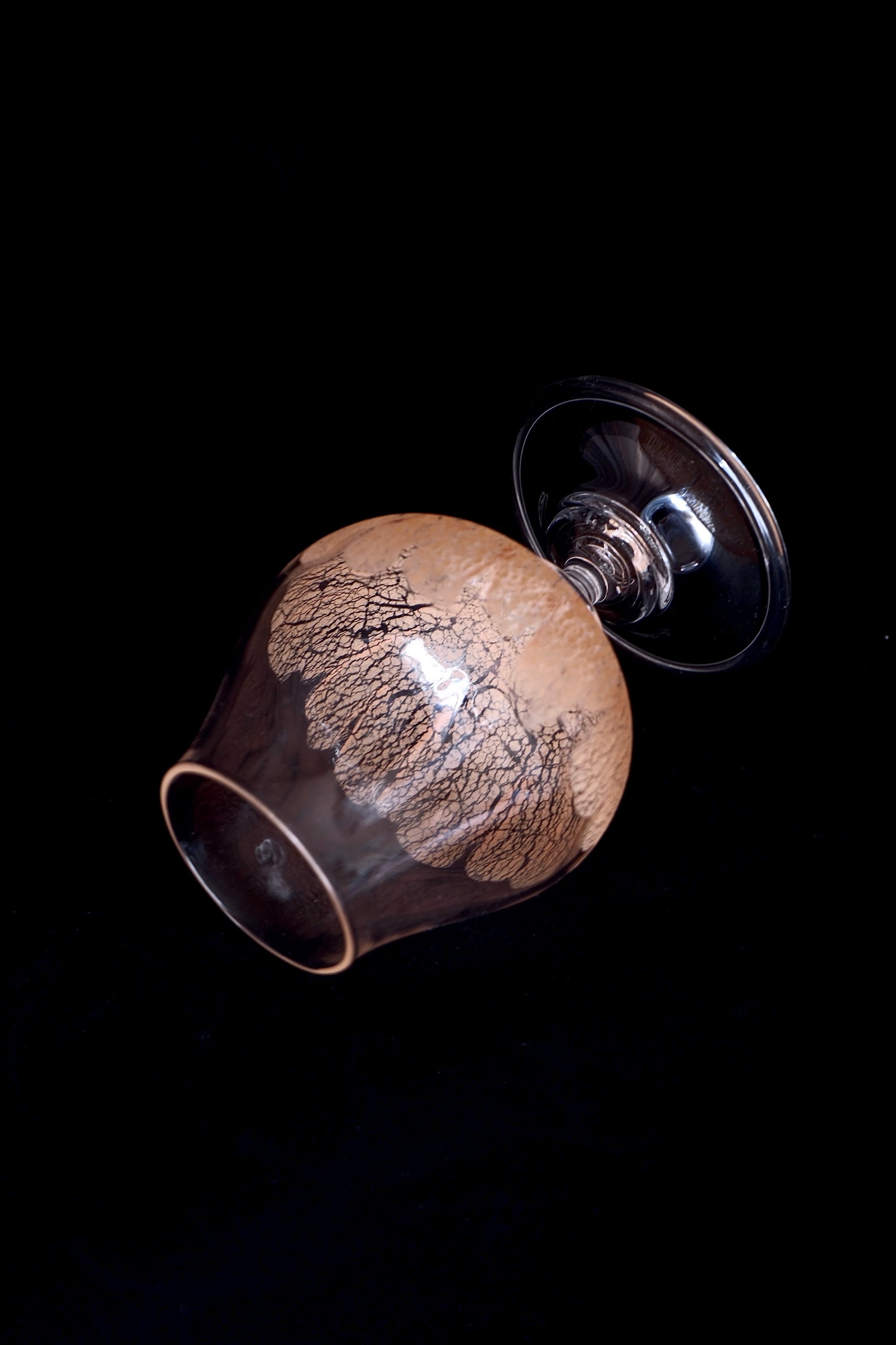 Glass Studio 三日月さんの Toudo みなもグラス。表面に陶芸用の陶土を焼き付け、ガラスを膨らませる過程で弾けさせて、ひび割れ模様を作り出しています。ひとつひとつ表情が異なる仕上がりです。使うほどに手に馴染む変化も楽しんでいただけます。