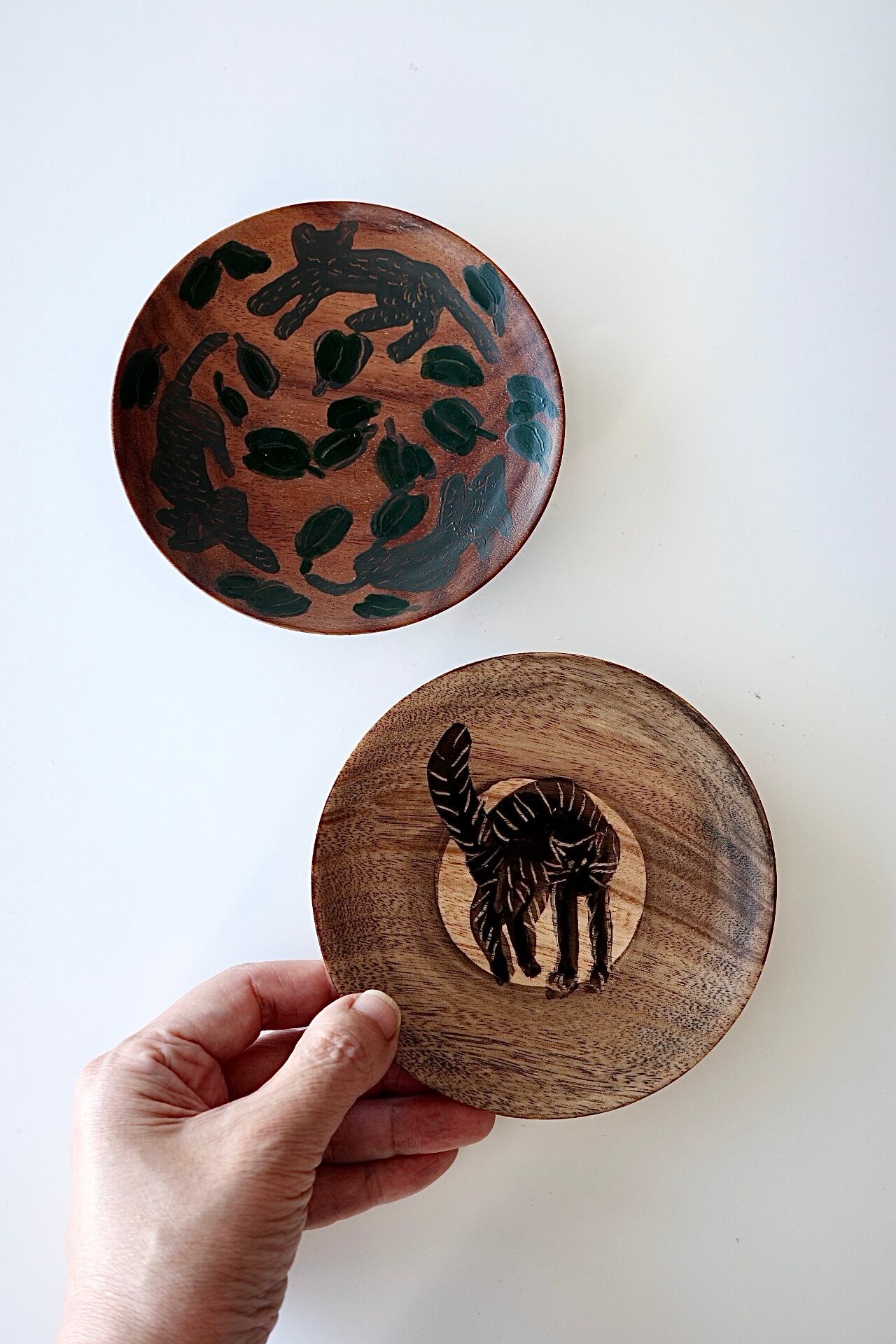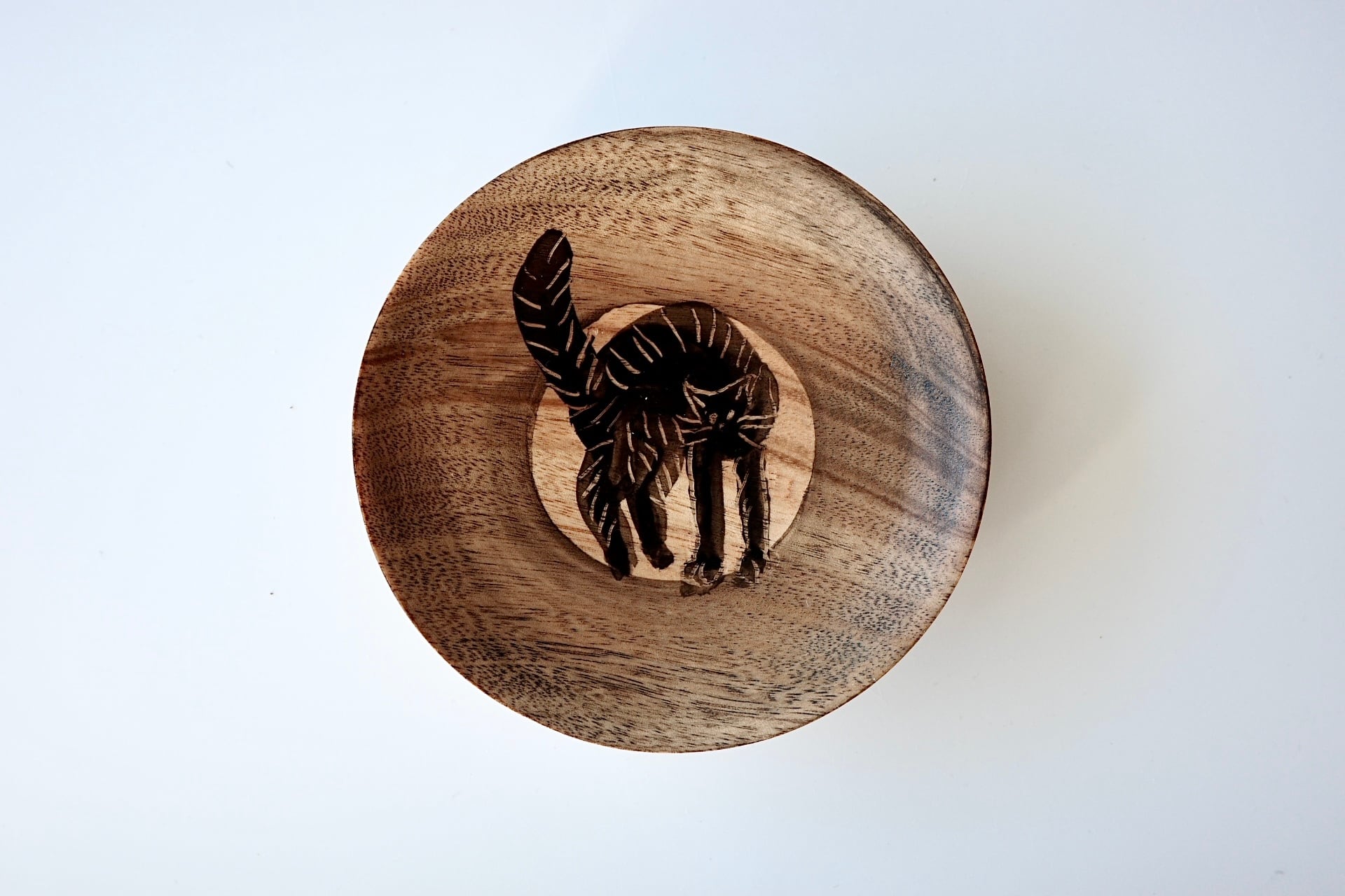 2022年に豊見城に工房を構え、生の木を削り出すグリーンウッドワークという手法を用いて、一つ一つ時間をかけた手仕事でプレート等を制作。沖縄の木に愛らしい黒猫や白猫、ギンネムなどの植物を絵付けし、木目と絵付けの相乗効果で生まれる表情が魅力的な作品を生み出す。