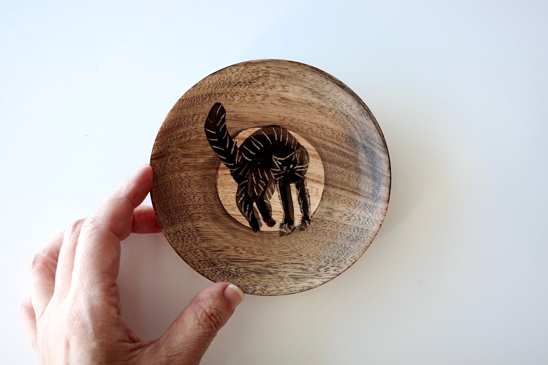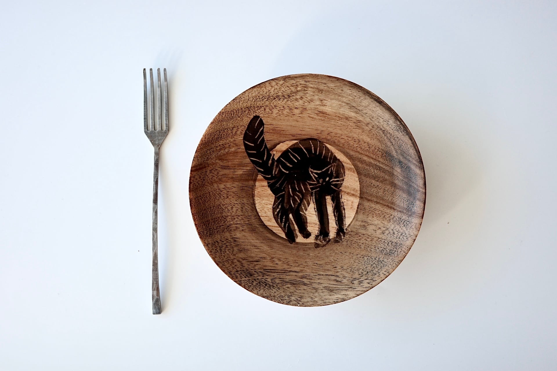 大塚木工さんのプレートφ12。様々に使える4寸サイズです。やんのかポーズのクロネコが描かれています。