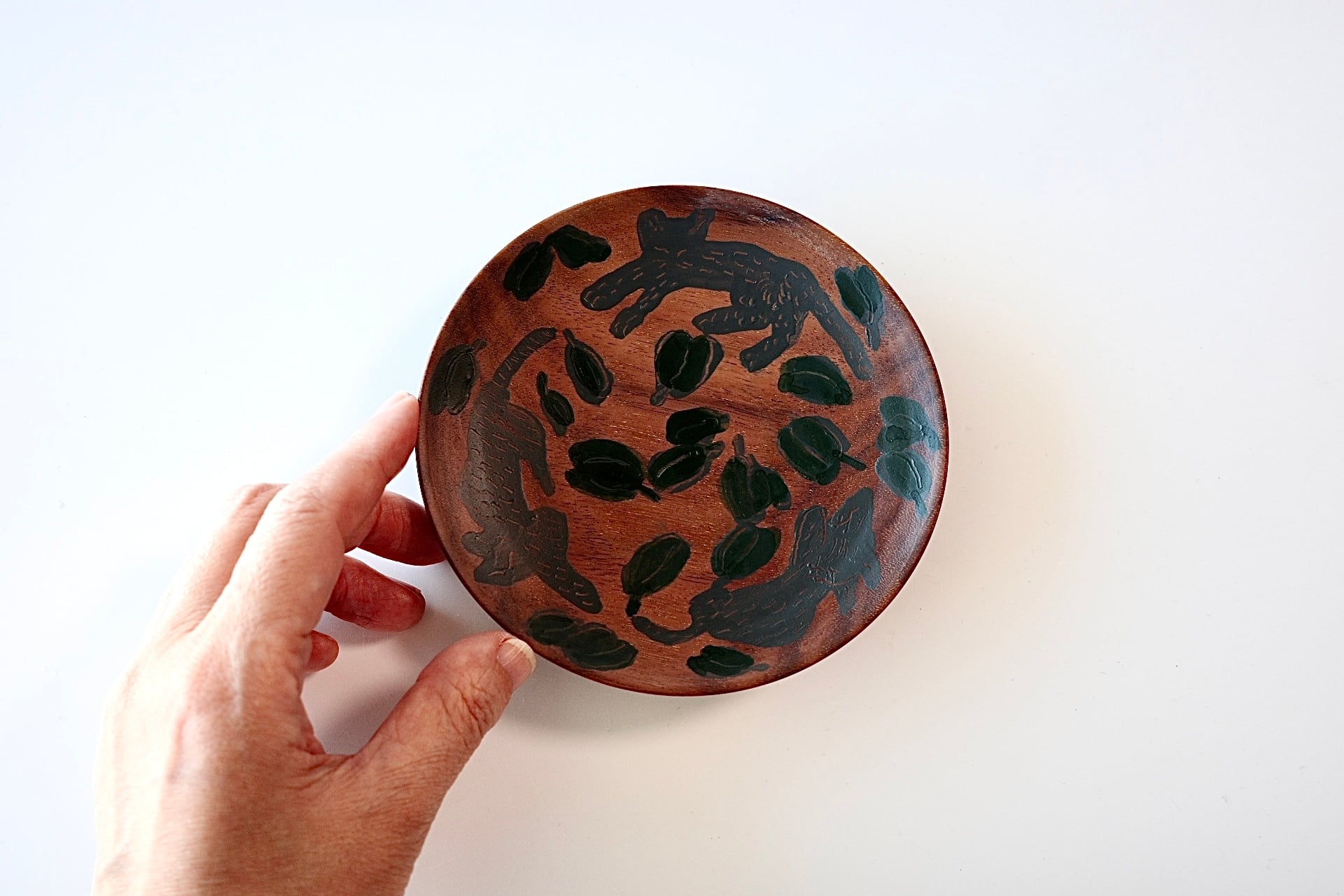 大塚木工さんのプレートφ12。様々に使える4寸サイズです。寝そべるクロネコたちが描かれています。