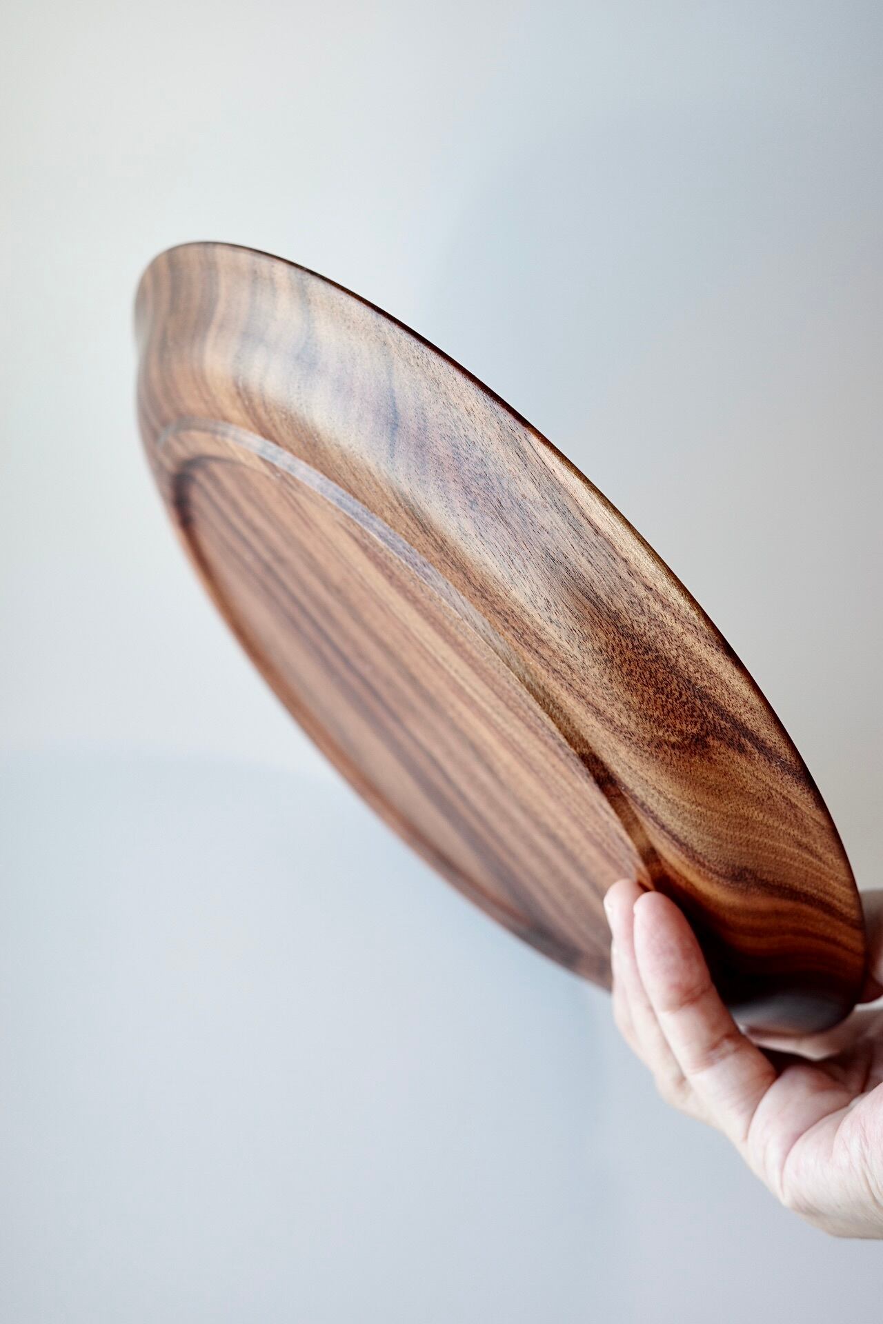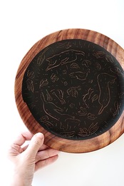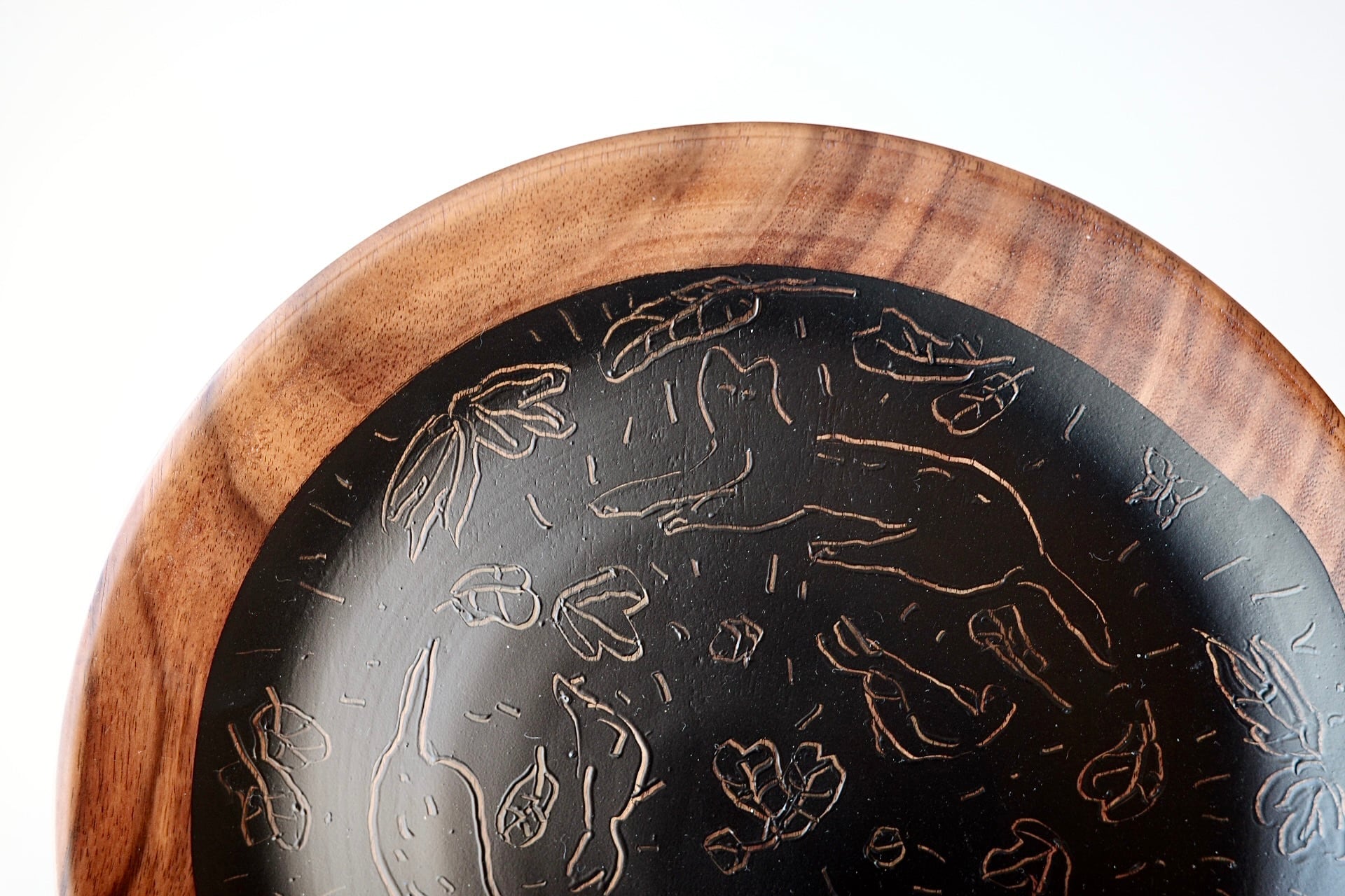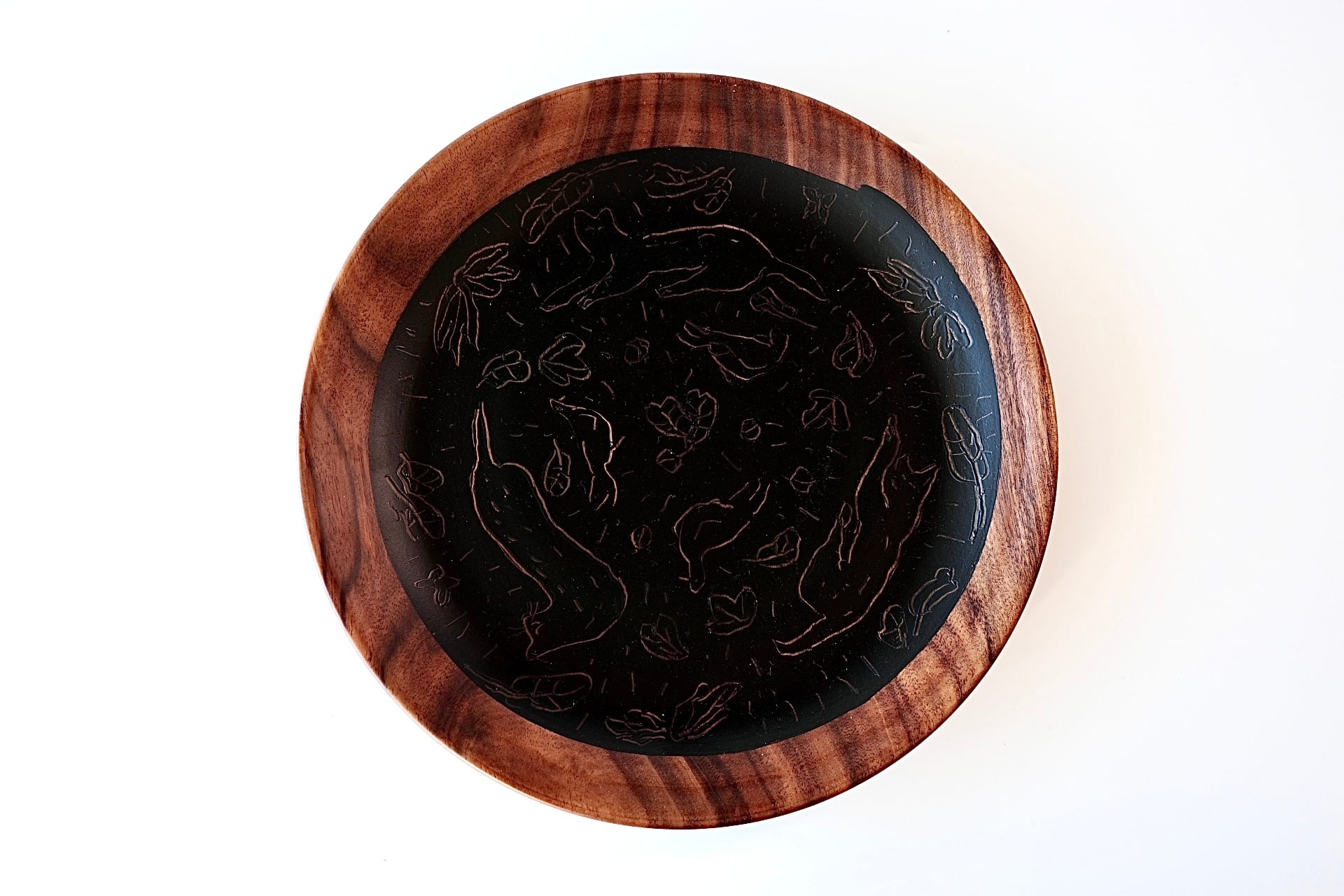 大塚木工さんのプレートφ24。パスタ皿やディナープレートにぴったりなサイズです。黒地のベースにクロネコたちが線彫りで描かれています。