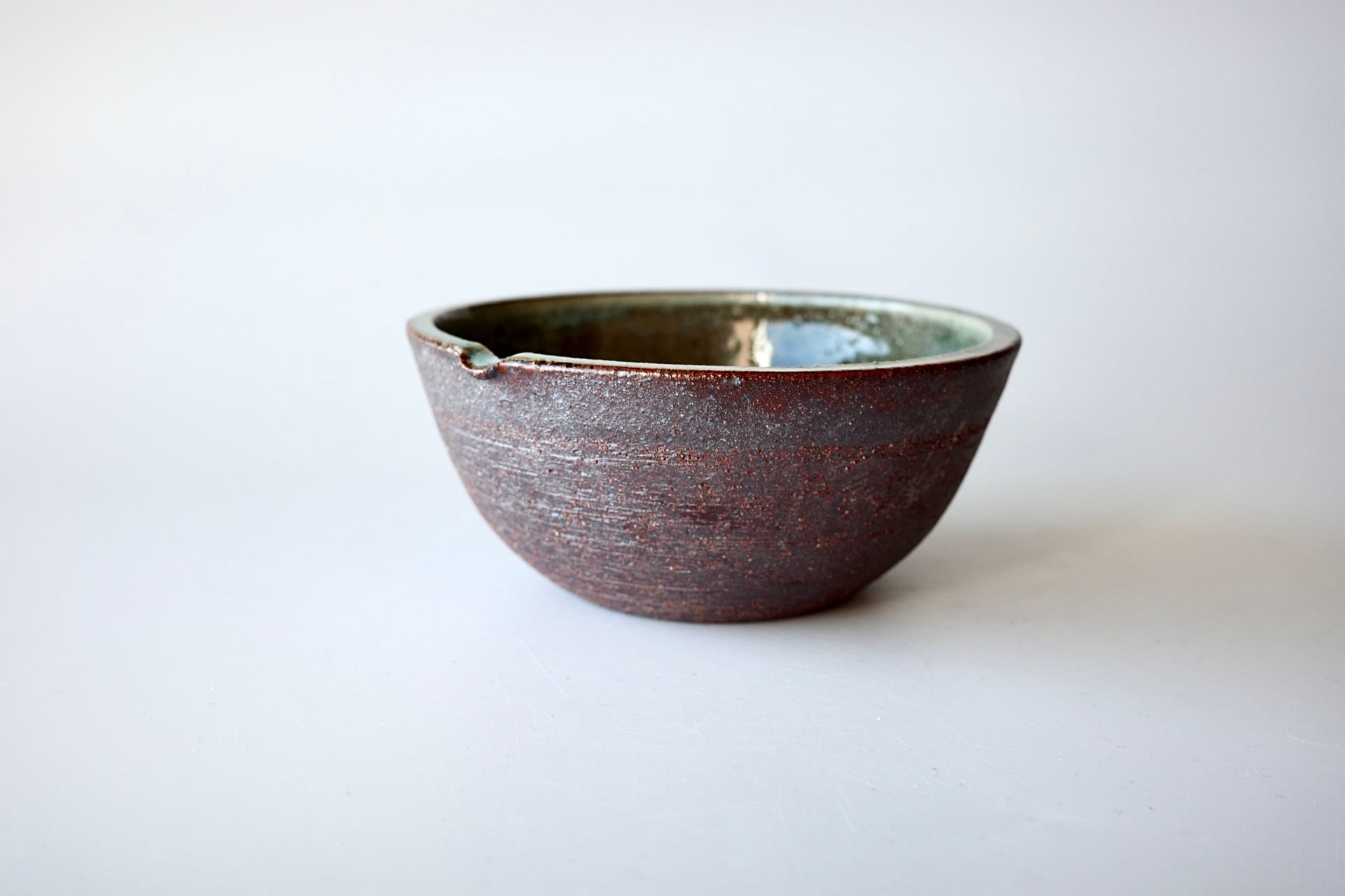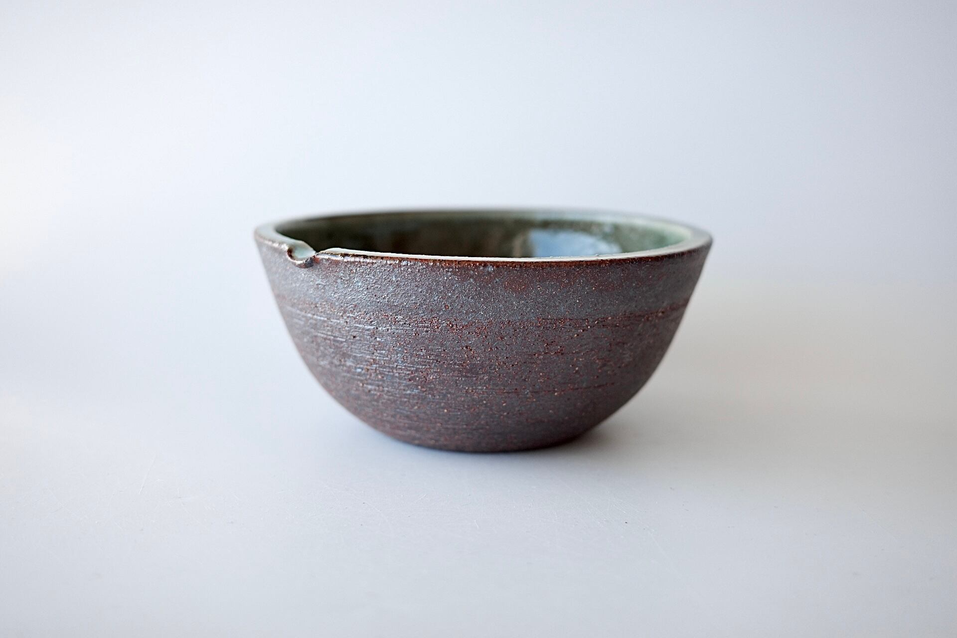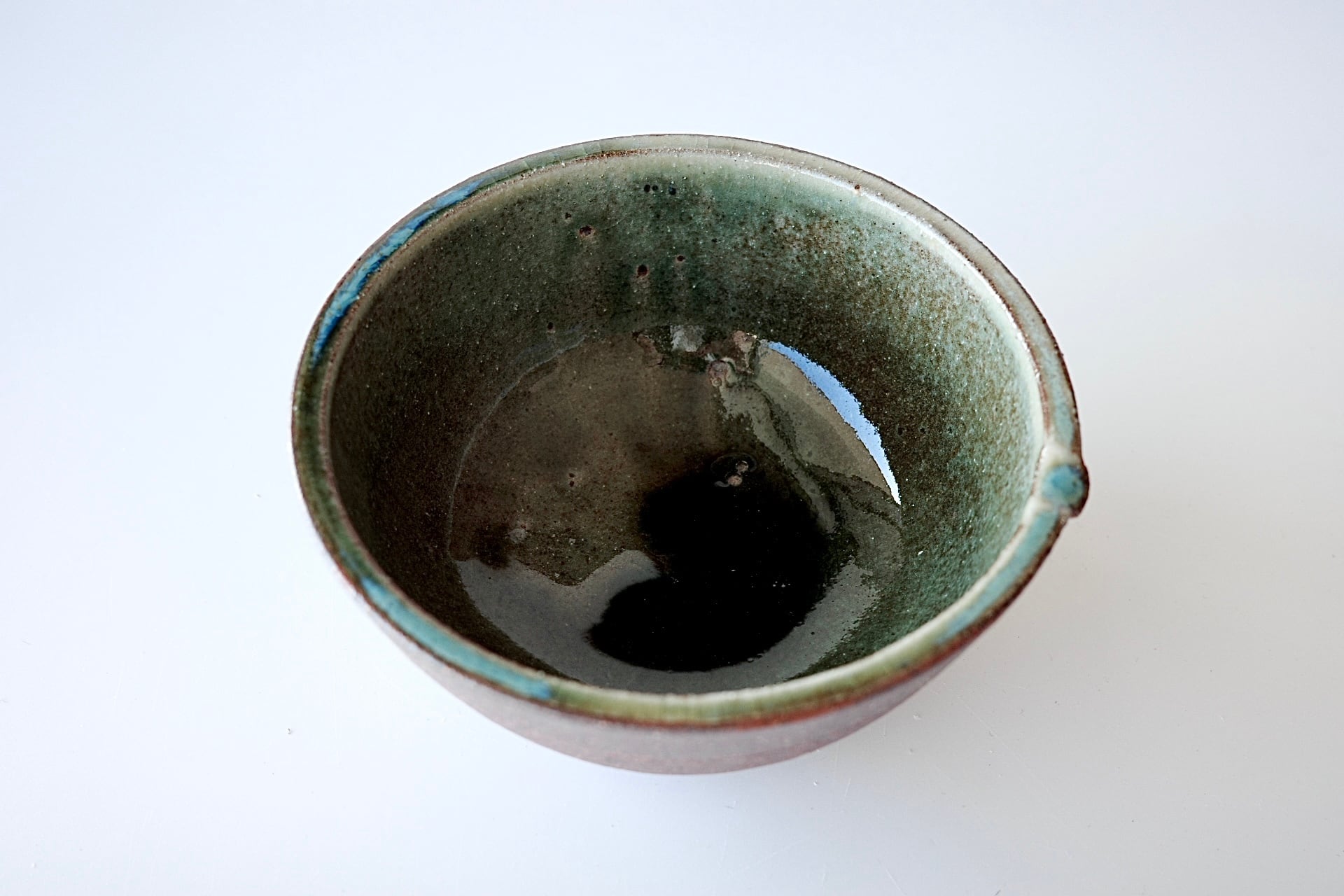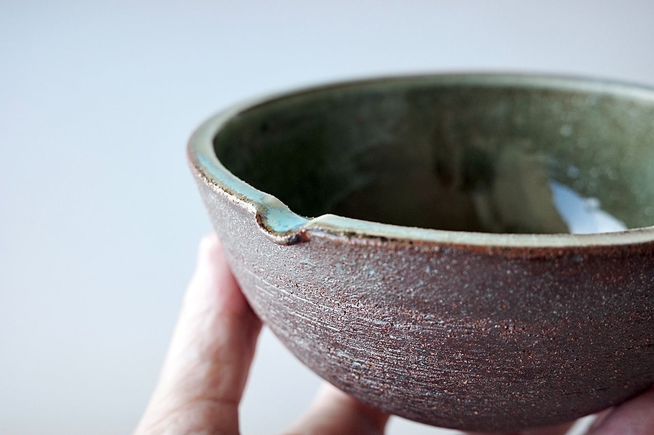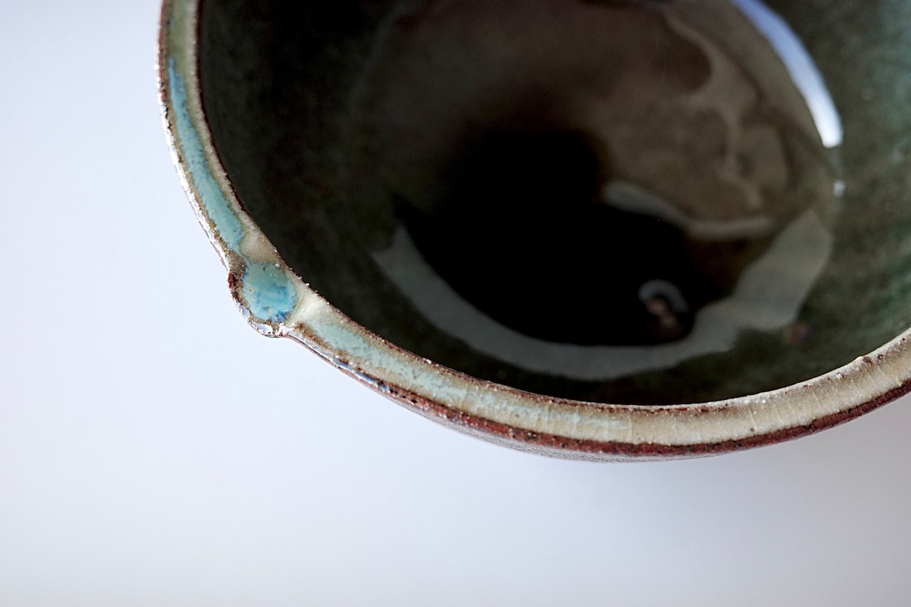 深貝工房さんの登り片口。外側が火色の焼締、内側が表情豊かな緑釉のお品です。薪火の力で趣ある景色が生まれています。縁部分の鮮やかな緑が印象的です。
