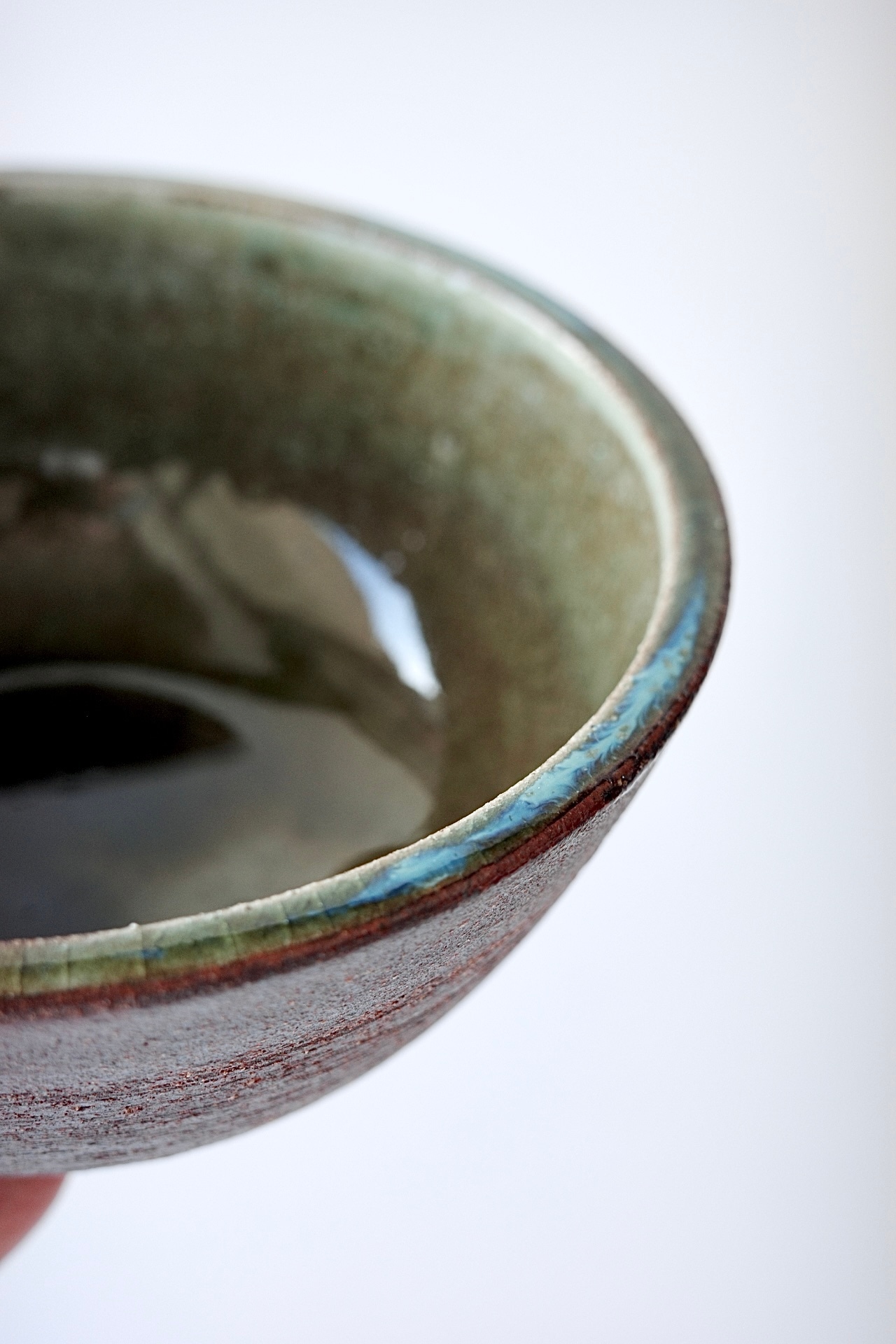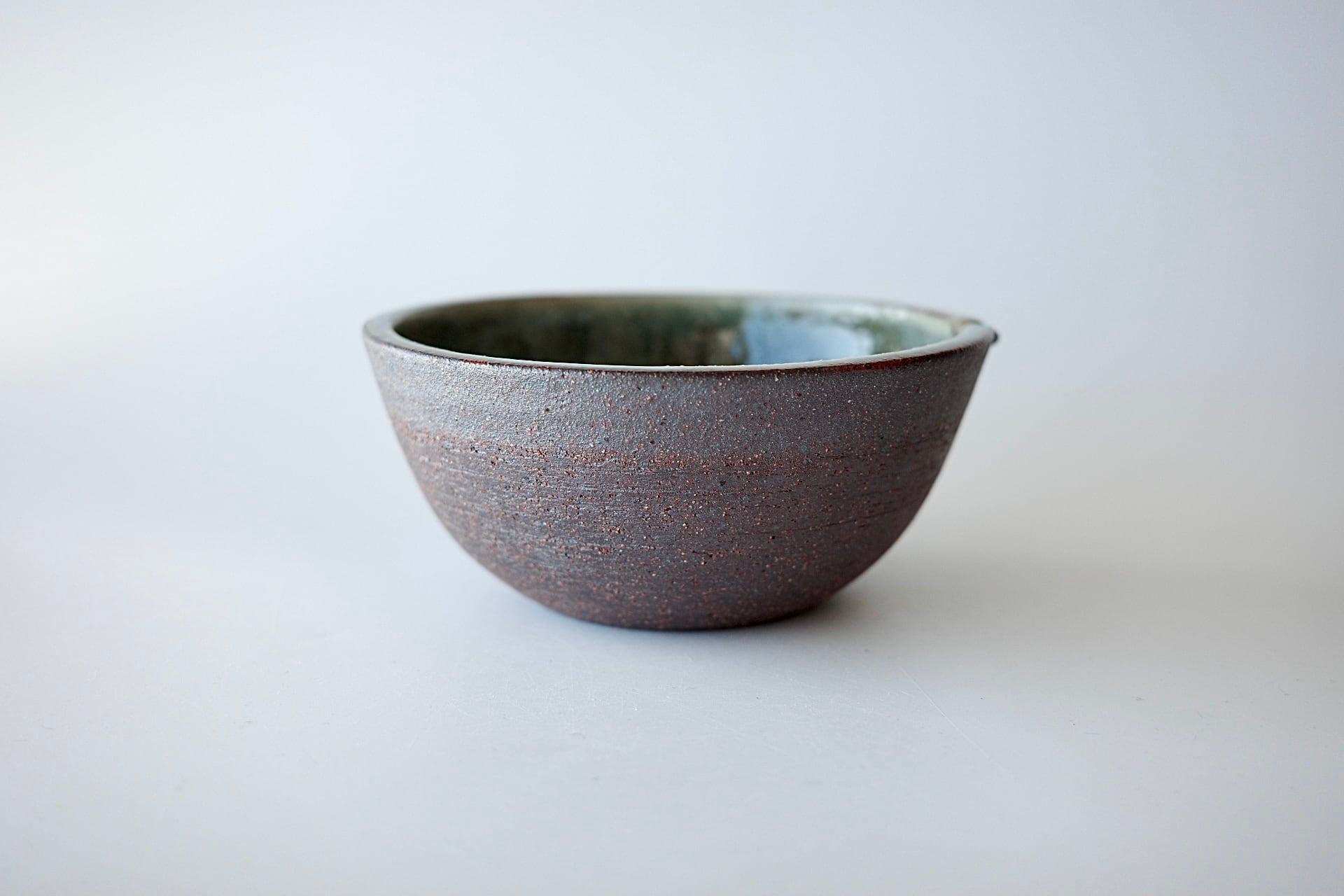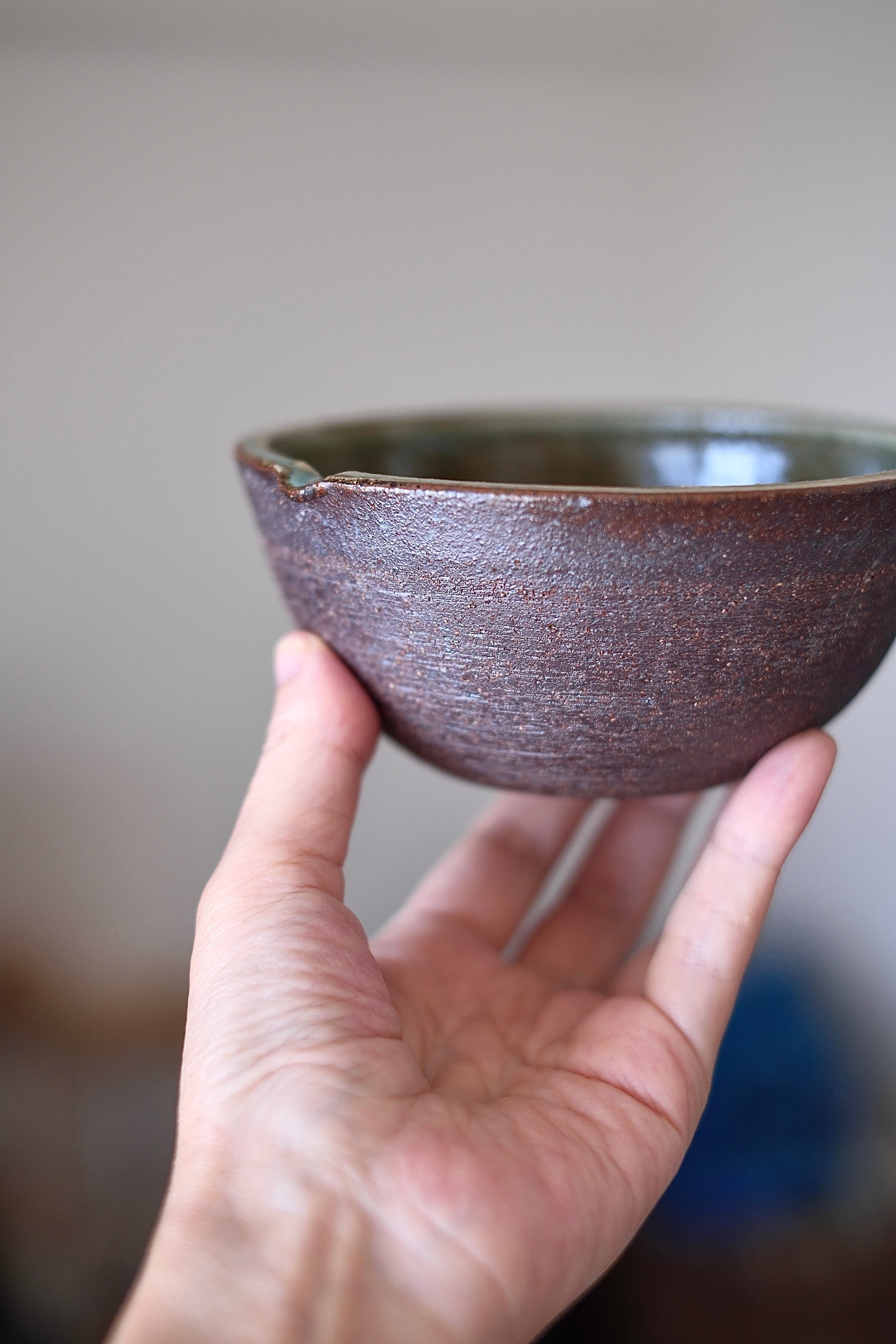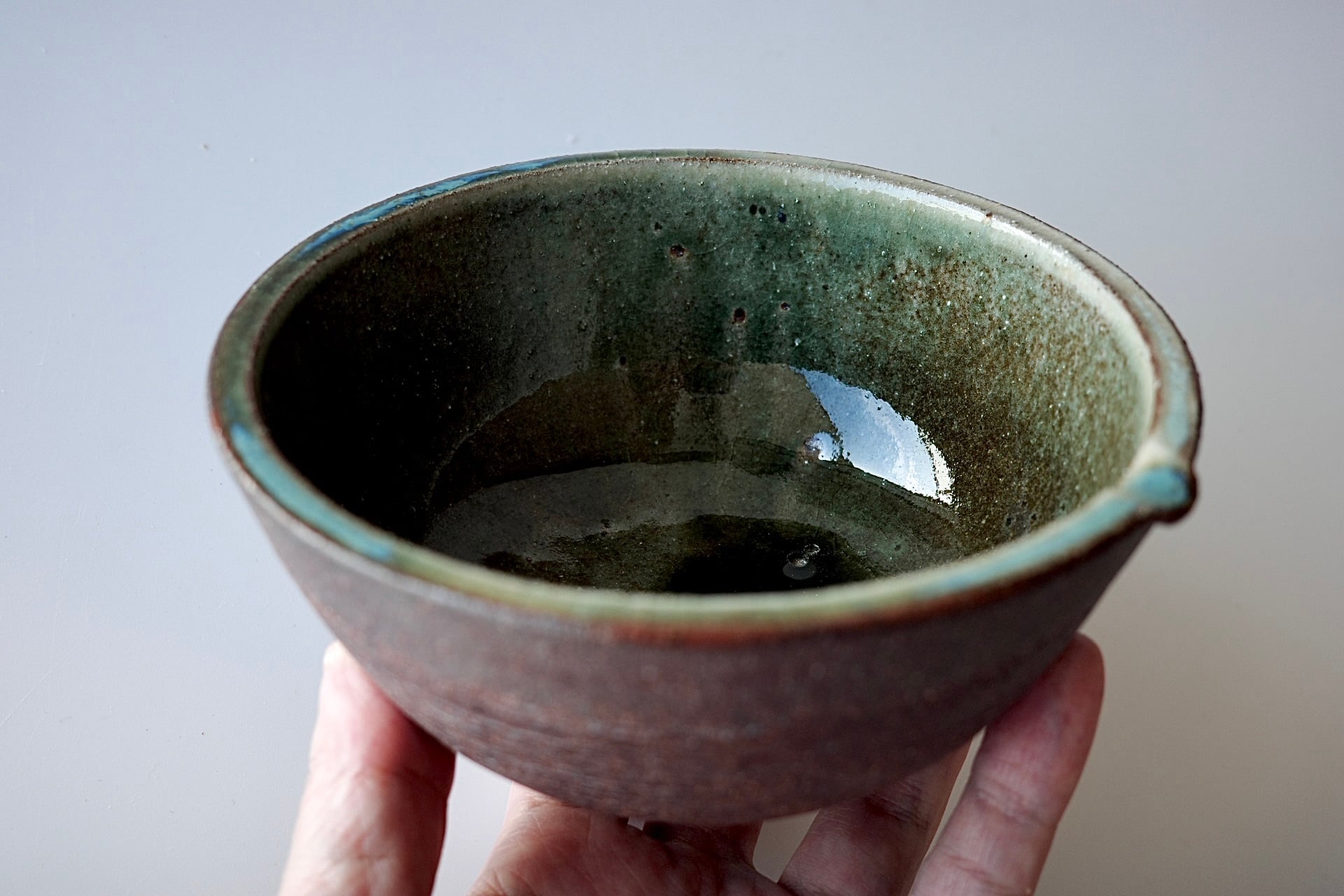 深貝工房さんの登り片口。外側が火色の焼締、内側が表情豊かな緑釉のお品です。薪火の力で趣ある景色が生まれています。縁部分の鮮やかな緑が印象的です。
