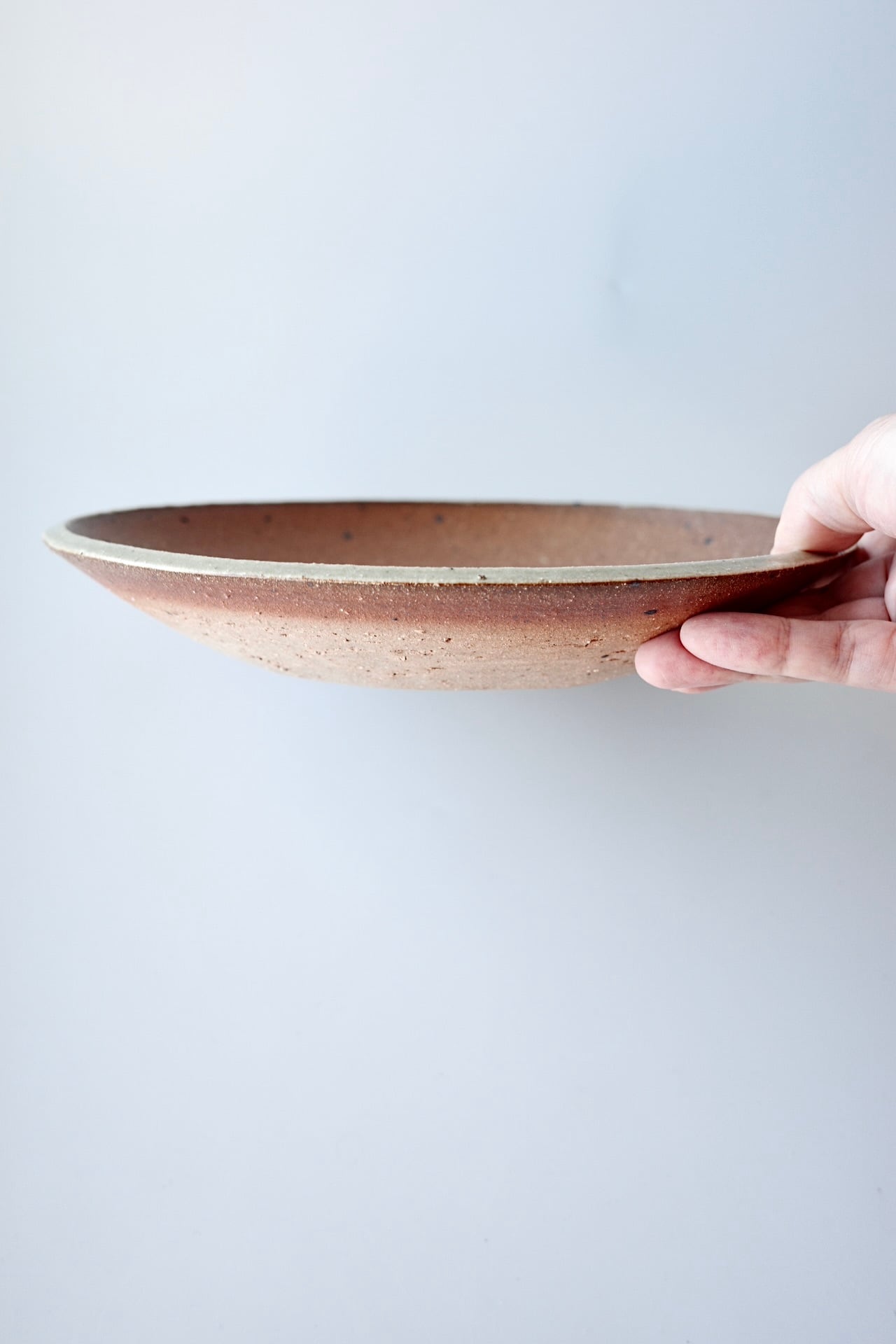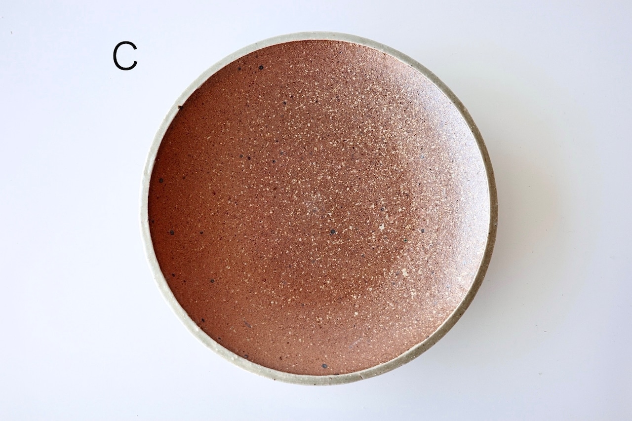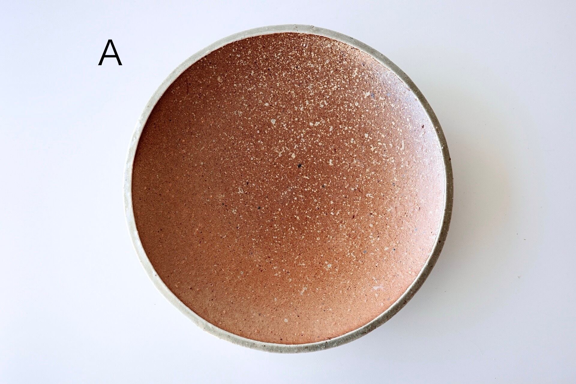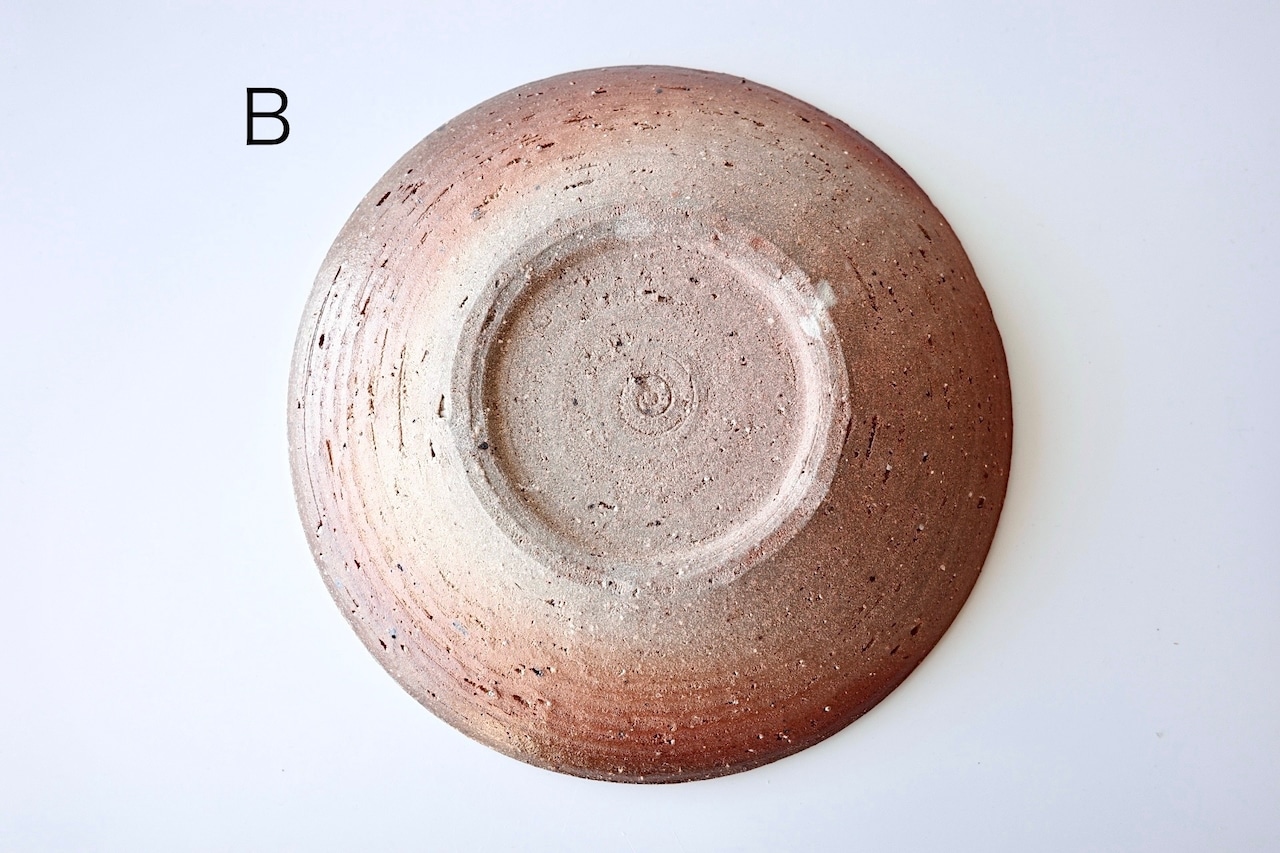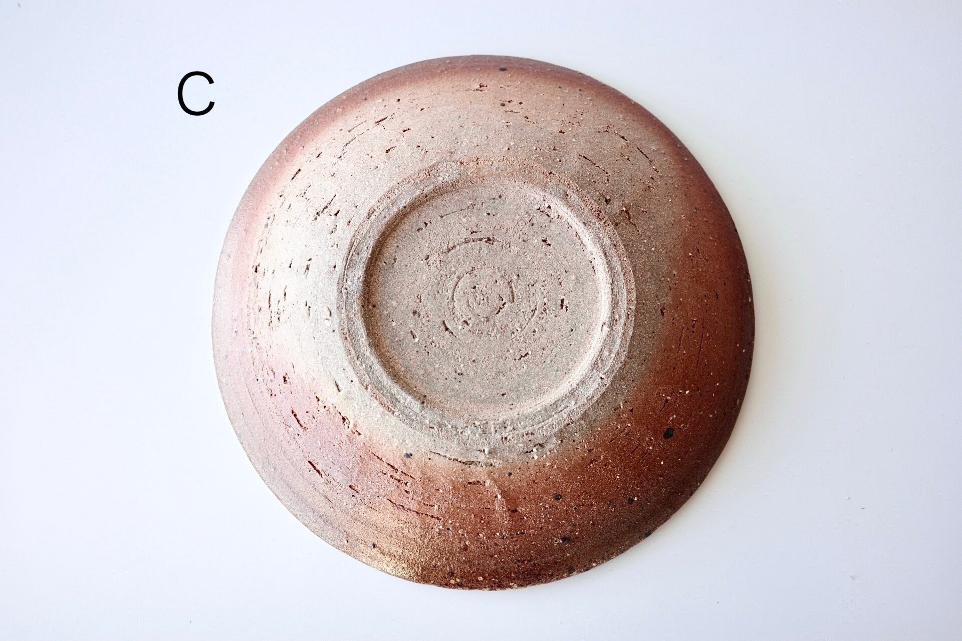 深貝工房さんの登り7寸皿。登り窯で焚かれたリムのない丸皿タイプの焼締のお品です。パスタやカレーなどにぴったりなサイズ。薪窯ならではの灰の景色が印象的で、使うほどに味わいも深くなります。ABC、3種類からお選びいただけます。