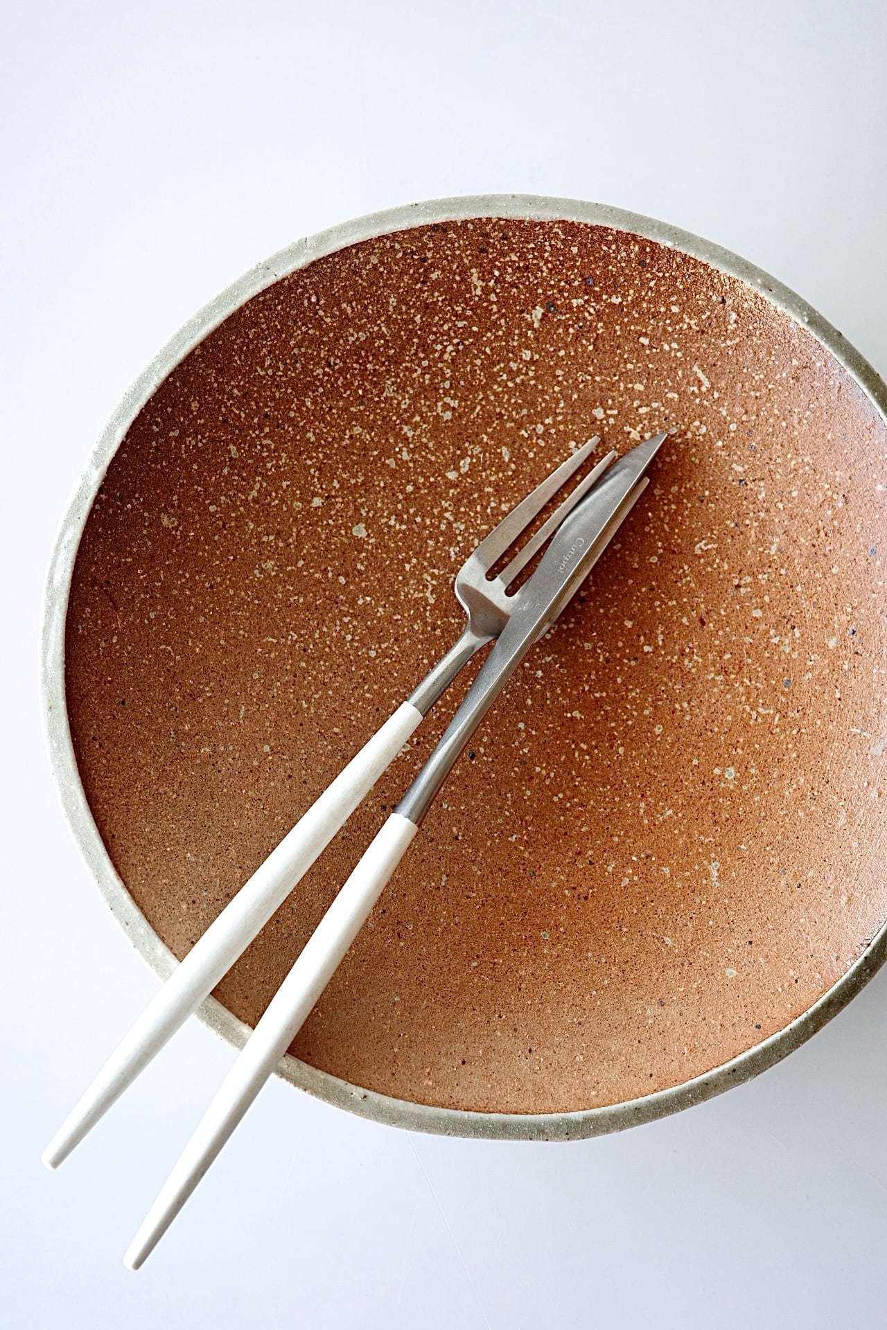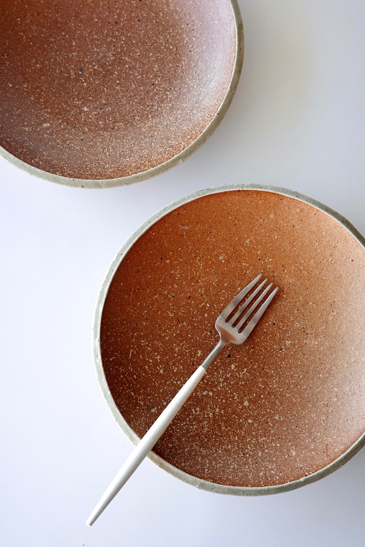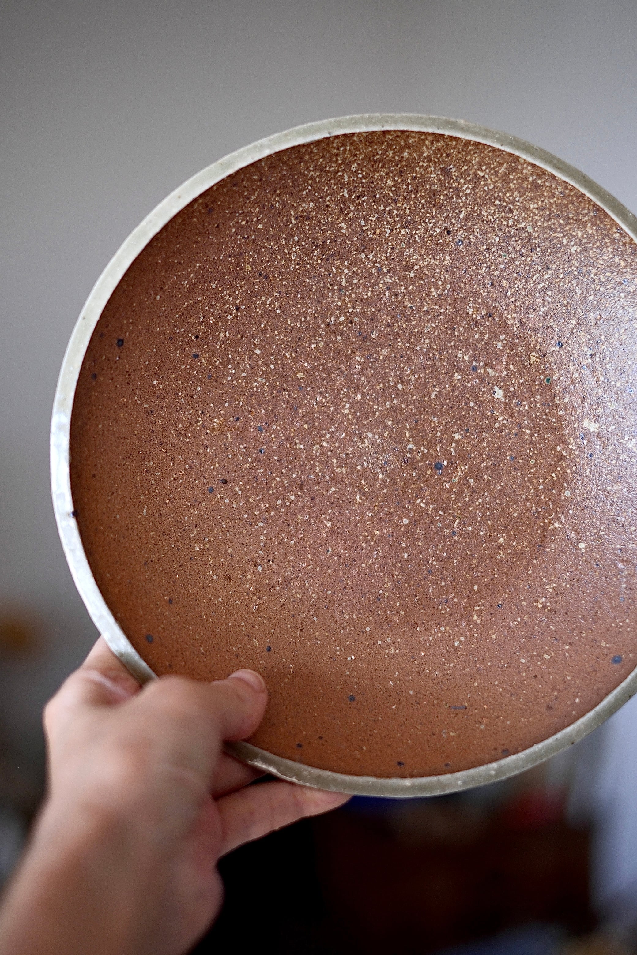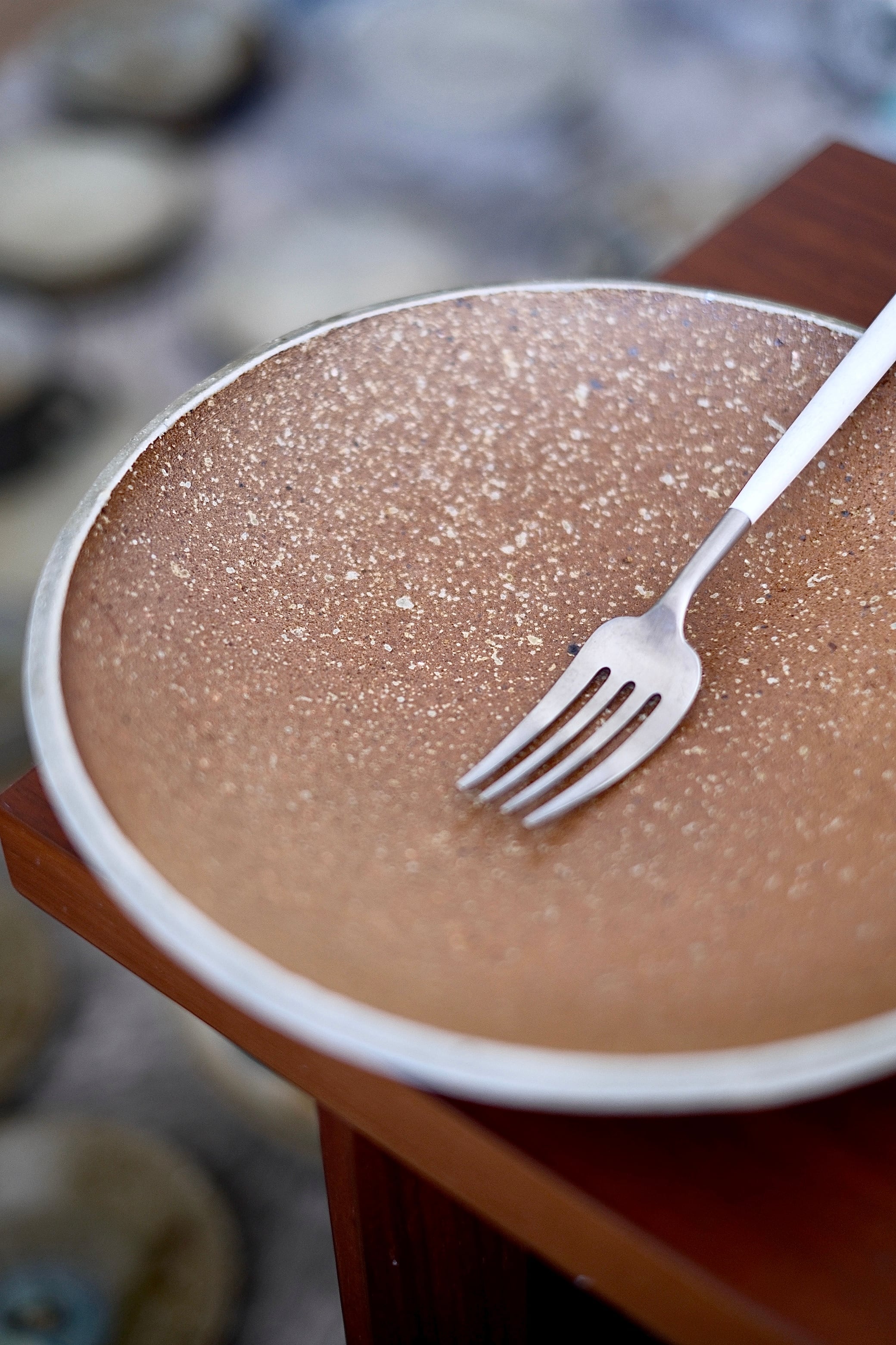 深貝工房さんの登り7寸皿。登り窯で焚かれたリムのない丸皿タイプの焼締のお品です。パスタやカレーなどにぴったりなサイズ。薪窯ならではの灰の景色が印象的で、使うほどに味わいも深くなります。ABC、3種類からお選びいただけます。