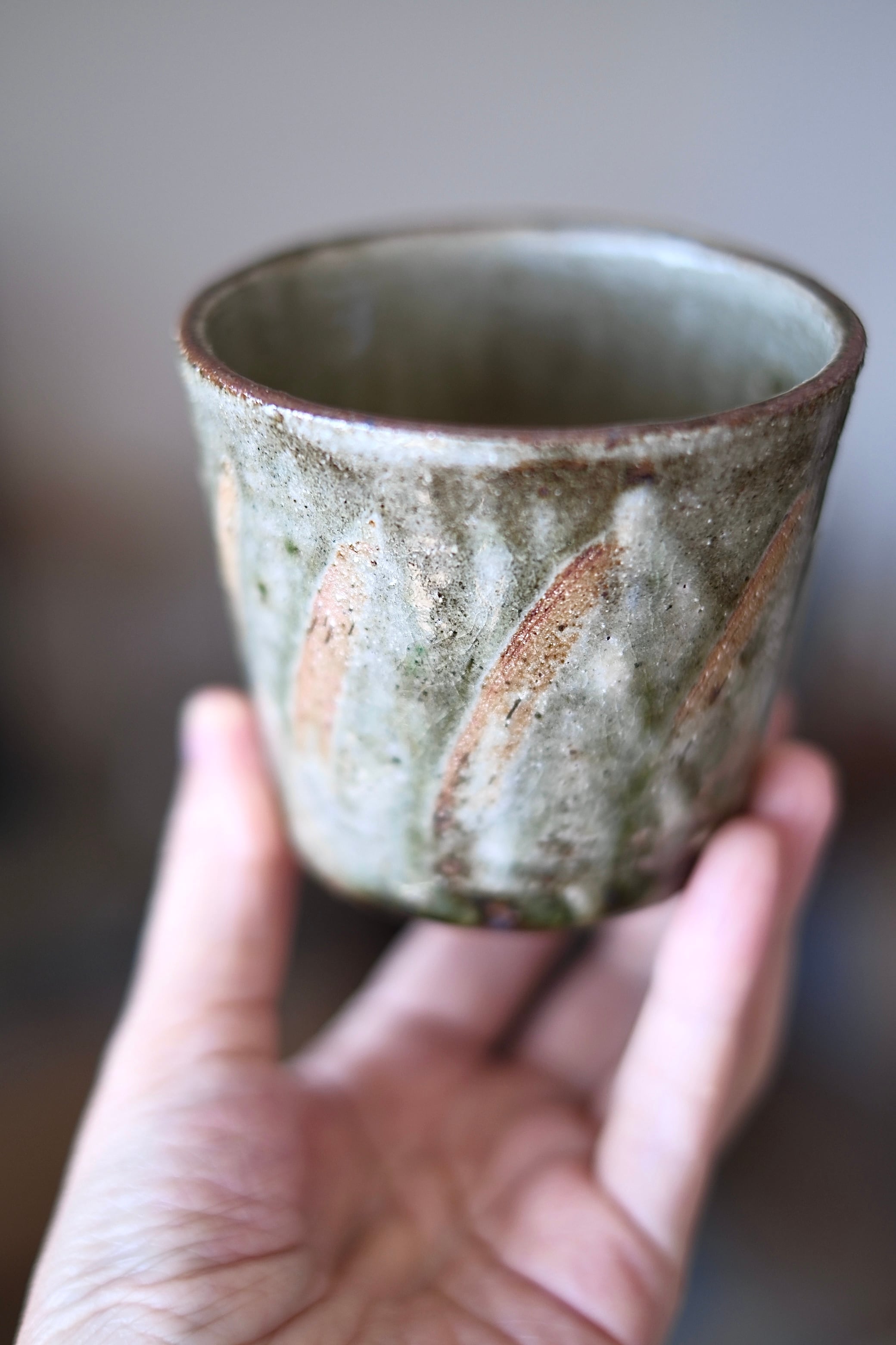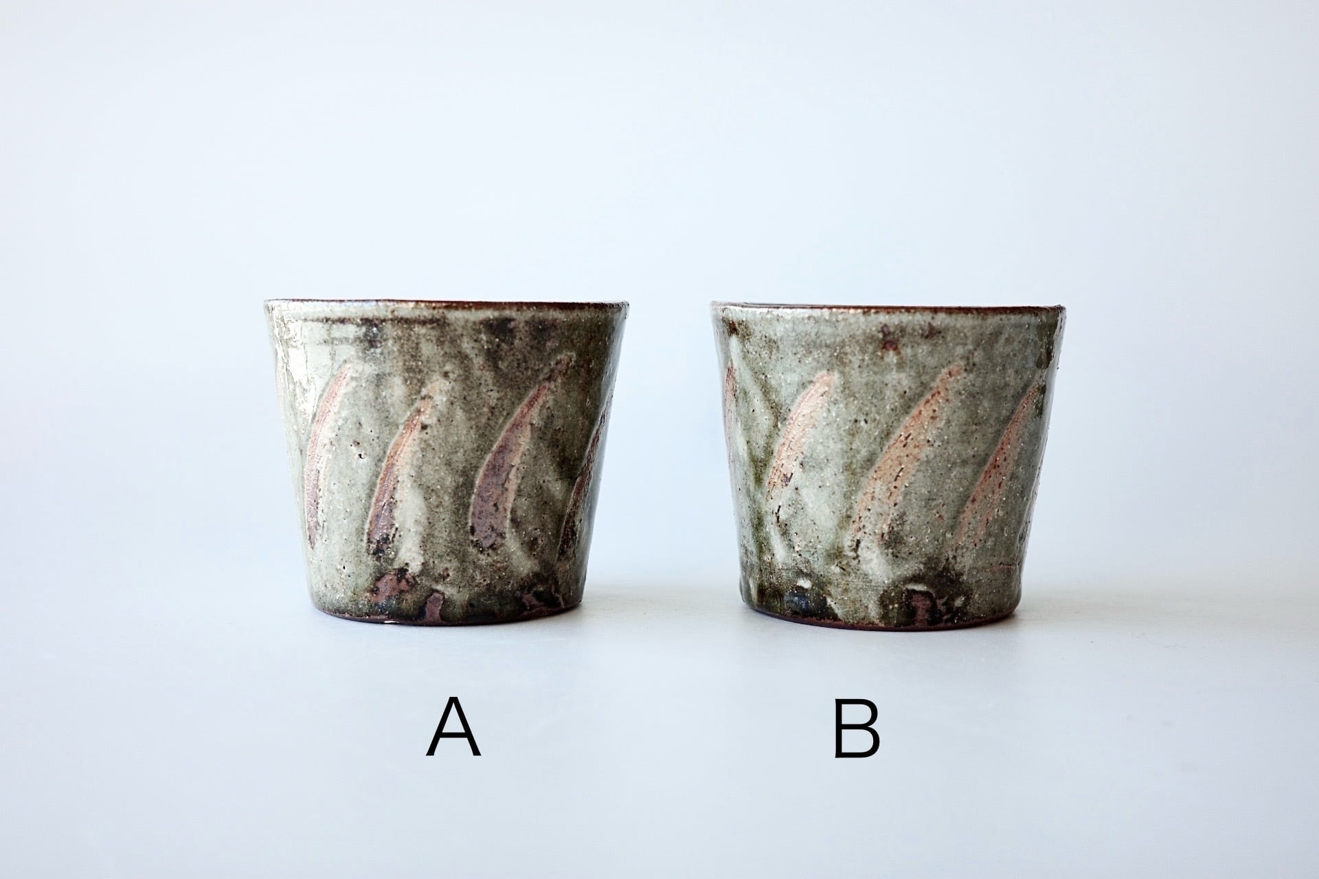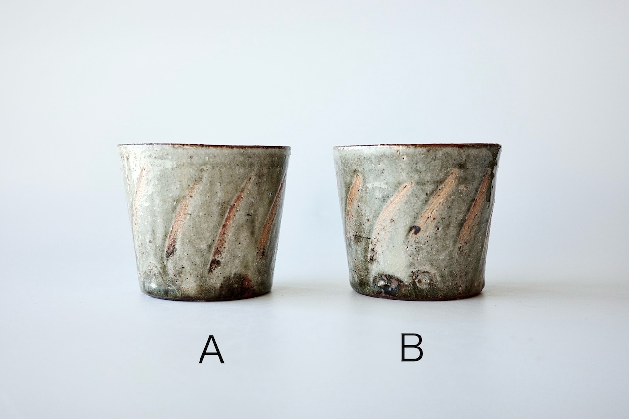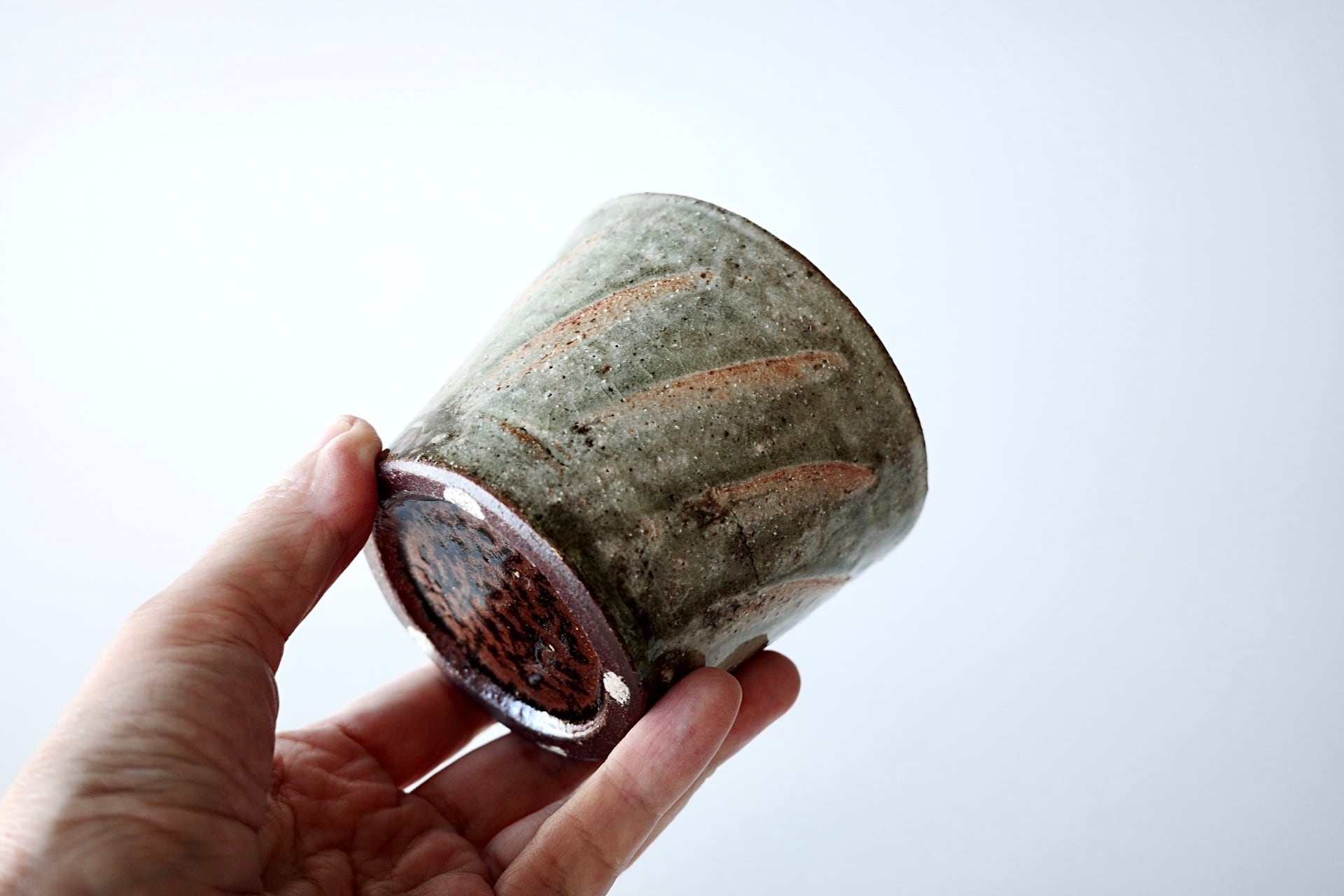 深貝工房さんの登り切立カップ。登り窯で焚かれたお品で、指掻きの紋様が施されています。薪火のパワーで変化した緑釉がカッコよい仕上がり。フリーカップとして様々に使えます。AとB、2種類からお選びいただけます。