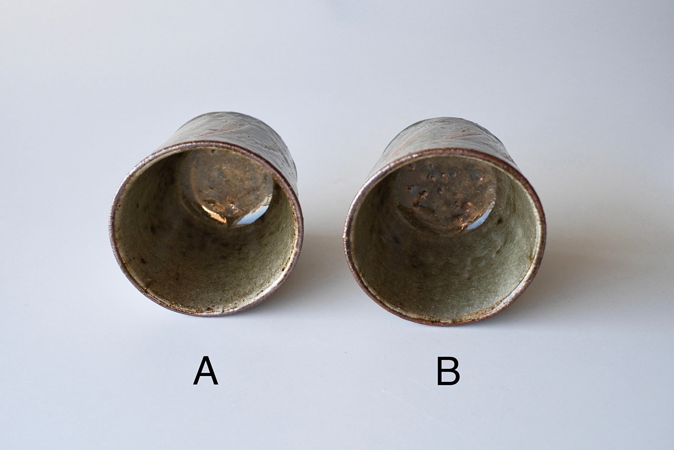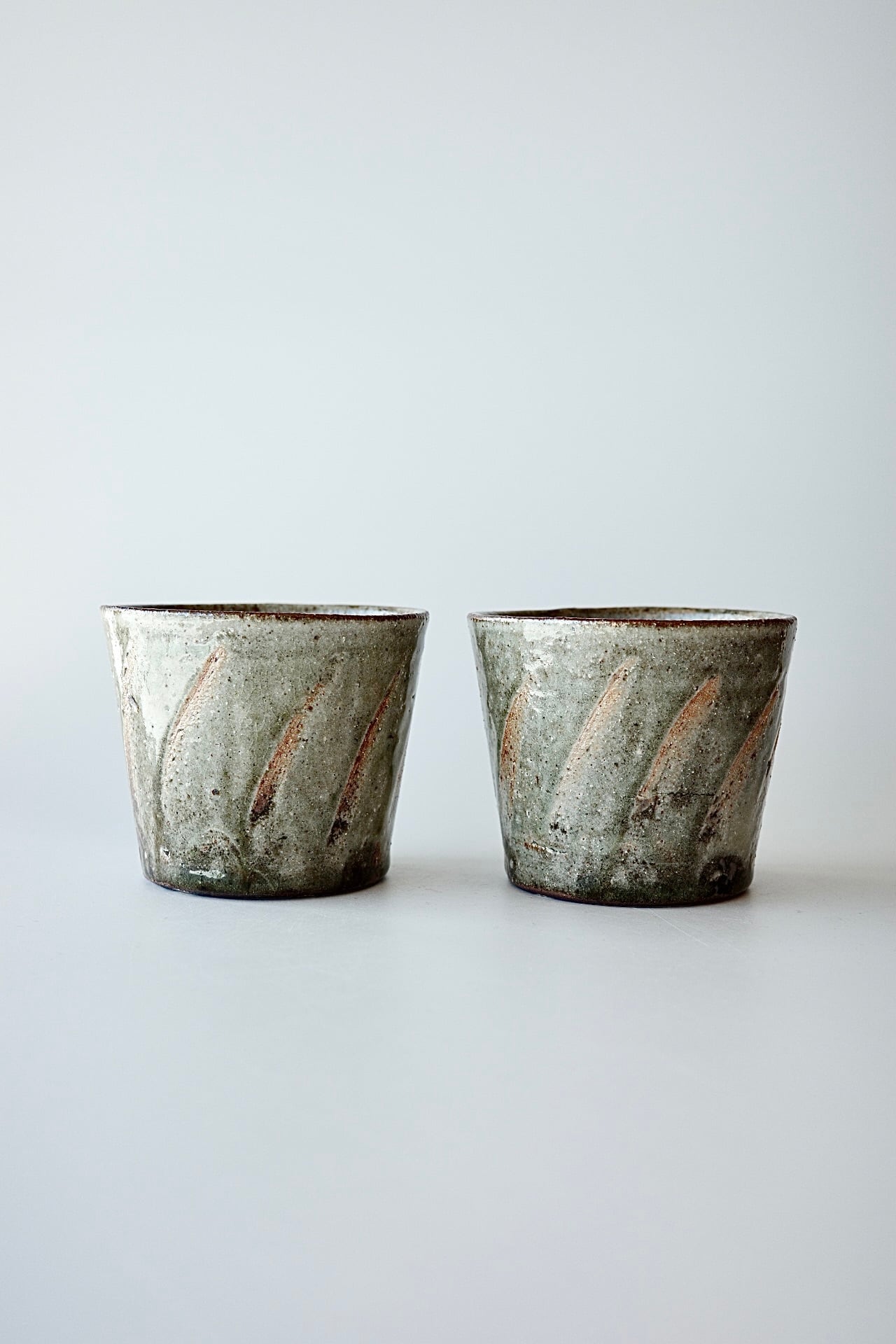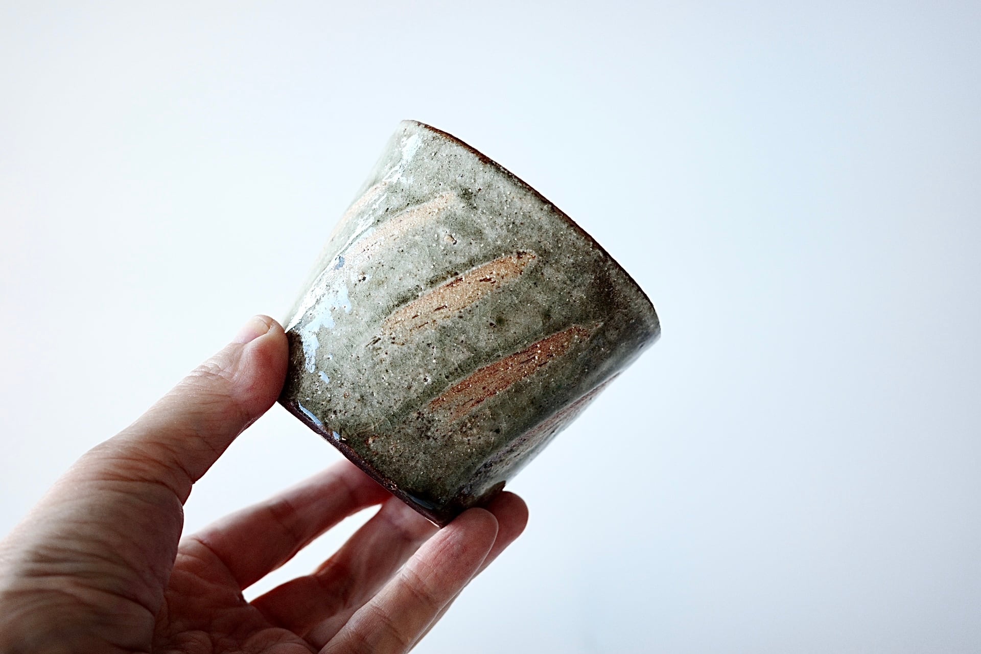 深貝工房さんの登り切立カップ。登り窯で焚かれたお品で、指掻きの紋様が施されています。薪火のパワーで変化した緑釉がカッコよい仕上がり。フリーカップとして様々に使えます。AとB、2種類からお選びいただけます。