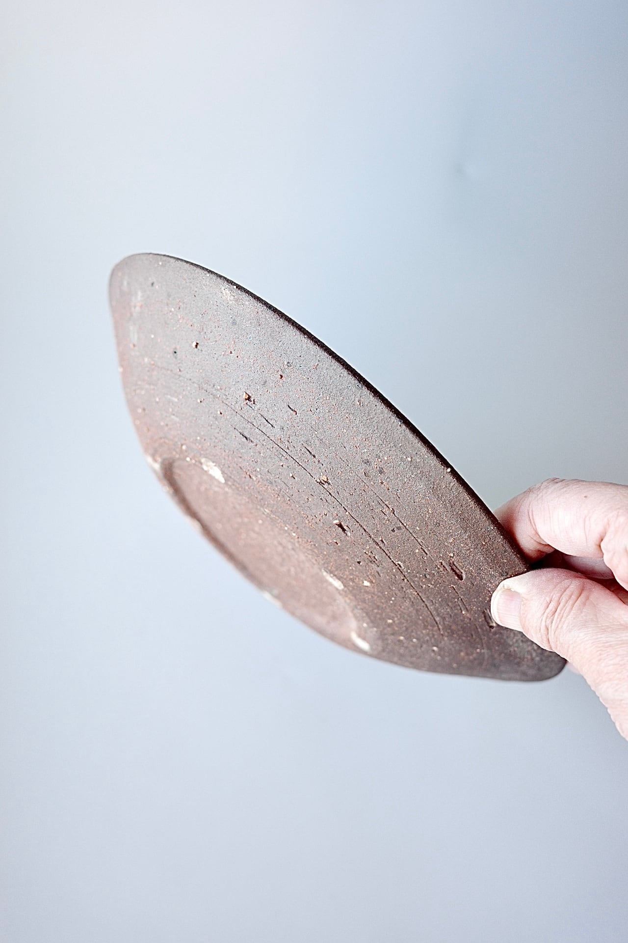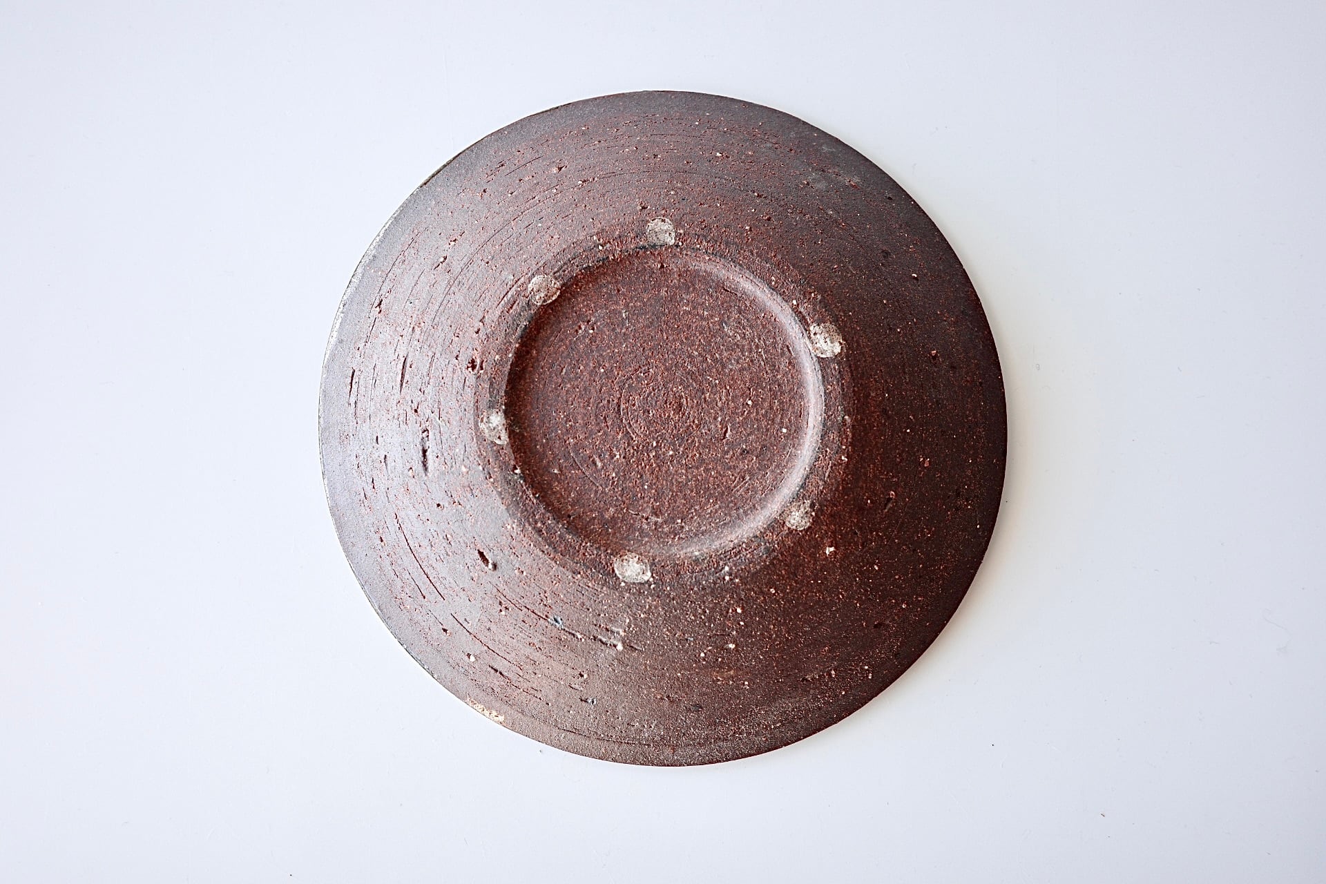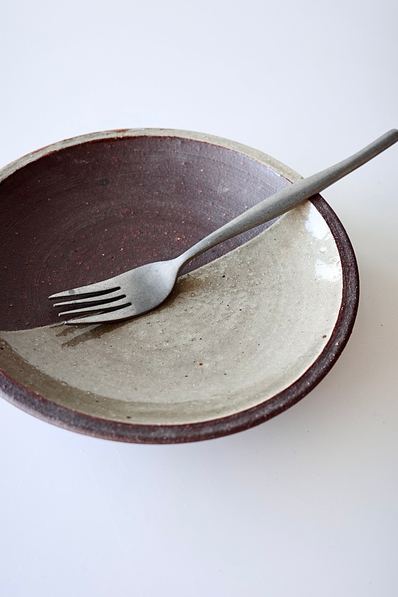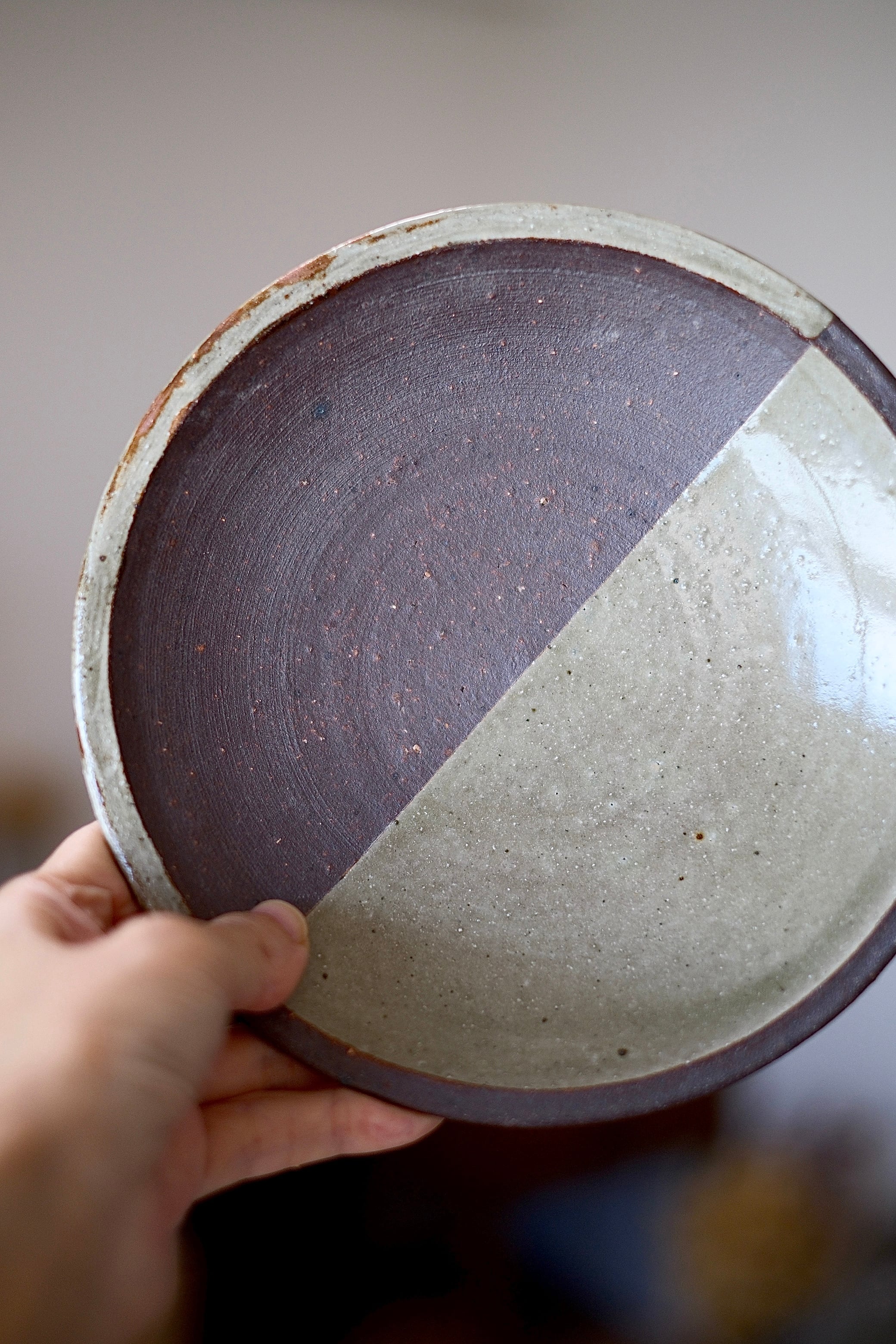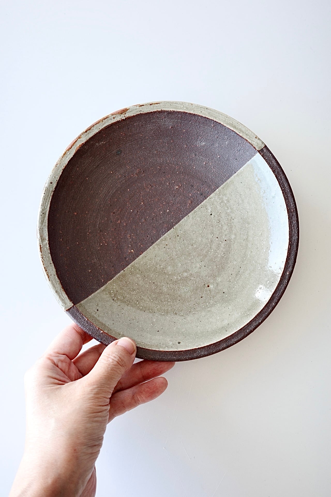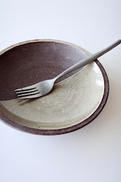 深貝工房さんの登り6寸皿。登り窯で焚かれたリムのない丸皿タイプのお品です。こちらは焼締めの半面に化粧土を掛けたプレートで、モダンな印象で使い勝手の良いサイズです。5寸、4寸サイズもございます。