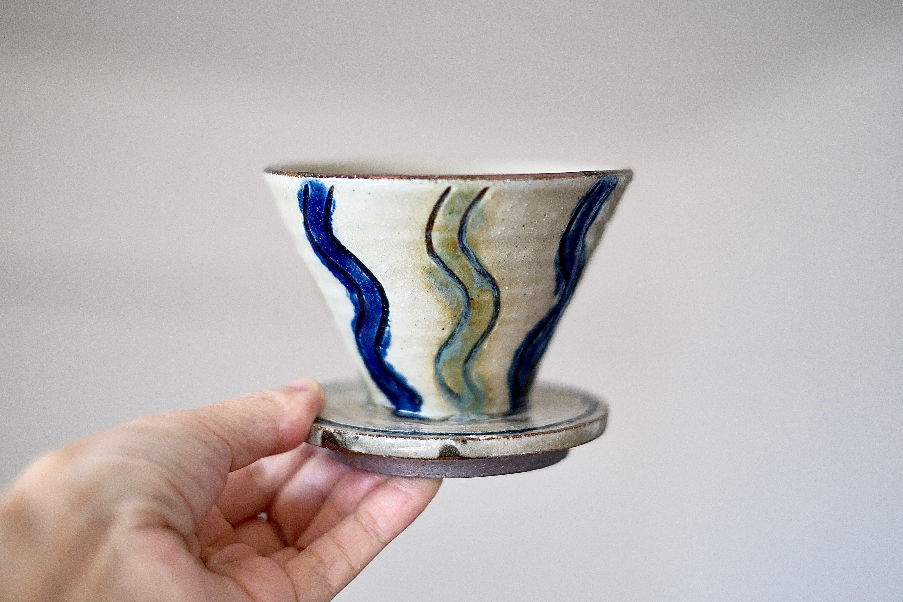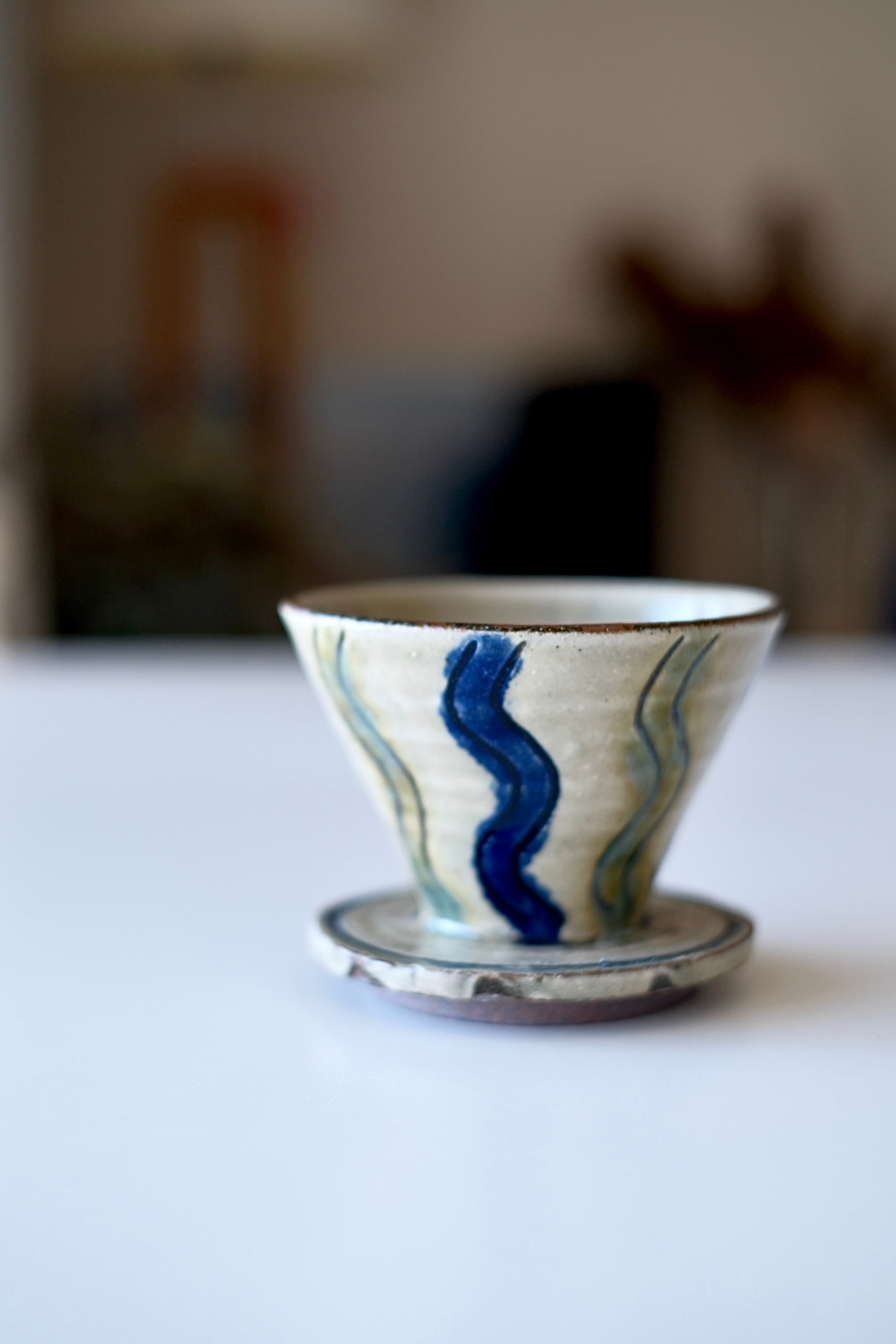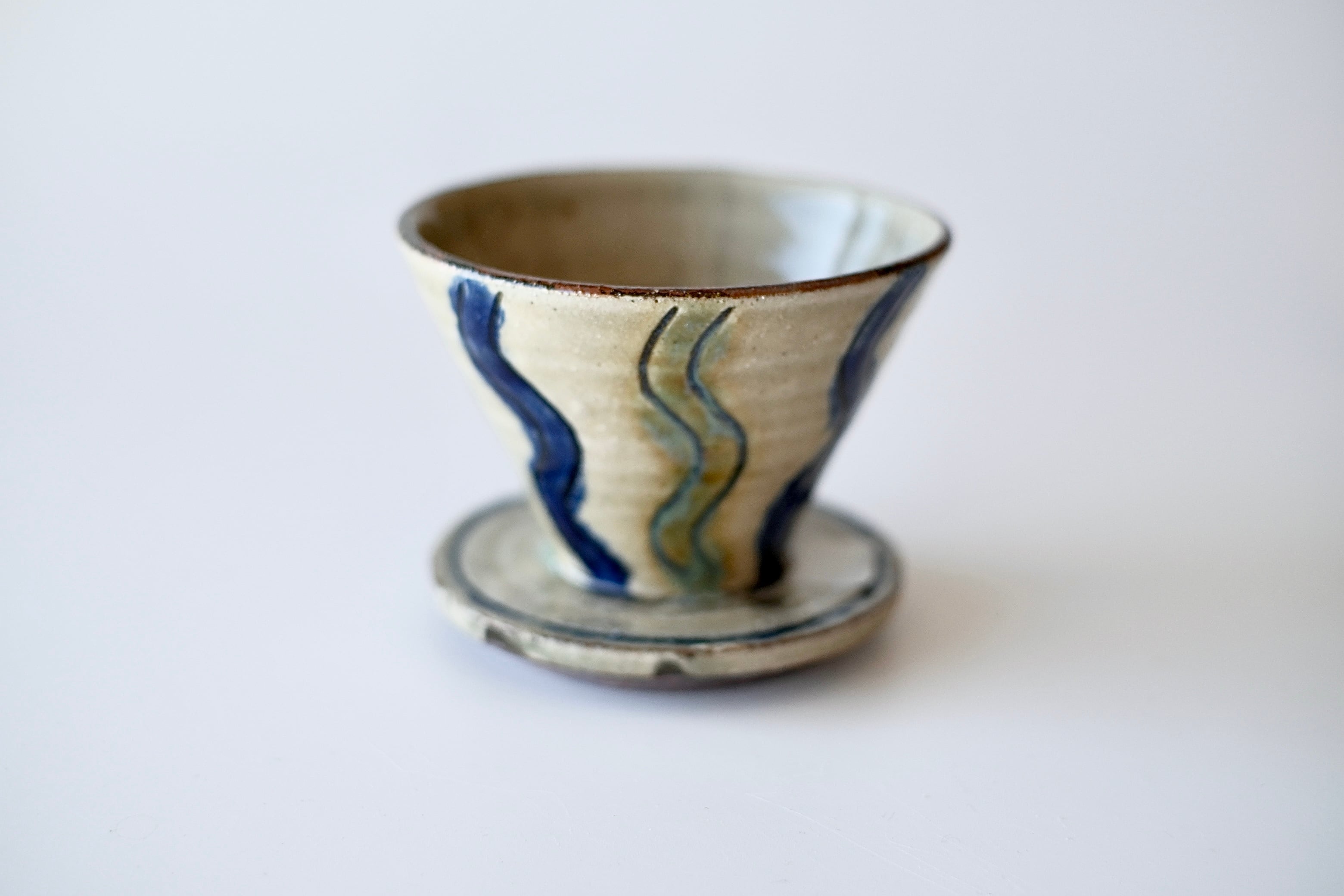 深貝工房さんのドリッパー。コーヒーを淹れるのが楽しくなりそうな、コバルトと緑釉のキザ紋のお品です。