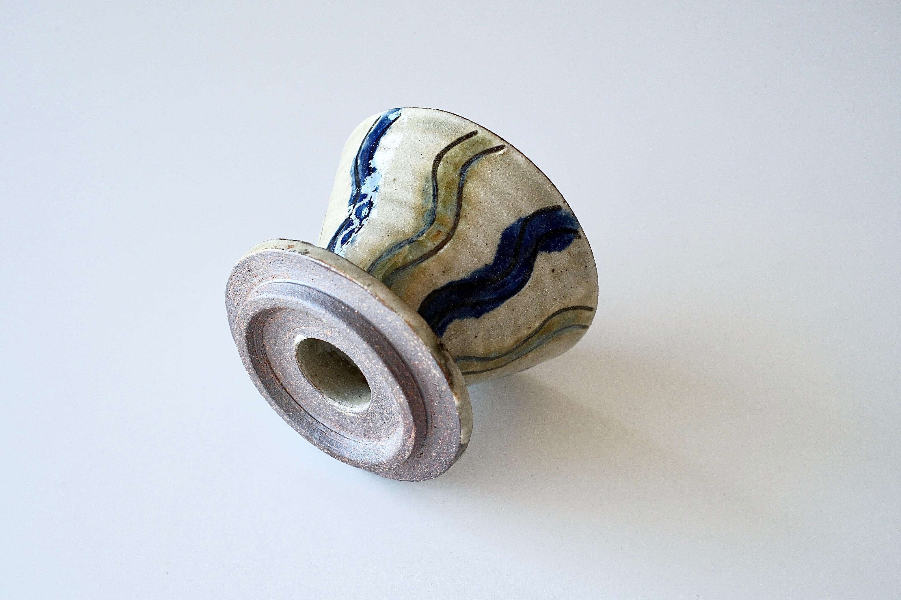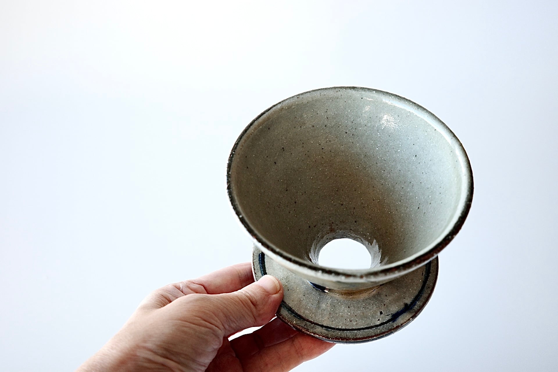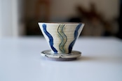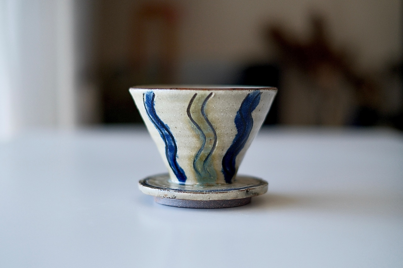 深貝工房さんのドリッパー。コーヒーを淹れるのが楽しくなりそうな、コバルトと緑釉のキザ紋のお品です。