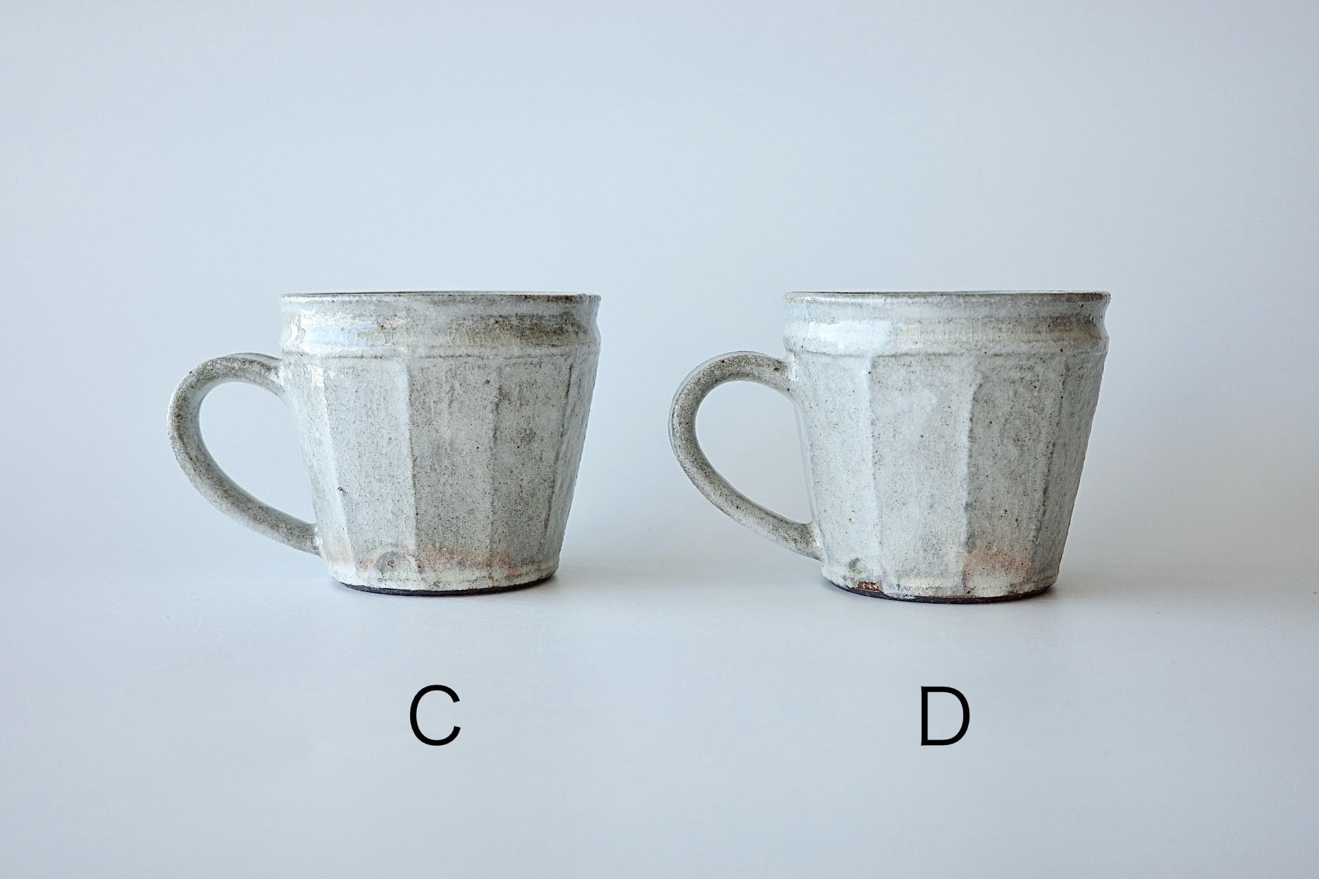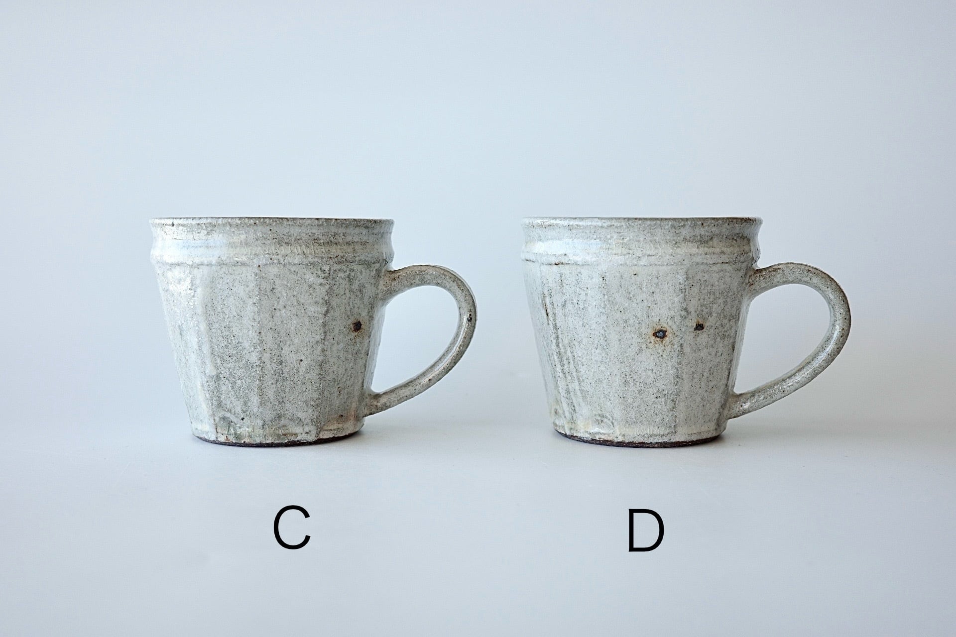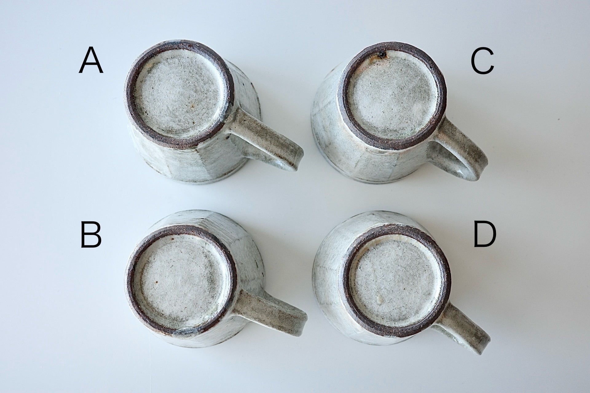 森製陶所さんのマグカップ。グリーンとブルーが混じったような色味が美しく、豊かな土の表情と、灰釉の味わい深い景色が印象的です。それぞれに個性豊かなABCD、4種類からお選びいただけます。