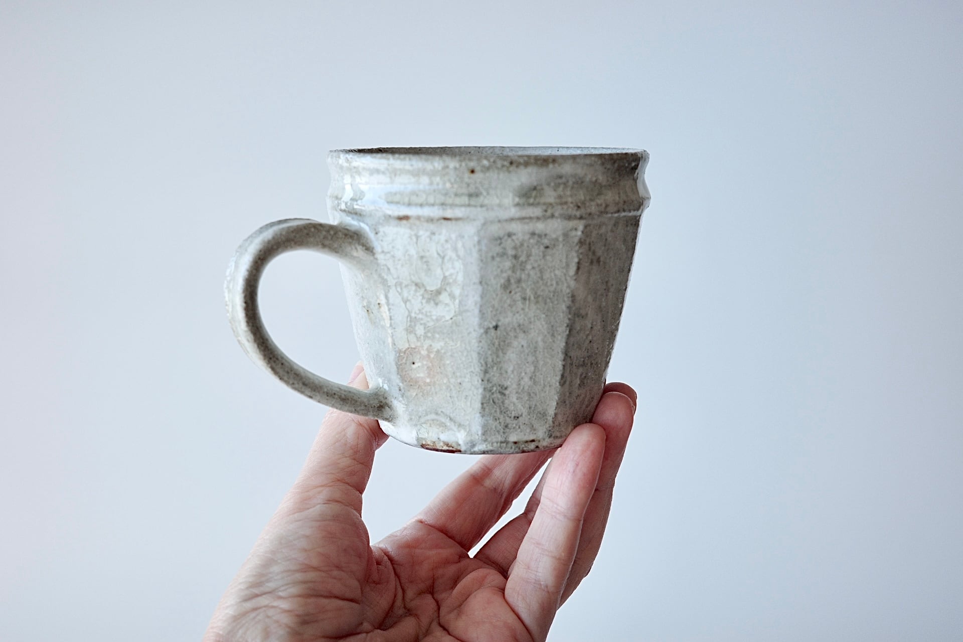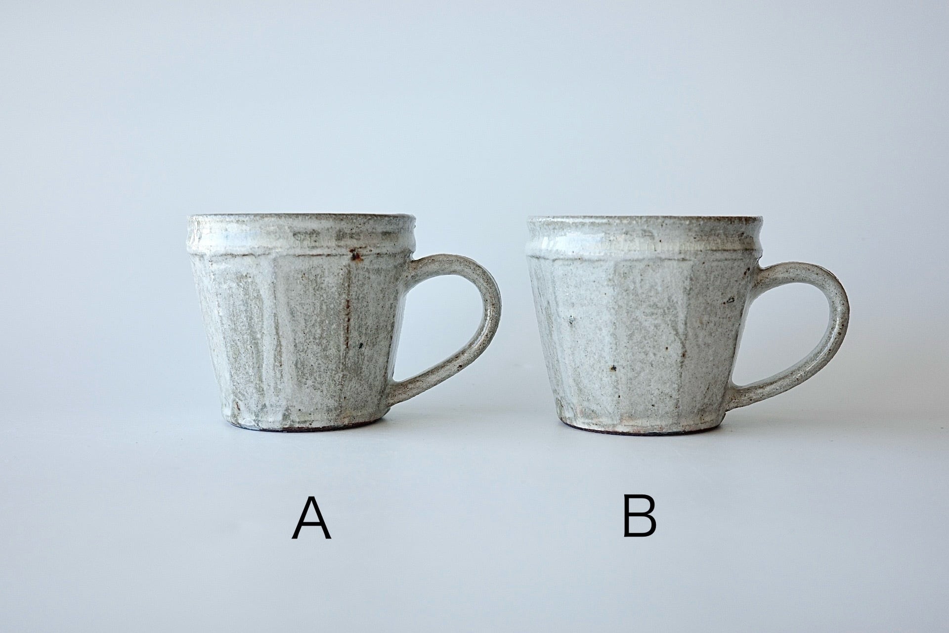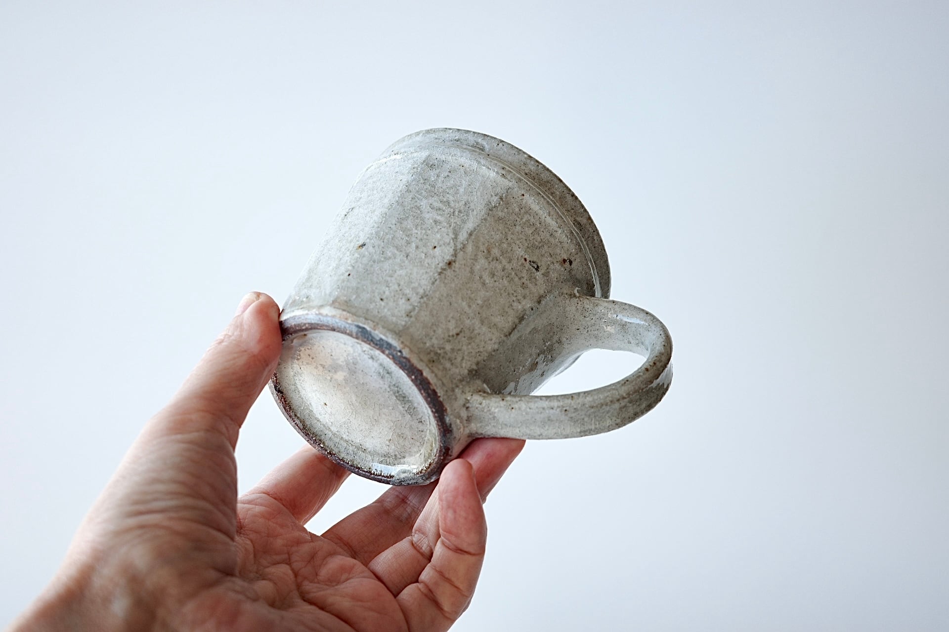 森製陶所さんのマグカップ。グリーンとブルーが混じったような色味が美しく、豊かな土の表情と、灰釉の味わい深い景色が印象的です。それぞれに個性豊かなABCD、4種類からお選びいただけます。