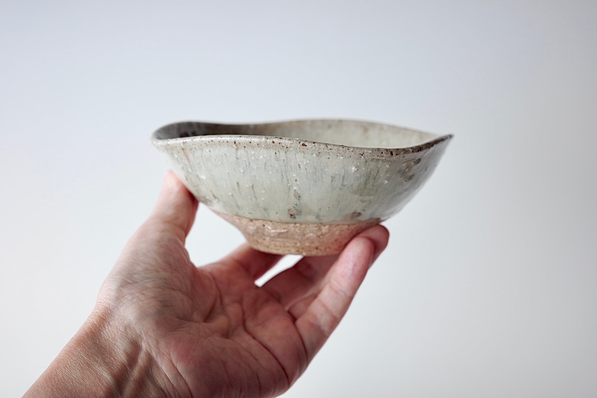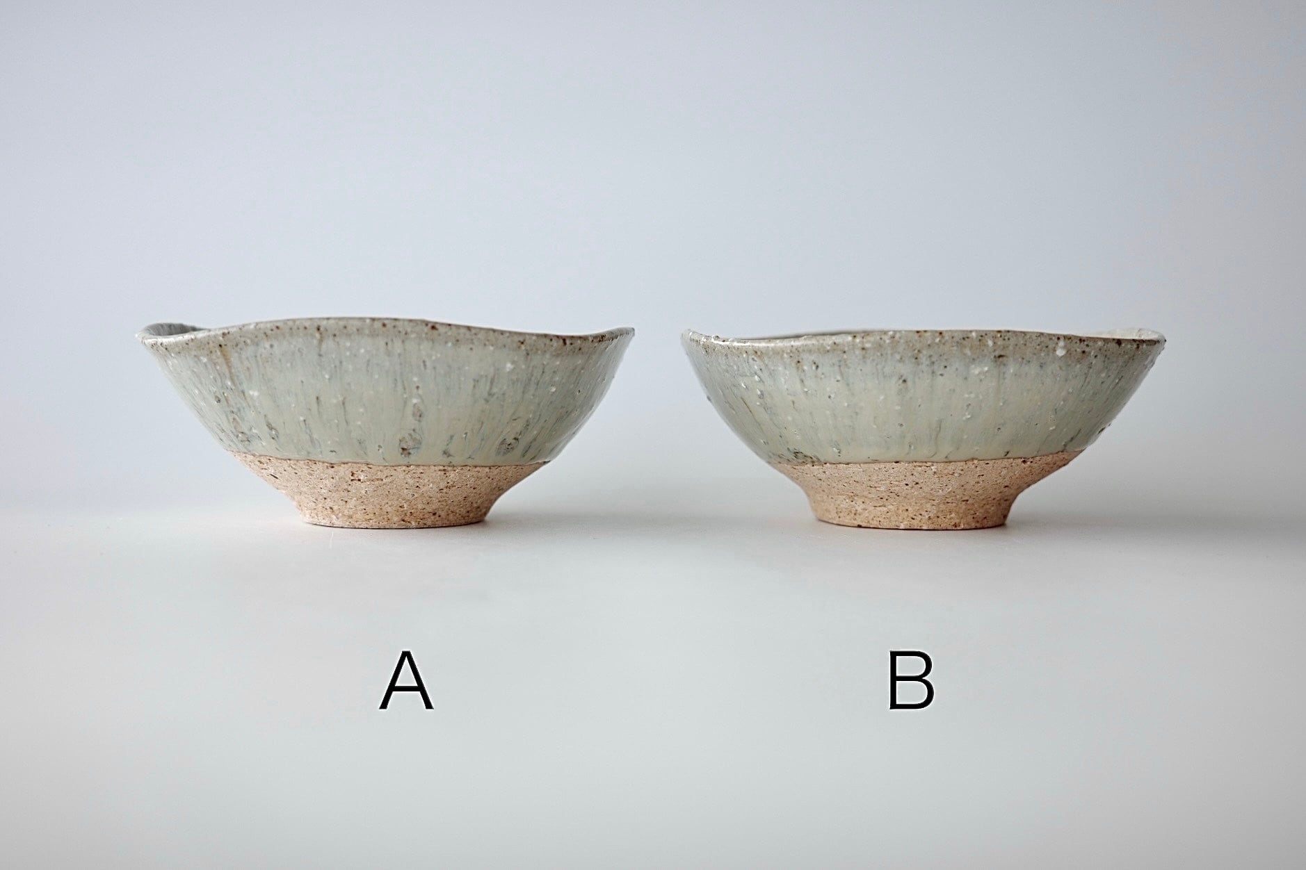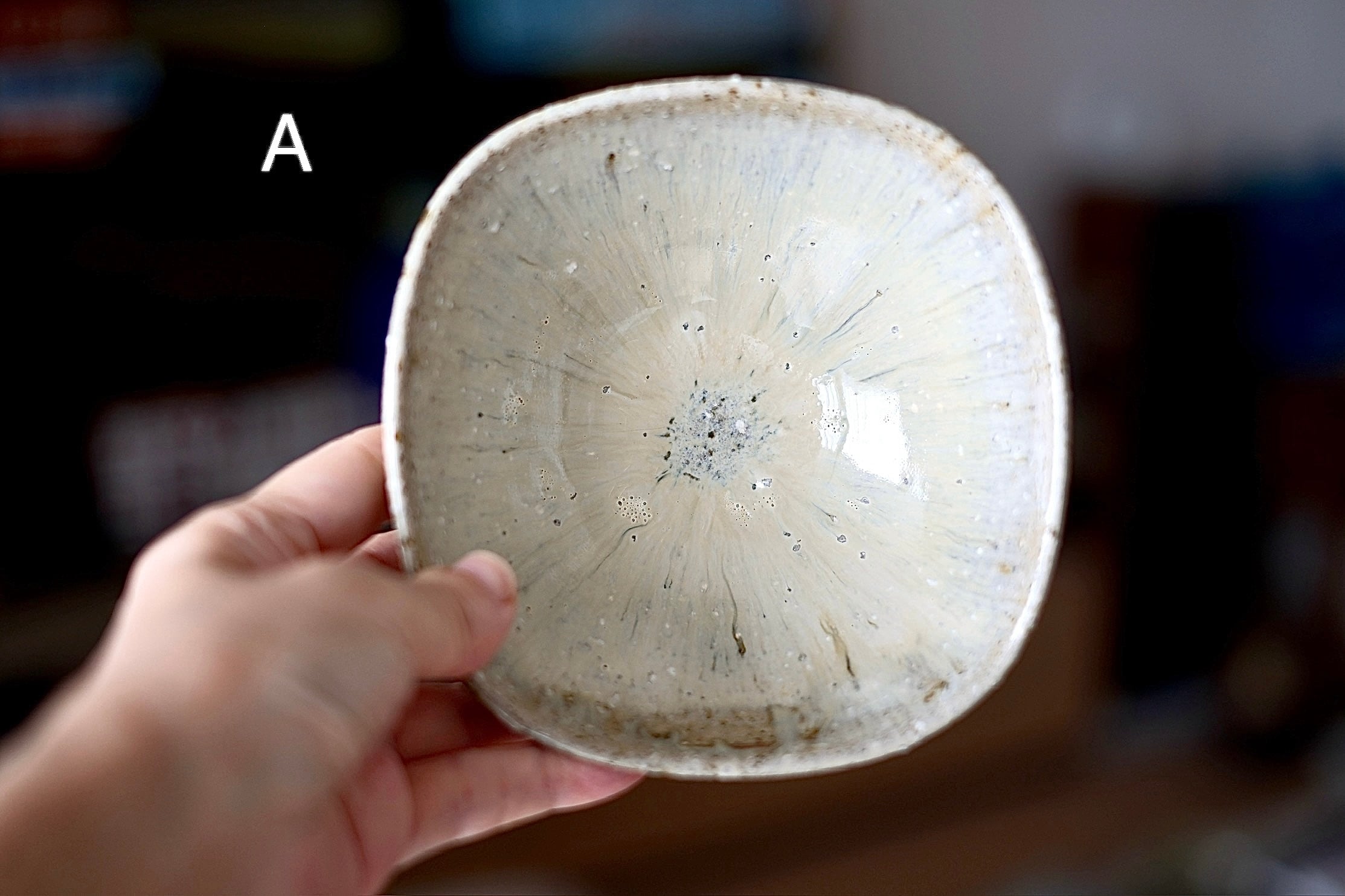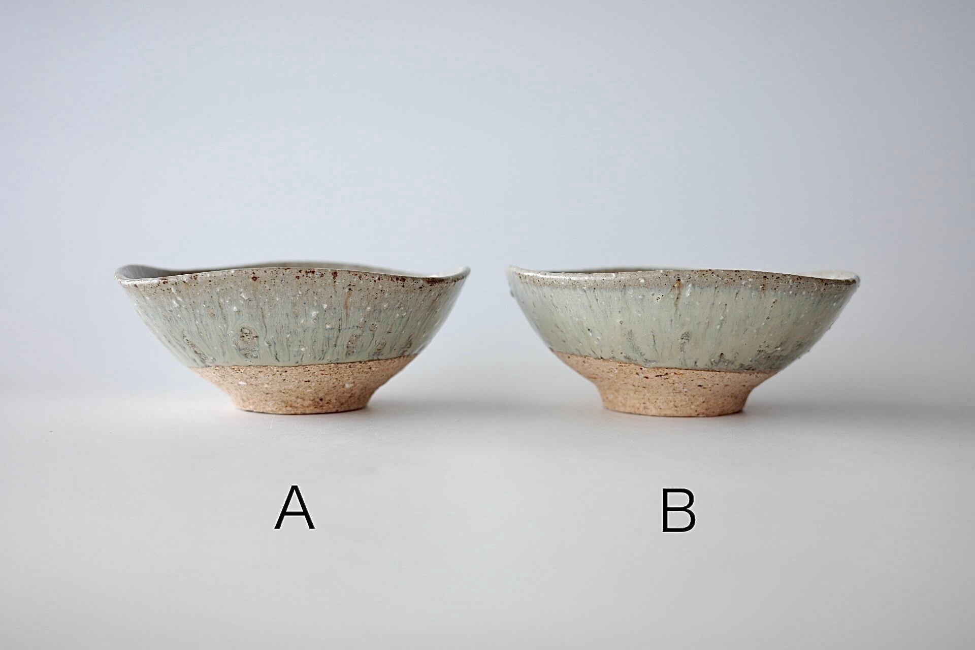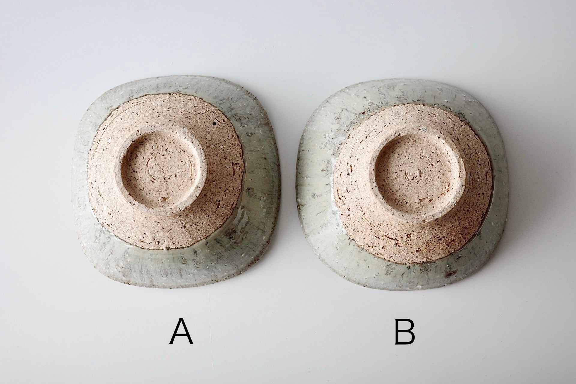 関真奈穂さんの四方鉢4.5寸。使い勝手の良い小鉢です。荒い土の表情と、灰釉の窯変による景色がなんともいえず美しいお品は、たっぷりと掛かった灰釉と、グリーンとブルーがミックスされたような透明感のある色味で、お料理もよく映えます。AB、2種類からお選びいただけます。