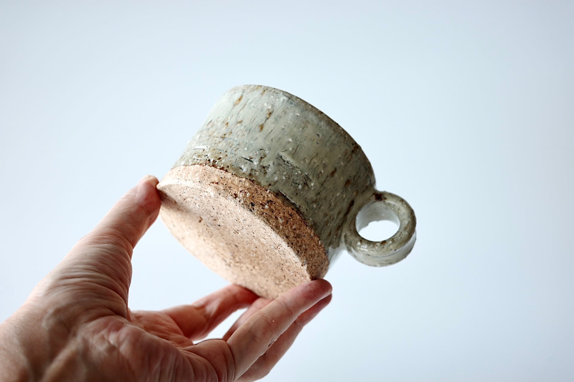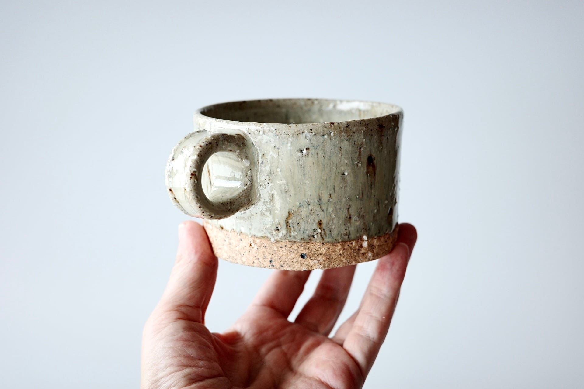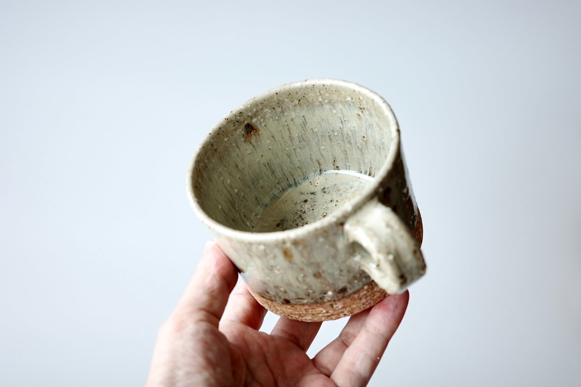 荒い土の表情と、灰釉の窯変による景色が美しく、たっぷりと掛かった灰釉は、グリーンとブルーがミックスされたような透明感のある色味です。