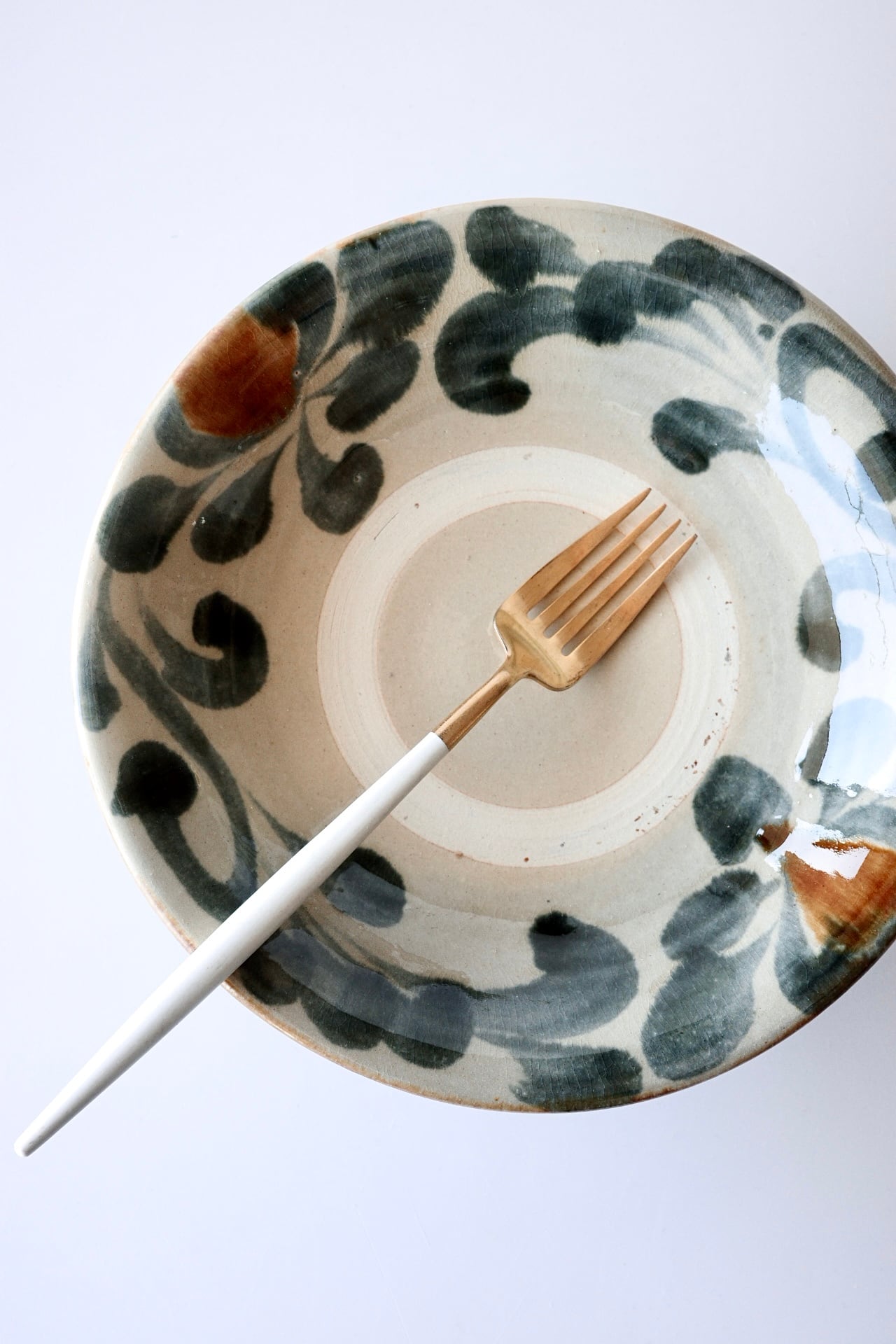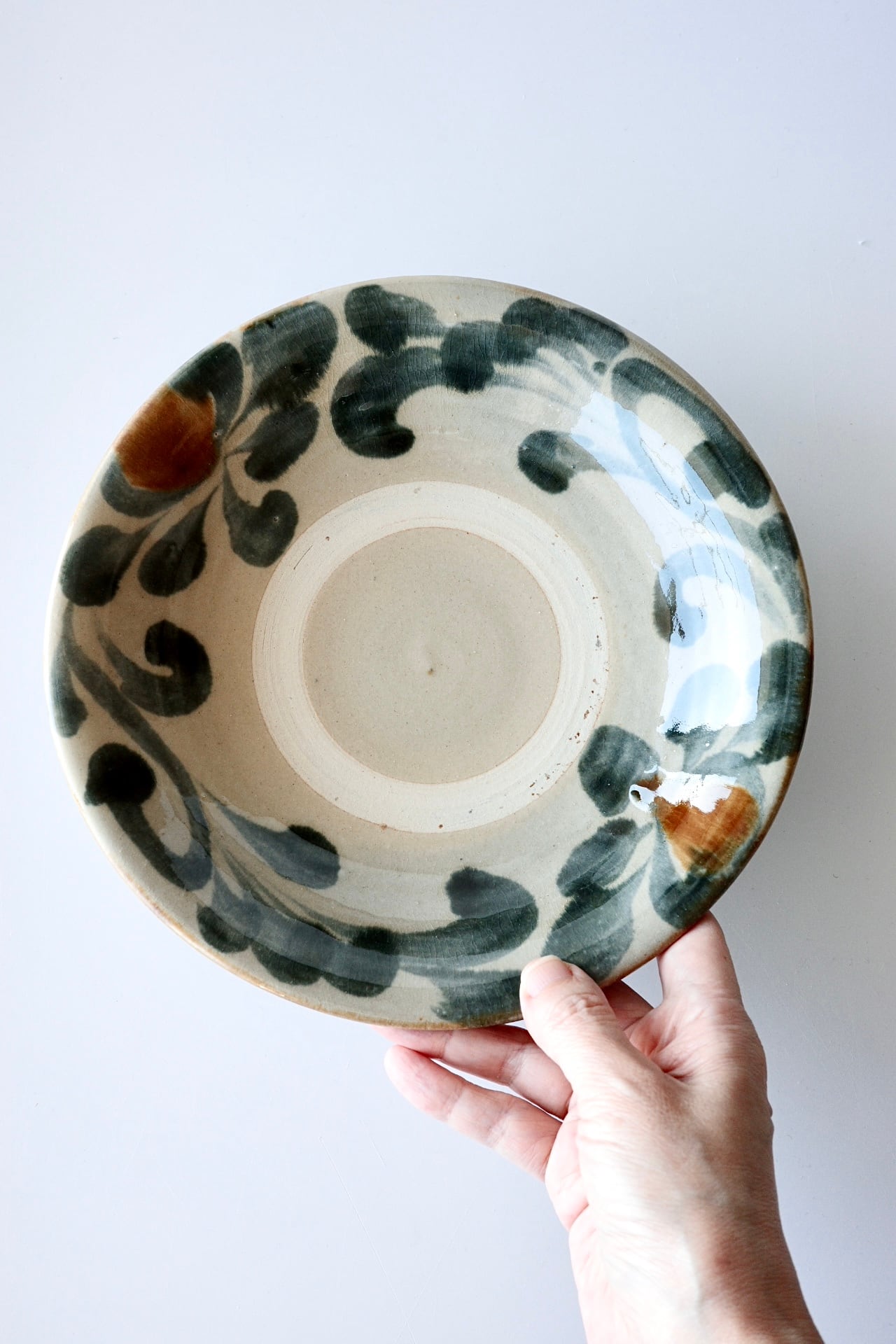 松田健悟さんの7寸皿。パスタなどにぴったりな大きさの高台付き丸皿です。躍動感のある唐草紋が呉須と飴釉で描かれています。