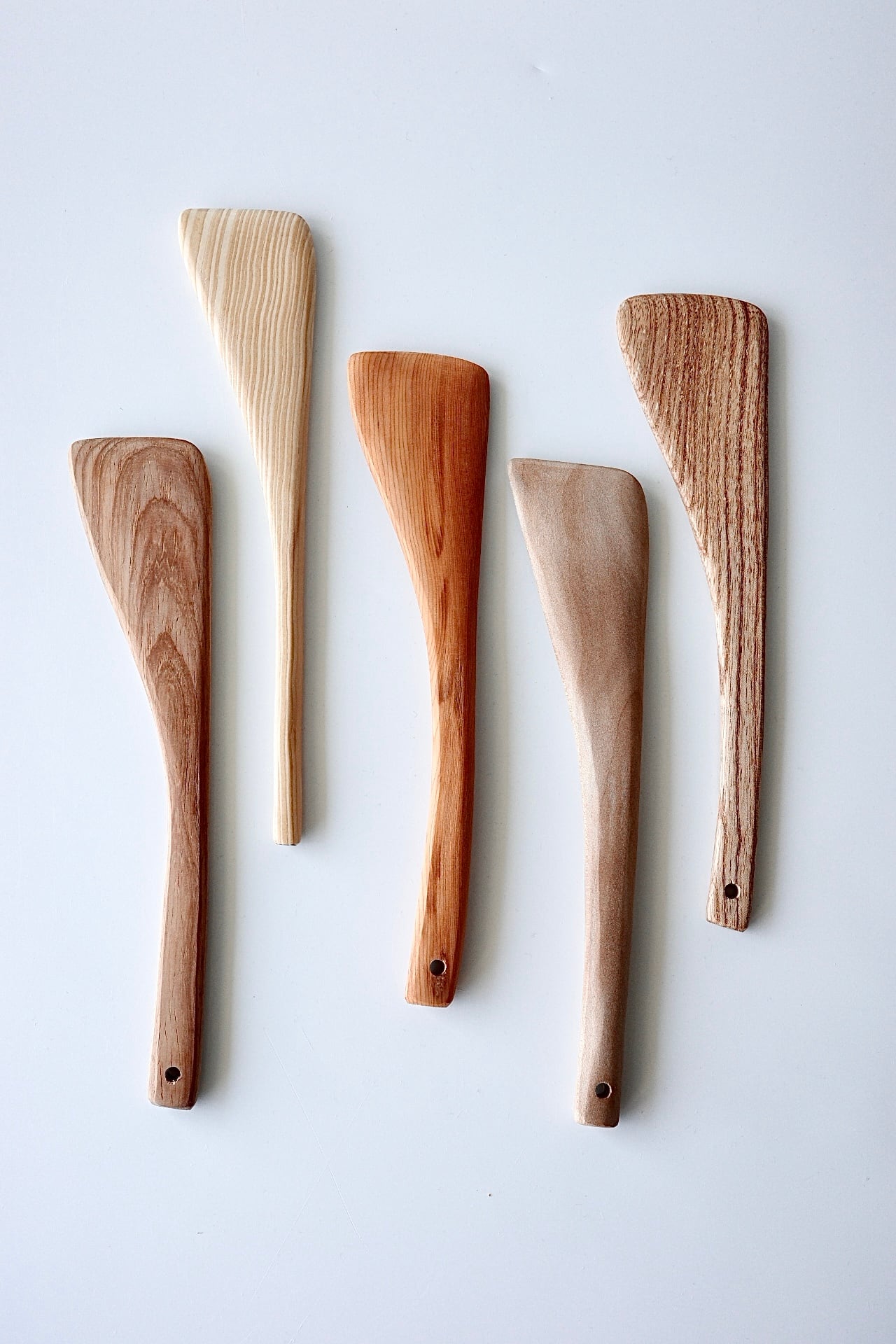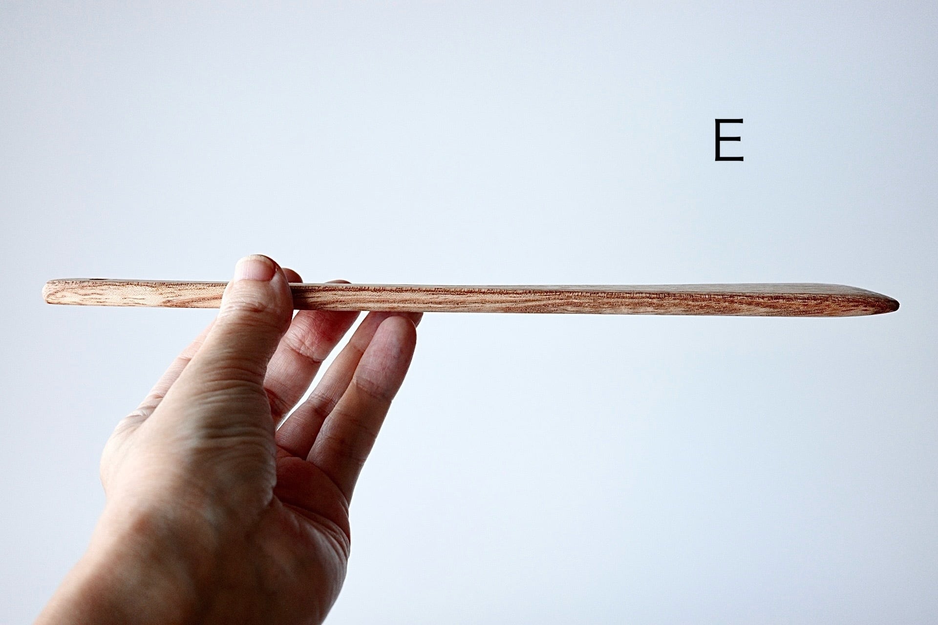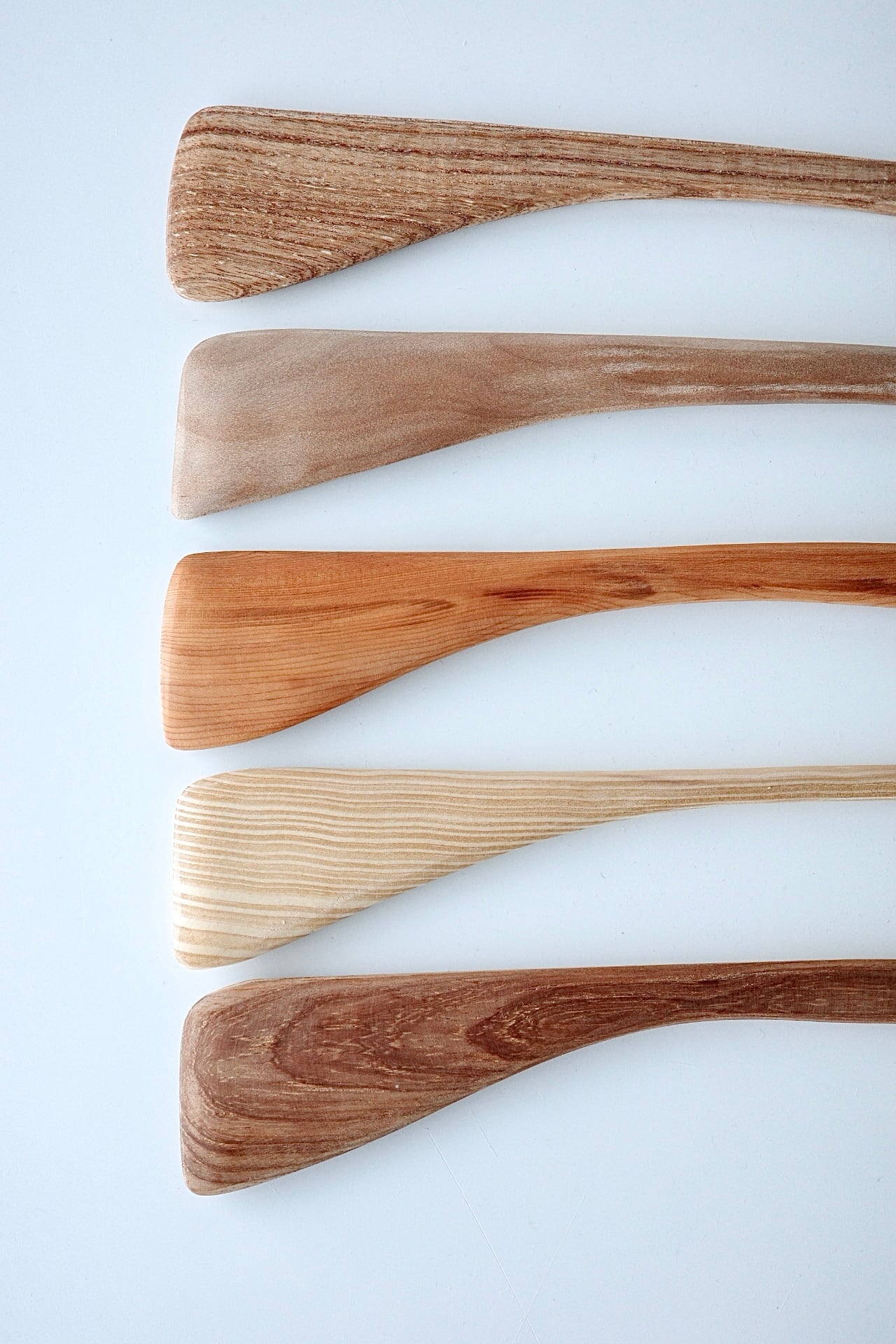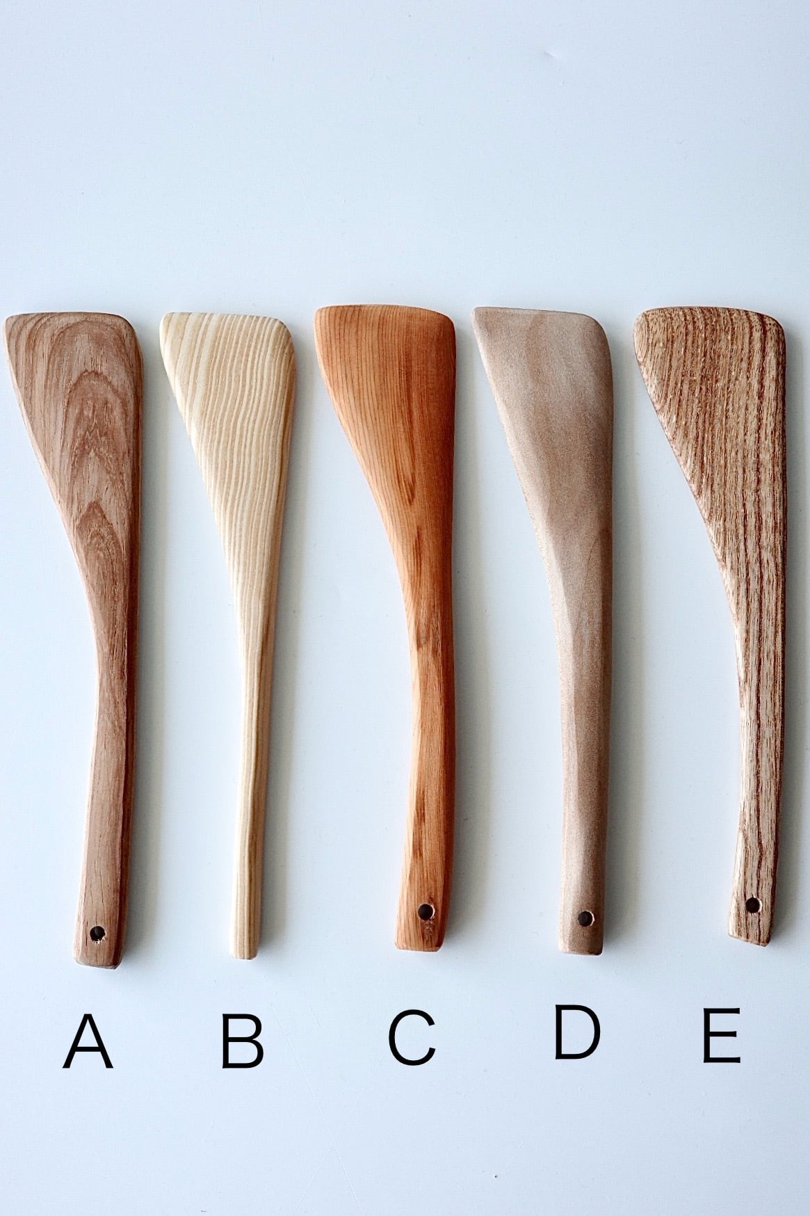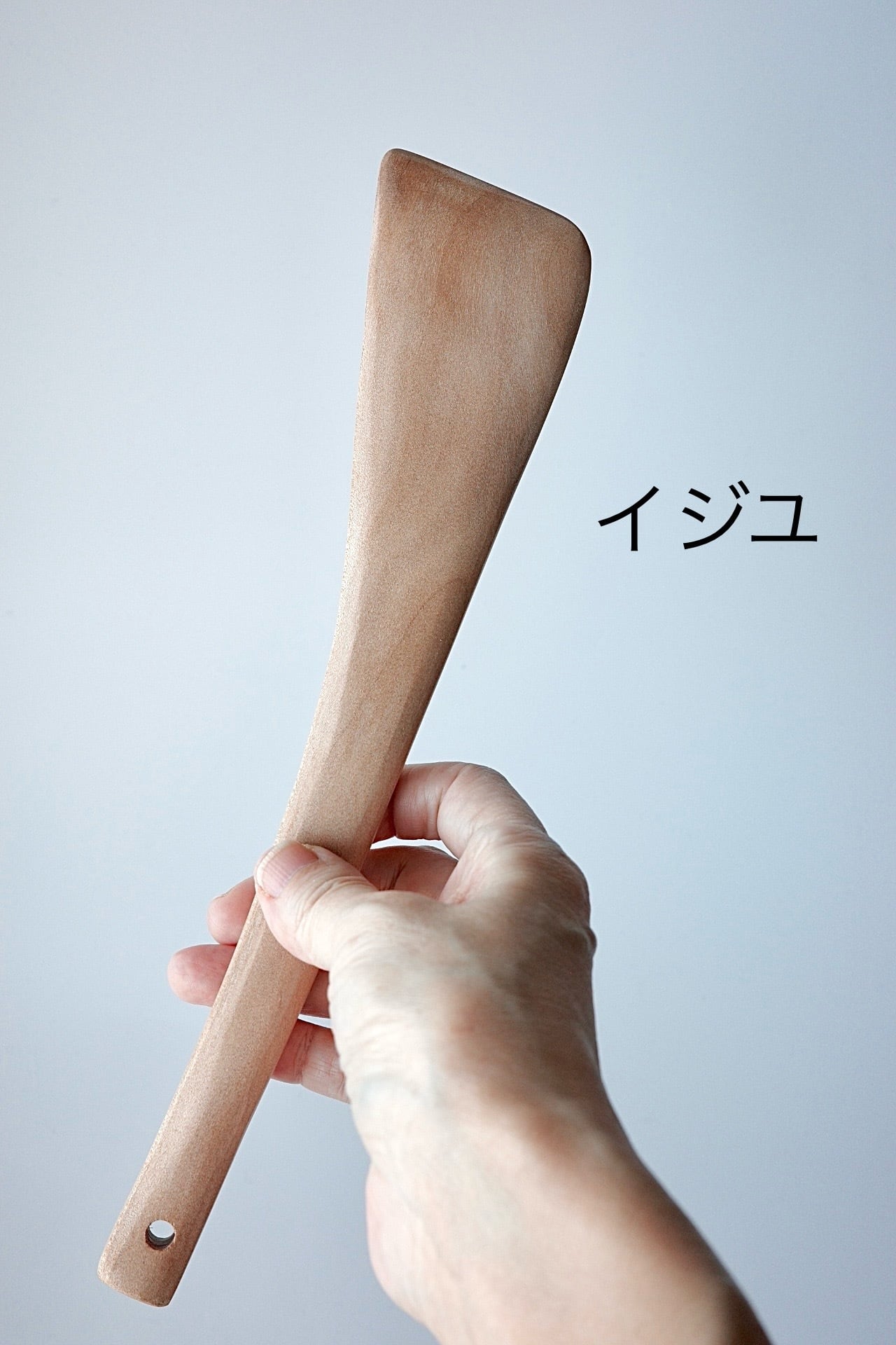 てすさび (シオタニミカ) さんの木べら。シオタニさんの作る木べらは、大変使いやすいと飲食関係の方や料理好きの方々に大評判で、ご紹介するたびに、目指して来てくださる方が多くいらっしゃいます。