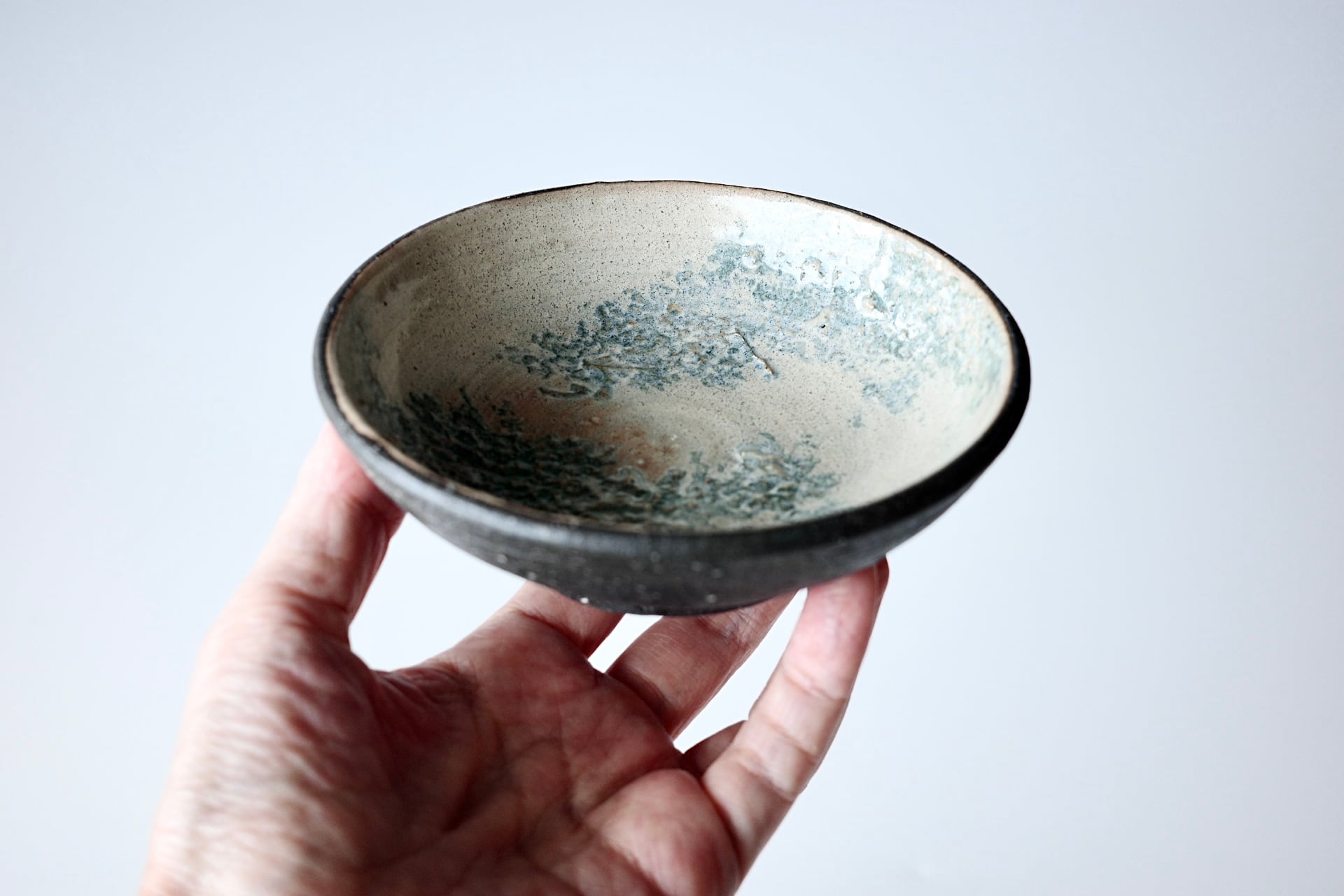 まるか陶工房さんの4寸鉢。小鉢としても、鍋物の取り皿としても、絶妙なサイズ感でさまざまに使える大変おすすめのお品です。こちらは黒御影土で作られています。AB、2種類からお選びいただけます。