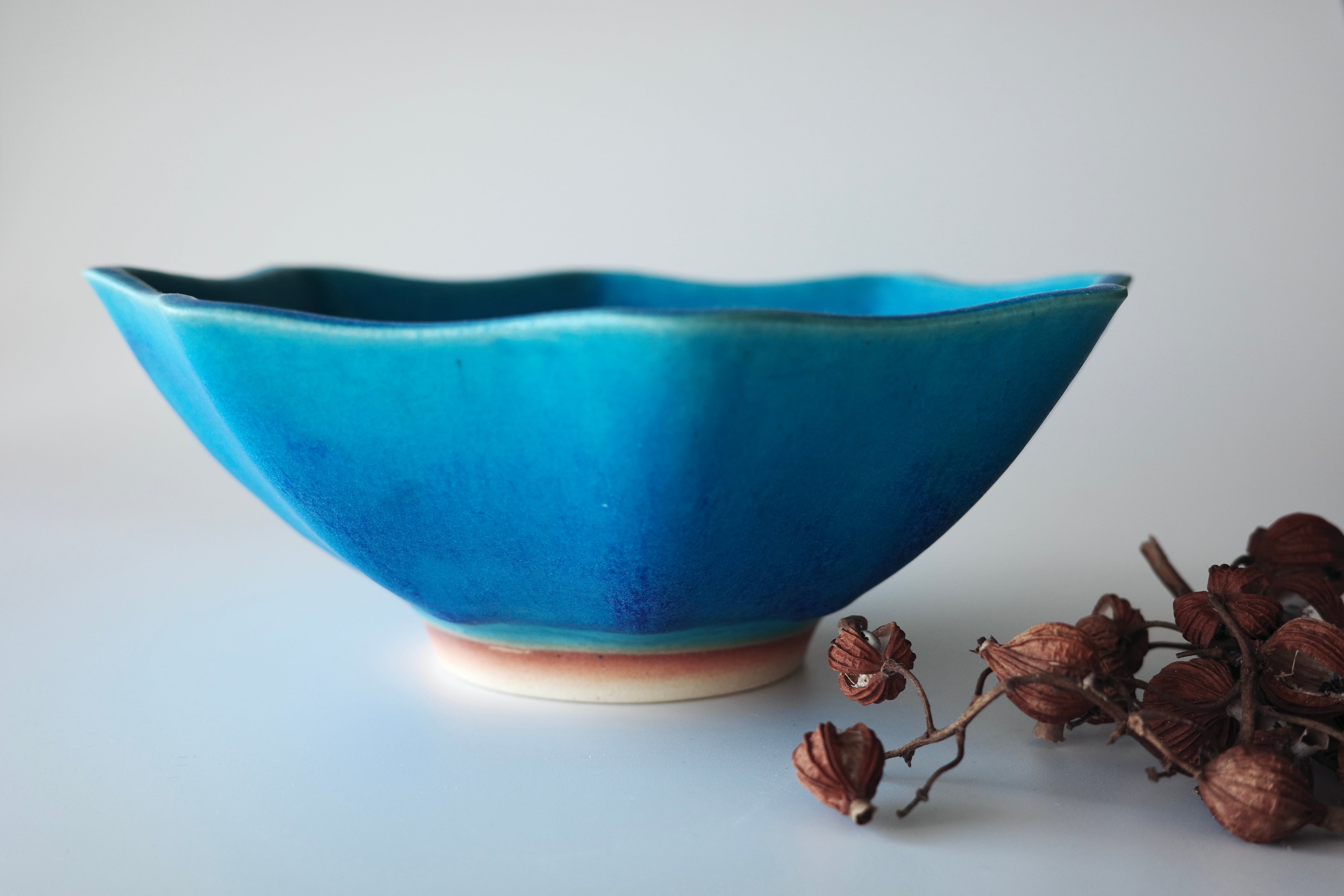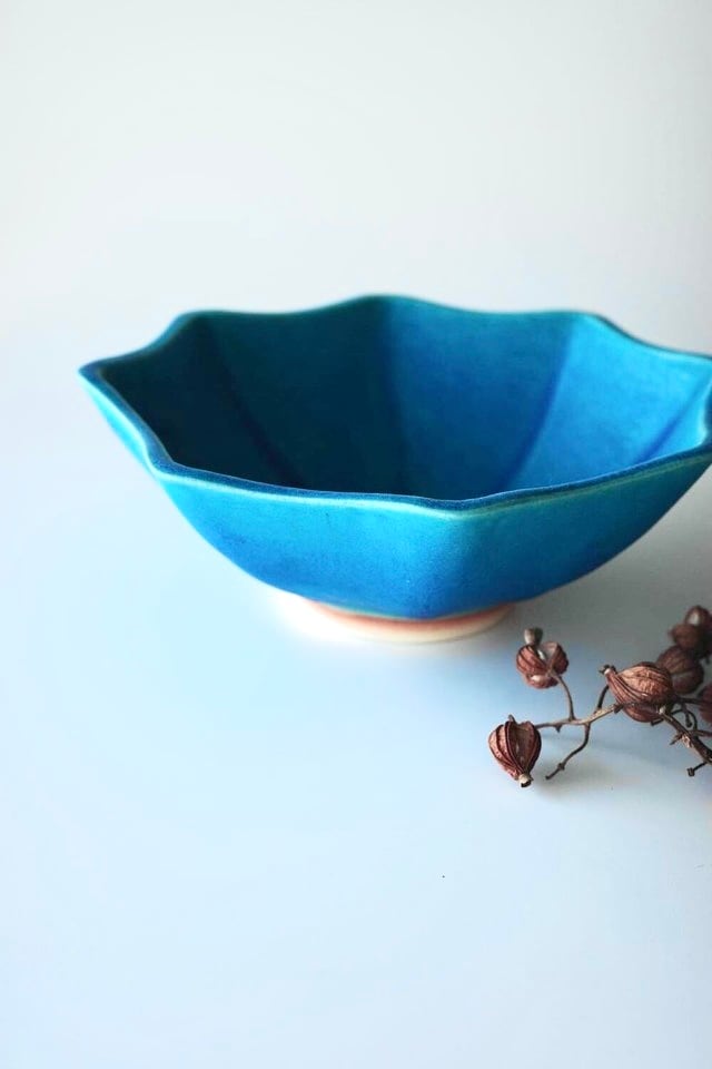 大嶺工房さんの青釉八角鉢。沖縄の海を思わせるブルーがとても美しい、八角形の優雅なフォルムのお品です。深さがあるので、たっぷり盛り付けることができます。