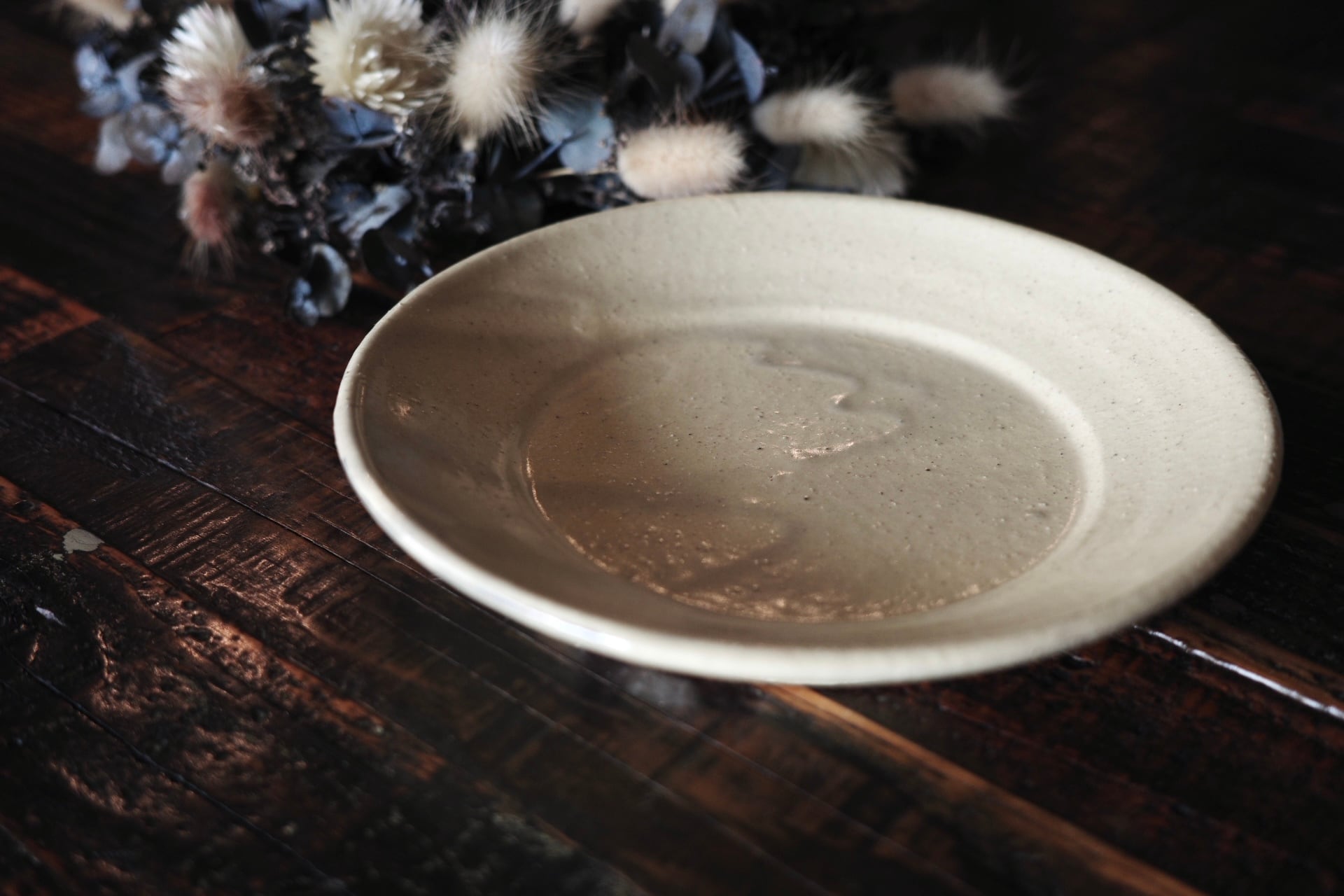 深貝工房さんの登り6寸リム皿。登り窯で焚かれたお品です。こちらは化粧土のタイプ。薪火のパワーで釉薬がダイナミックに流れ、印象的な景色が生まれています。