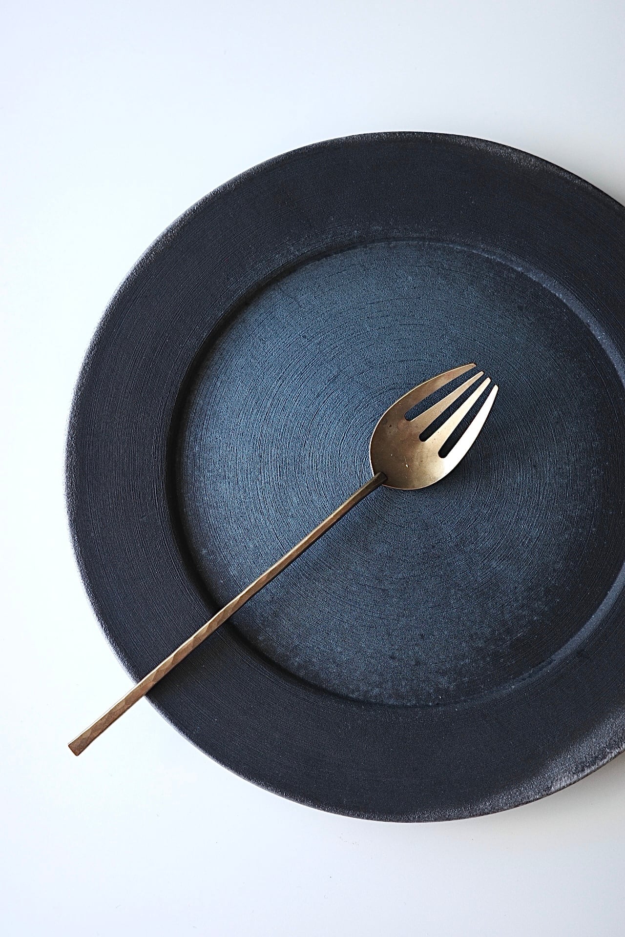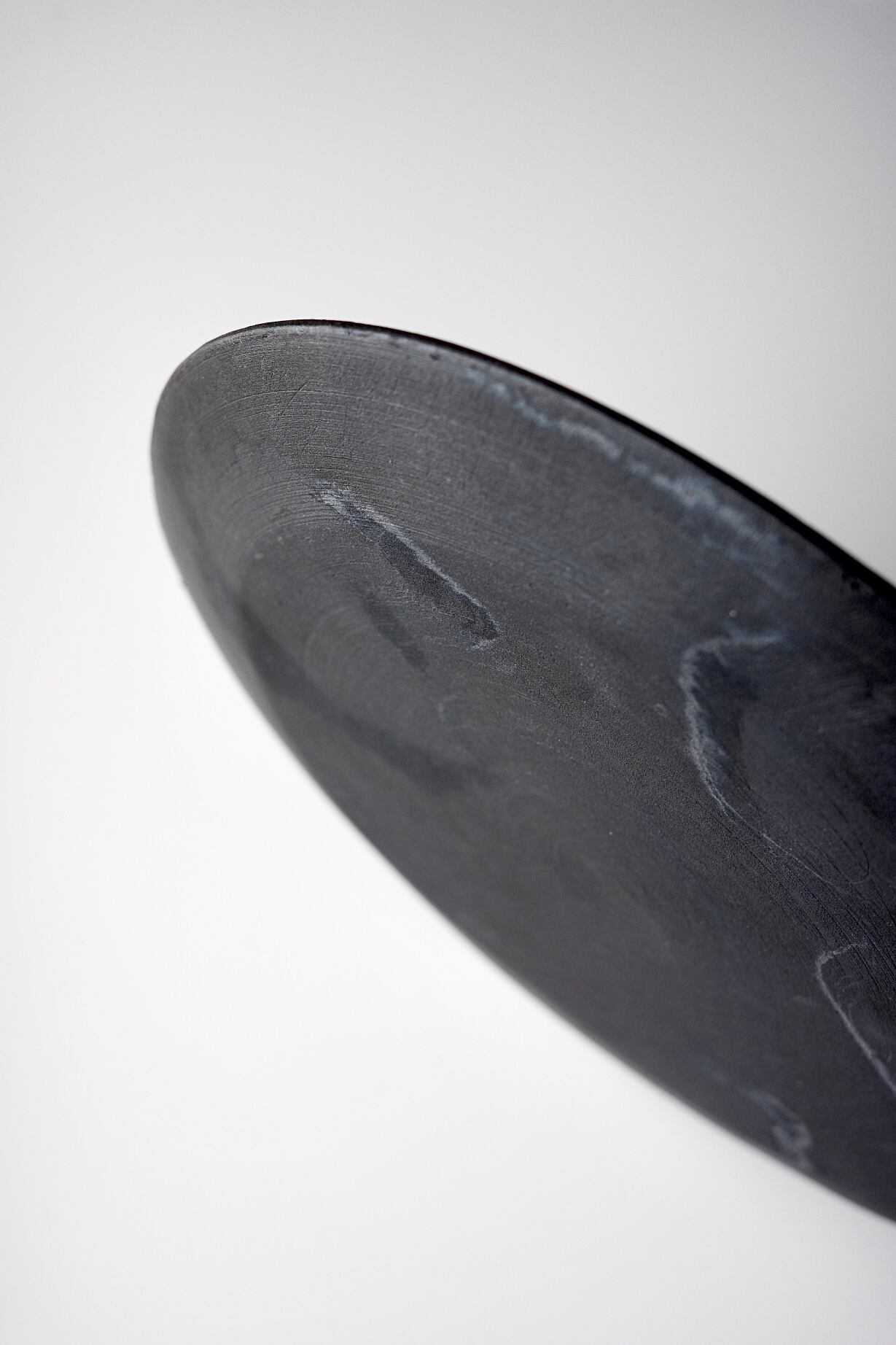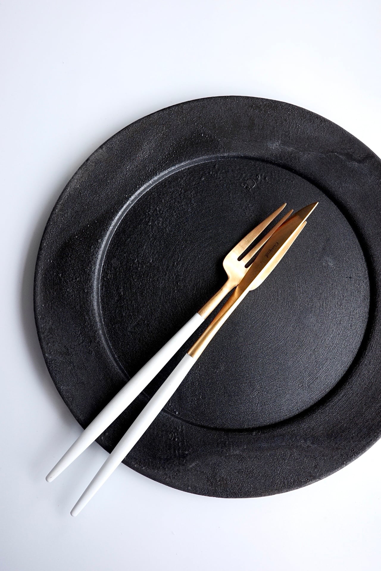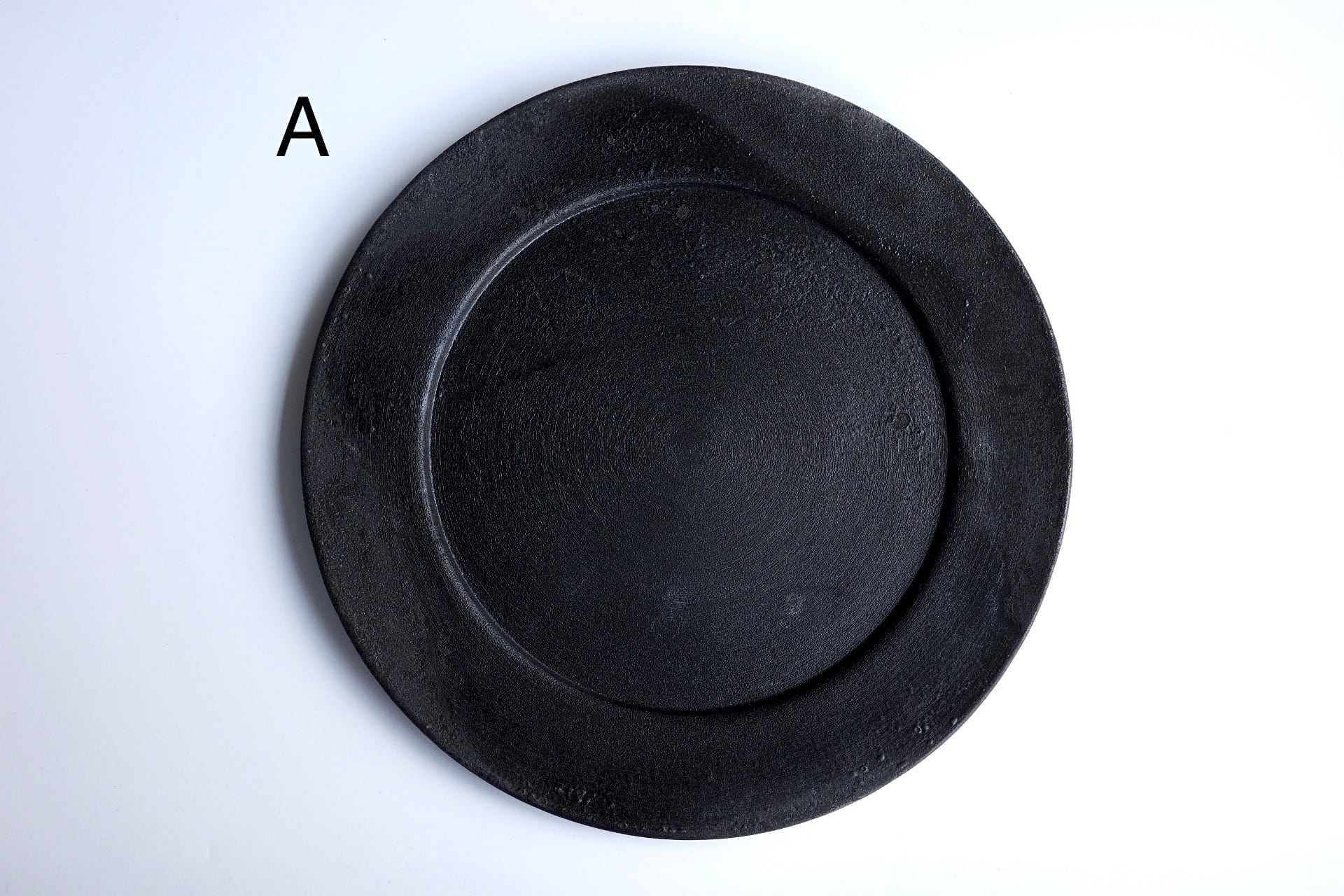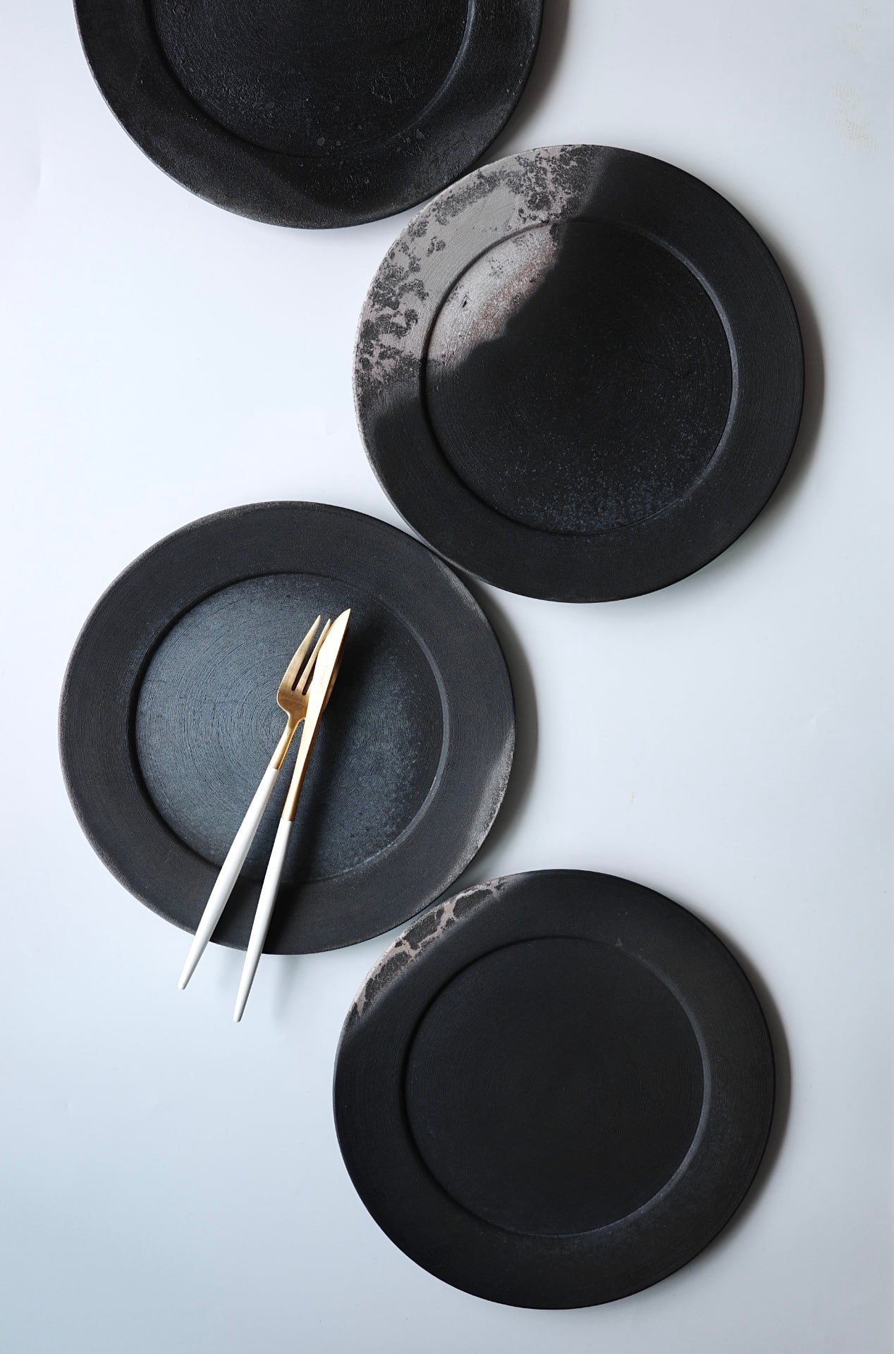 山本憲卓さんの炭化シリーズのリム皿(中)。お料理がよく映える黒のプレートです。同じ黒でも、青みがかったもの、マットなもの、艶のあるもの、一枚一枚の色みや景色が全く異なります。個性豊かな黒のプレートをお探しの方に。