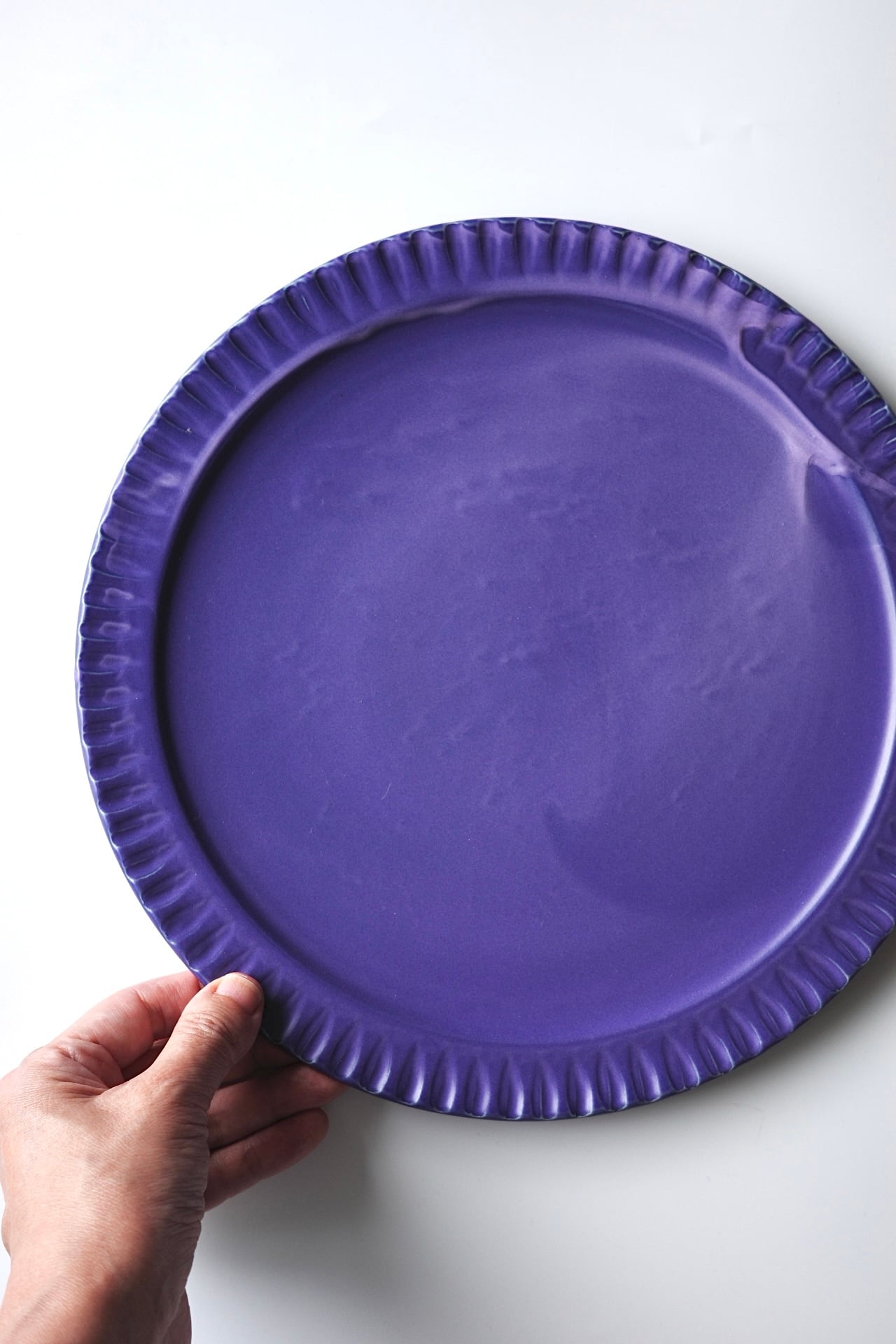 茜陶房さんのリムプレートL kikyo。美しい桔梗色の存在感ある9寸サイズのプレートです。使い勝手の良いSサイズとのセット使いもおすすめ。AB、2種類からお選びいただけます。